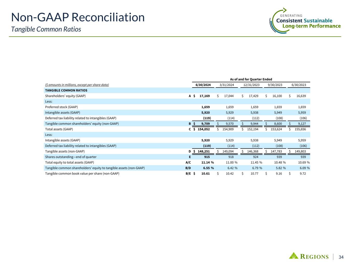 34 As of and for Quarter Ended ($ amounts in millions, except per share data) 6/30/2024 3/31/2024 12/31/2023 9/30/2023 6/30/2023 TANGIBLE COMMON RATIOS Shareholders’ equity (GAAP) A $ 17,169 $ 17,044 $ 17,429 $ 16,100 $ 16,639 Less: Preferred stock (GAAP) 1,659 1,659 1,659 1,659 1,659 Intangible assets (GAAP) 5,920 5,929 5,938 5,949 5,959 Deferred tax liability related to intangibles (GAAP) (119) (114) (112) (108) (106) Tangible common shareholders’ equity (non-GAAP) B $ 9,709 $ 9,570 $ 9,944 $ 8,600 $ 9,127 Total assets (GAAP) C $ 154,052 $ 154,909 $ 152,194 $ 153,624 $ 155,656 Less: Intangible assets (GAAP) 5,920 5,929 5,938 5,949 5,959 Deferred tax liability related to intangibles (GAAP) (119) (114) (112) (108) (106) Tangible assets (non-GAAP) D $ 148,251 $ 149,094 $ 146,368 $ 147,783 $ 149,803 Shares outstanding—end of quarter E 915 918 924 939 939 Total equity to total assets (GAAP) A/C 11.14 % 11.00 % 11.45 % 10.48 % 10.69 % Tangible common shareholders’ equity to tangible assets (non-GAAP) B/D 6.55 % 6.42 % 6.79 % 5.82 % 6.09 % Tangible common book value per share (non-GAAP) B/E $ 10.61 $ 10.42 $ 10.77 $ 9.16 $ 9.72 Non-GAAP Reconciliation Tangible Common Ratios