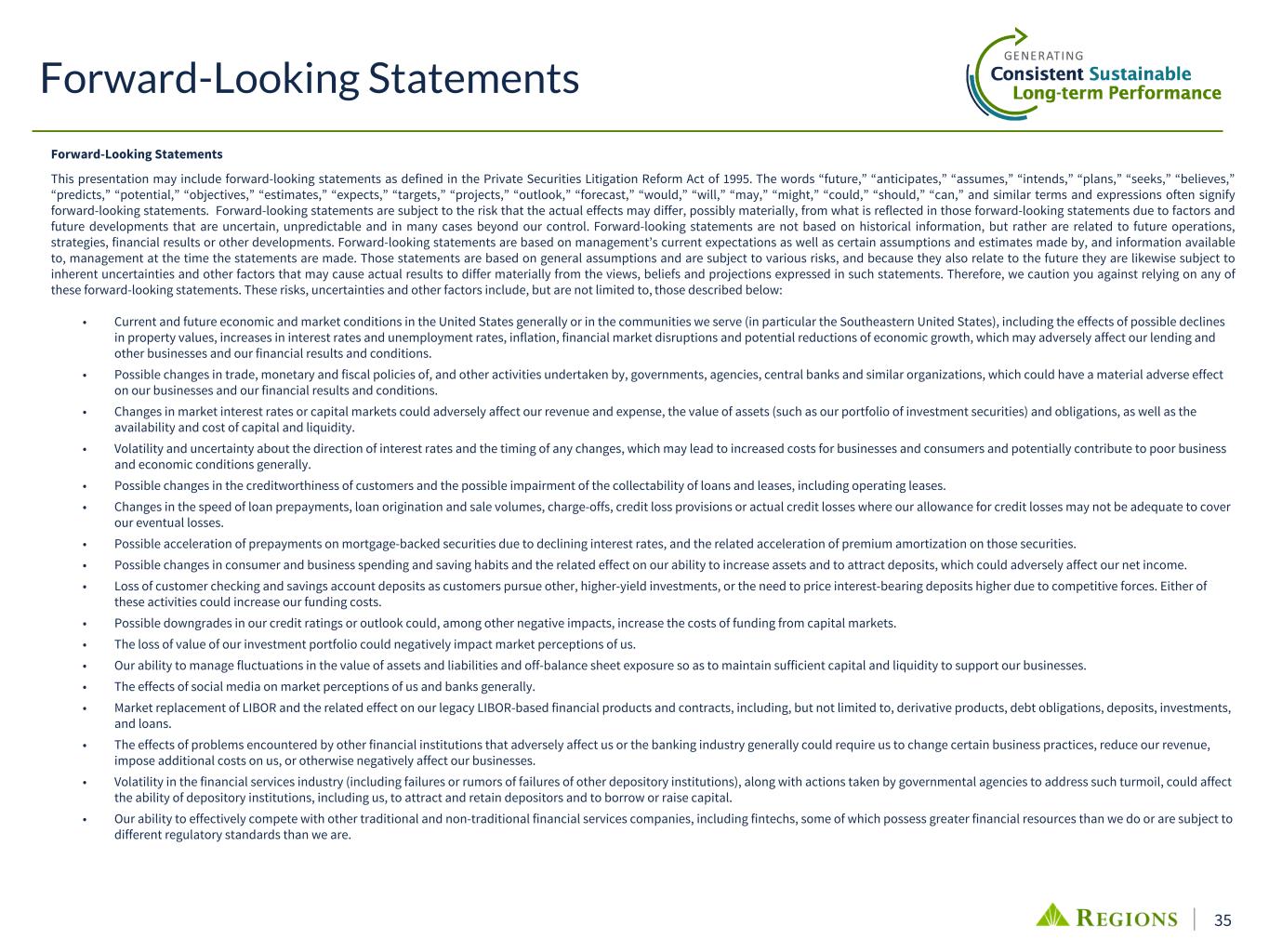 37 • Our ability to comply with stress testing and capital planning requirements (as part of the CCAR process or otherwise) may continue to require a significant investment of our managerial resources due to the importance of such tests and requirements. • Our ability to comply with applicable capital and liquidity requirements (including, among other things, the Basel III capital standards), including our ability to generate capital internally or raise capital on favorable terms, and if we fail to meet requirements, our financial condition and market perceptions of us could be negatively impacted. • Our ability to recruit and retain talented and experienced personnel to assist in the development, management and operation of our products and services may be affected by changes in laws and regulations in effect from time to time. • Our ability to receive dividends from our subsidiaries, in particular Regions Bank, could affect our liquidity and ability to pay dividends to shareholders. • Fluctuations in the price of our common stock and inability to complete stock repurchases in the time frame and/or on the terms anticipated. • The effects of anti-takeover laws and exclusive forum provision in our certificate of incorporation and bylaws. • The effect of new tax legislation and/or interpretation of existing tax law, which may impact our earnings, capital ratios and our ability to return capital to shareholders. • Changes in accounting policies or procedures as may be required by the FASB or other regulatory agencies could materially affect our financial statements and how we report those results, and expectations and preliminary analyses relating to how such changes will affect our financial results could prove incorrect. • Any impairment of our goodwill or other intangibles, any repricing of assets or any adjustment of valuation allowances on our deferred tax assets due to changes in tax law, adverse changes in the economic environment declining operations of the reporting unit or other factors. • The effects of man-made and natural disasters, including fires, floods, droughts, tornadoes, hurricanes and environmental damage (especially in the Southeastern United States), which may negatively affect our operations and/or our loan portfolios and increase our cost of conducting business. The severity and frequency of future earthquakes, fires, hurricanes, tornadoes, droughts, floods and other weather-related events are difficult to predict and may be exacerbated by global climate change. • The impact of pandemics on our businesses, operations and financial results and conditions. The duration and severity of any pandemic as well as government actions or other restrictions in connection with such events could disrupt the global economy, adversely affect our capital and liquidity position, impair the ability of borrowers to repay outstanding loans and increase our allowance for credit losses, impair collateral values and result in lost revenue or additional expenses. • The effects of any damage to our reputation resulting from developments related to any of the items identified above. • Other risks identified from time to time in reports that we file with the SEC. The foregoing list of factors is not exhaustive. For discussion of these and other factors that may cause actual results to differ from expectations, look under the captions “Forward-Looking Statements” and “Risk Factors” in Regions’ Annual Report on Form 10-K for the year ended December 31, 2023 and in Regions’ subsequent filings with the SEC. You should not place undue reliance on any forward-looking statements, which speak only as of the date made. Factors or events that could cause our actual results to differ may emerge from time to time, and it is not possible to predict all of them. We assume no obligation and do not intend to update or revise any forward-looking statements that are made from time to time, either as a result of future developments, new information or otherwise, except as may be required by law. Regions’ Investor Relations contact is Dana Nolan at (205) 264-7040; Regions’ Media contact is Jeremy King at (205) 264-4551. Forward-Looking Statements (continued)