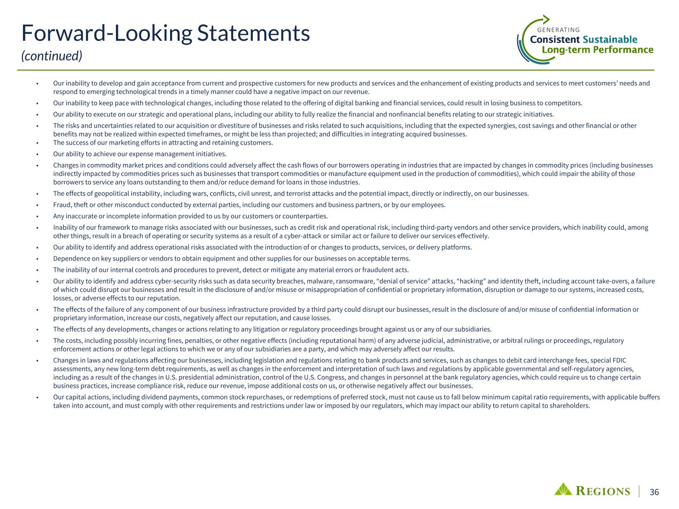 35 Forward-Looking Statements This presentation may include forward-looking statements as defined in the Private Securities Litigation Reform Act of 1995. The words “future,” “anticipates,” “assumes,” “intends,” “plans,” “seeks,” “believes,” “predicts,” “potential,” “objectives,” “estimates,” “expects,” “targets,” “projects,” “outlook,” “forecast,” “would,” “will,” “may,” “might,” “could,” “should,” “can,” and similar terms and expressions often signify forward-looking statements. Forward-looking statements are subject to the risk that the actual effects may differ, possibly materially, from what is reflected in those forward-looking statements due to factors and future developments that are uncertain, unpredictable and in many cases beyond our control. Forward-looking statements are not based on historical information, but rather are related to future operations, strategies, financial results or other developments. Forward-looking statements are based on management’s current expectations as well as certain assumptions and estimates made by, and information available to, management at the time the statements are made. Those statements are based on general assumptions and are subject to various risks, and because they also relate to the future they are likewise subject to inherent uncertainties and other factors that may cause actual results to differ materially from the views, beliefs and projections expressed in such statements. Therefore, we caution you against relying on any of these forward-looking statements. These risks, uncertainties and other factors include, but are not limited to, those described below: • Current and future economic and market conditions in the United States generally or in the communities we serve (in particular the Southeastern United States), including the effects of possible declines in property values, increases in interest rates and unemployment rates, inflation, financial market disruptions and potential reductions of economic growth, which may adversely affect our lending and other businesses and our financial results and conditions. • Possible changes in trade, monetary and fiscal policies of, and other activities undertaken by, governments, agencies, central banks and similar organizations, which could have a material adverse effect on our businesses and our financial results and conditions. • Changes in market interest rates or capital markets could adversely affect our revenue and expense, the value of assets (such as our portfolio of investment securities) and obligations, as well as the availability and cost of capital and liquidity. • Volatility and uncertainty about the direction of interest rates and the timing of any changes, which may lead to increased costs for businesses and consumers and potentially contribute to poor business and economic conditions generally. • Possible changes in the creditworthiness of customers and the possible impairment of the collectability of loans and leases, including operating leases. • Changes in the speed of loan prepayments, loan origination and sale volumes, charge-offs, credit loss provisions or actual credit losses where our allowance for credit losses may not be adequate to cover our eventual losses. • Possible acceleration of prepayments on mortgage-backed securities due to declining interest rates, and the related acceleration of premium amortization on those securities. • Possible changes in consumer and business spending and saving habits and the related effect on our ability to increase assets and to attract deposits, which could adversely affect our net income. • Loss of customer checking and savings account deposits as customers pursue other, higher-yield investments, or the need to price interest-bearing deposits higher due to competitive forces. Either of these activities could increase our funding costs. • Possible downgrades in our credit ratings or outlook could, among other negative impacts, increase the costs of funding from capital markets. • The loss of value of our investment portfolio could negatively impact market perceptions of us. • Our ability to manage fluctuations in the value of assets and liabilities and off-balance sheet exposure so as to maintain sufficient capital and liquidity to support our businesses. • The effects of social media on market perceptions of us and banks generally. • Market replacement of LIBOR and the related effect on our legacy LIBOR-based financial products and contracts, including, but not limited to, derivative products, debt obligations, deposits, investments, and loans. • The effects of problems encountered by other financial institutions that adversely affect us or the banking industry generally could require us to change certain business practices, reduce our revenue, impose additional costs on us, or otherwise negatively affect our businesses. • Volatility in the financial services industry (including failures or rumors of failures of other depository institutions), along with actions taken by governmental agencies to address such turmoil, could affect the ability of depository institutions, including us, to attract and retain depositors and to borrow or raise capital. • Our ability to effectively compete with other traditional and non-traditional financial services companies, including fintechs, some of which possess greater financial resources than we do or are subject to different regulatory standards than we are. Forward-Looking Statements