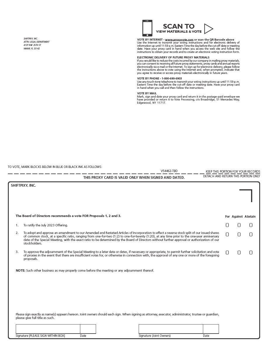 This proxy statement contains information related to our Special Meeting of Stockholders to be held on August 14, 2024 at 9:00 A.M., Eastern Time at the Company’s offices at 4101 NW 25th Street, Miami, FL 33142, or at such other time and place to which the Special Meeting may be adjourned or postponed (the “Special Meeting”). The enclosed proxy is solicited by the Board of Directors (the “Board”) of ShiftPixy, Inc. (the “Company,” “we,” “us,” or “our”). The proxy materials relating to the Special Meeting are being mailed to stockholders entitled to vote at the meeting on or about [●], 2024. A list of record holders of the Company’s common stock entitled to vote at the Special Meeting will be available for examination by any stockholder, for any purpose germane to the Special Meeting, at our principal offices at 4101 NW 25th Street, Miami, FL 33142, during normal business hours for ten days prior to the Special Meeting and available during the Special Meeting.