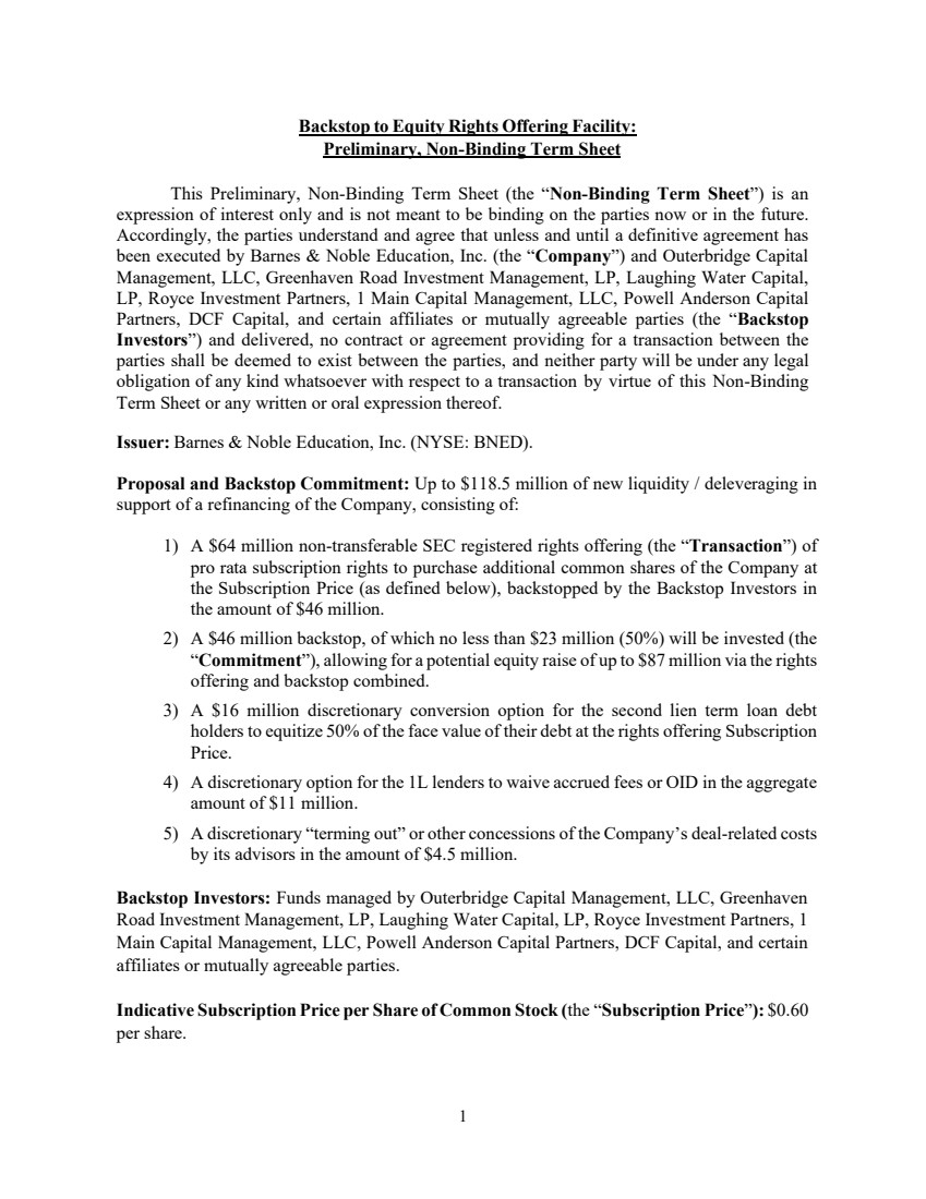 This Amendment No. 2 to Schedule 13D (this “Amendment No. 2”) is being filed with respect to the beneficial ownership of Common Stock, par value $0.01 per share (the “Common Stock”), of Barnes & Noble Education, Inc. (the “Company” or the “Issuer”). This Amendment No. 2 amends and restates in their entirety Items 6 and 7 of the Schedule 13D originally filed on May 17, 2024 as amended by Amendment No.1 thereto filed on June 4, 2024 (“Amendment No. 1”). Item 6 is being amended and restated to eliminate the cross-reference to Item 4 and instead to repeat the relevant text from Item 4 directly into Item 6. Item 7 is being amended and restated to reflect the attachment of Exhibits 2 and 3, confidential treatment for which was requested but not granted.