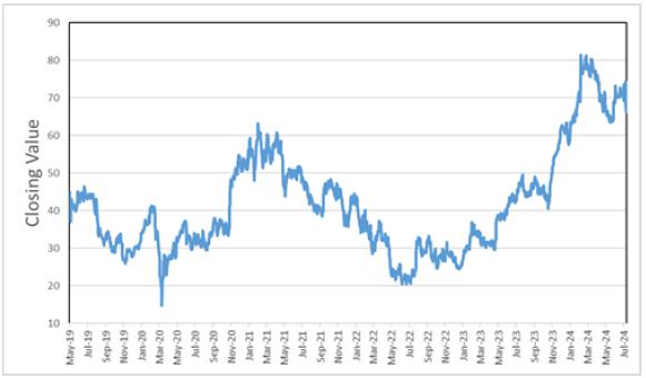 The following graph sets forth the historical performance of the common stock of Uber Technologies, Inc. based on the daily historical closing values from January 1, 2019 through July 18, 2024. We obtained the closing values below from Bloomberg. We have not undertaken any independent review of, or made any due diligence inquiry with respect to, the information obtained from Bloomberg.