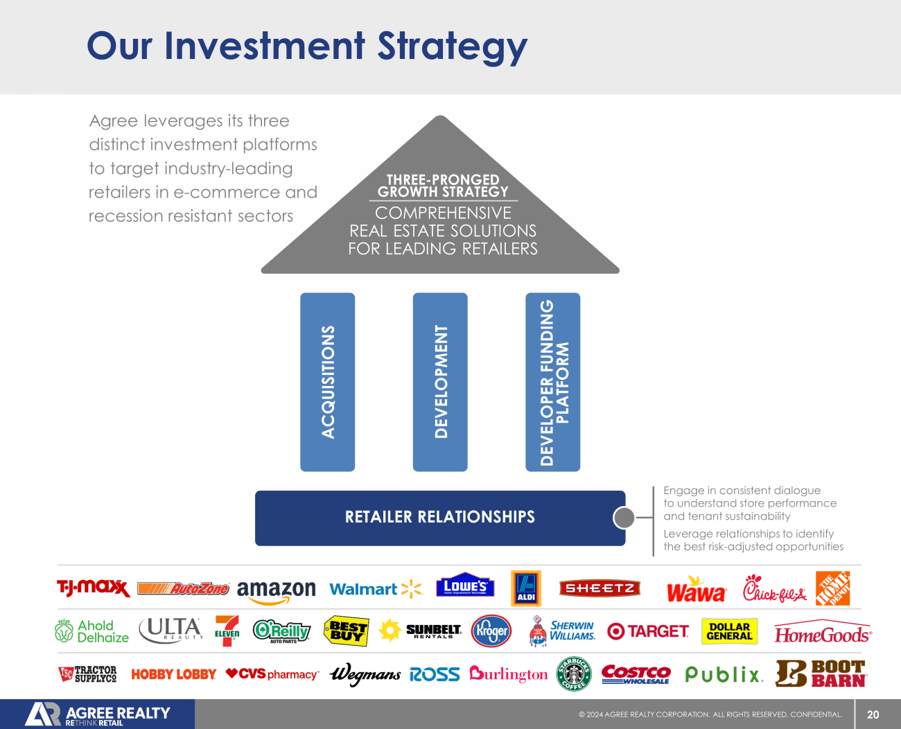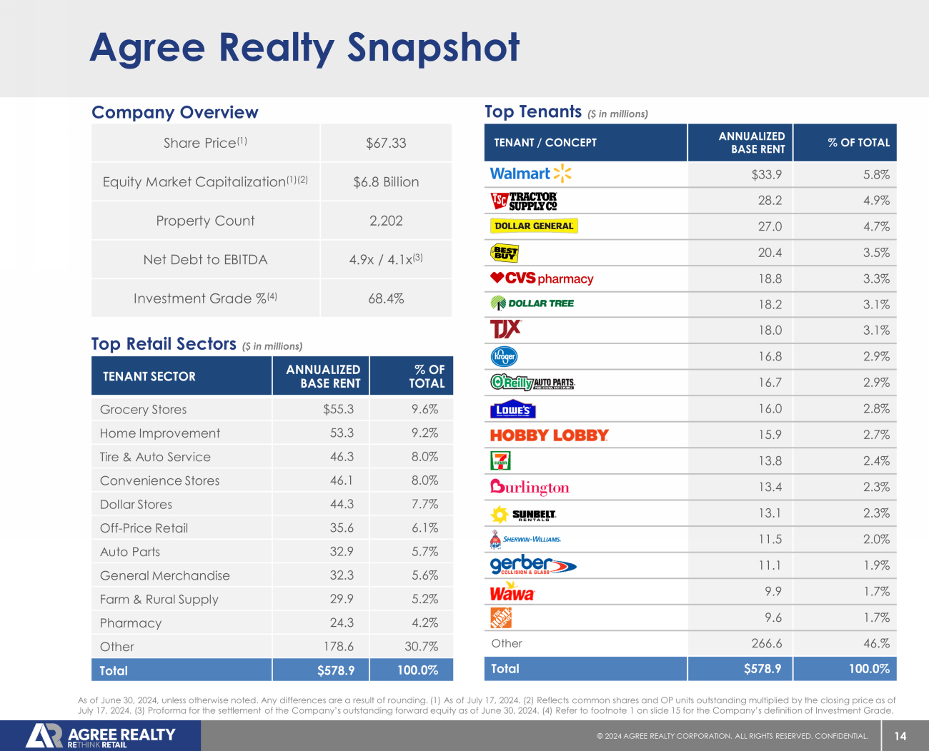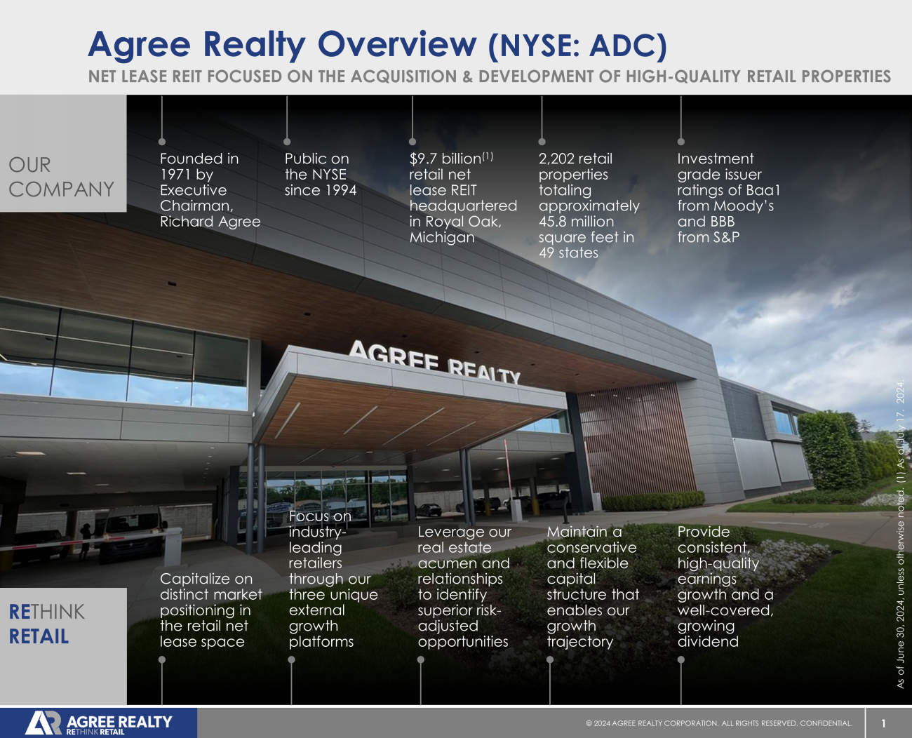 1 © 20 24 AGREE REALTY CORPORATION . ALL RIGHTS RESERVED. CONFIDENTIAL. Agree Realty Overview (NYSE: ADC) OUR COMPANY NET LEASE REIT FOCUSED ON THE ACQUISITION & DEVELOPMENT OF HIGH - QUALITY RETAIL PROPERTIES Founded in 1971 by Executive Chairman, Richard Agree Public on the NYSE since 1994 $ 9.7 billion (1) retail net lease REIT headquartered in Royal Oak, Michigan 2,202 retail properties totaling approximately 45.8 million square feet in 49 states Investment grade issuer ratings of Baa1 from Moody’s and BBB from S&P RE THINK RETAIL Capitalize on distinct market positioning in the retail net lease space Focus on industry - leading retailers through our three unique external growth platforms Leverage our real estate acumen and relationships to identify superior risk - adjusted opportunities Maintain a conservative and flexible capital structure that enables our growth trajectory Provide consistent, high - quality earnings growth and a well - covered, growing dividend As of June 30, 2024, unless otherwise noted. (1) As of July 17. 2024.