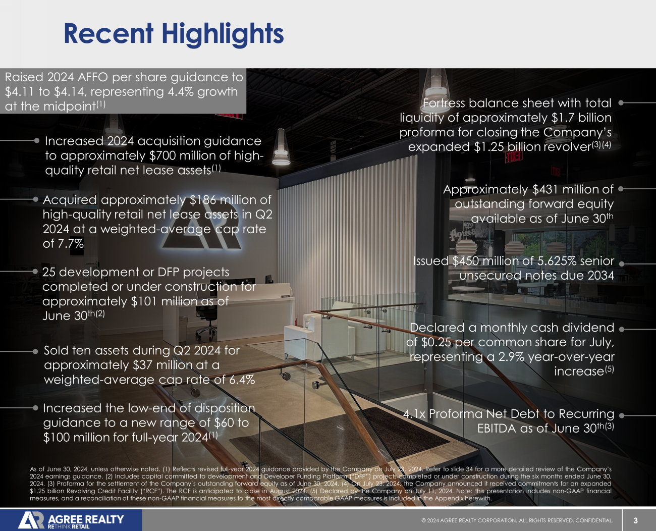 3 © 20 24 AGREE REALTY CORPORATION . ALL RIGHTS RESERVED. CONFIDENTIAL. As of June 30 , 2024 , unless otherwise noted . ( 1 ) Reflects revised full - year 2024 guidance provided by the Company on July 23 , 2024 . Refer to slide 34 for a more detailed review of the Company’s 2024 earnings guidance . ( 2 ) Includes capital committed to development and Developer Funding Platform (“DFP”) projects completed or under construction during the six months ended June 30 , 2024 . ( 3 ) Proforma for the settlement of the Company’s outstanding forward equity as of June 30 , 2024 . ( 4 ) On July 23 , 2024 , the Company announced it received commitments for an expanded $ 1 . 25 billion Revolving Credit Facility (“RCF”) . The RCF is anticipated to close in August 2024 . ( 5 ) Declared by the Company on July 11 , 2024 . Note : this presentation includes non - GAAP financial measures, and a reconciliation of these non - GAAP financial measures to the most directly comparable GAAP measures is included in the Appendix herewith . Recent Highlights Raised 2024 AFFO per share guidance to $4.11 to $4.14, representing 4.4% growth at the midpoint (1) Increased 2024 acquisition guidance to approximately $700 million of high - quality retail net lease assets (1) Approximately $431 million of outstanding forward equity available as of June 30 th Acquired approximately $186 million of high - quality retail net lease assets in Q2 2024 at a weighted - average cap rate of 7.7% Fortress balance sheet with total liquidity of approximately $1.7 billion proforma for closing the Company’s expanded $1.25 billion revolver (3)(4) Increased the low - end of disposition guidance to a new range of $60 to $100 million for full - year 2024 (1) Sold ten assets during Q2 2024 for approximately $37 million at a weighted - average cap rate of 6.4% Declared a monthly cash dividend of $ 0.25 per common share for July , representing a 2.9 % year - over - year increase (5) 25 development or DFP projects completed or under construction for approximately $101 million as of June 30 th(2) Issued $450 million of 5.625% senior unsecured notes due 2034 4.1x Proforma Net Debt to Recurring EBITDA as of June 30 th(3 )