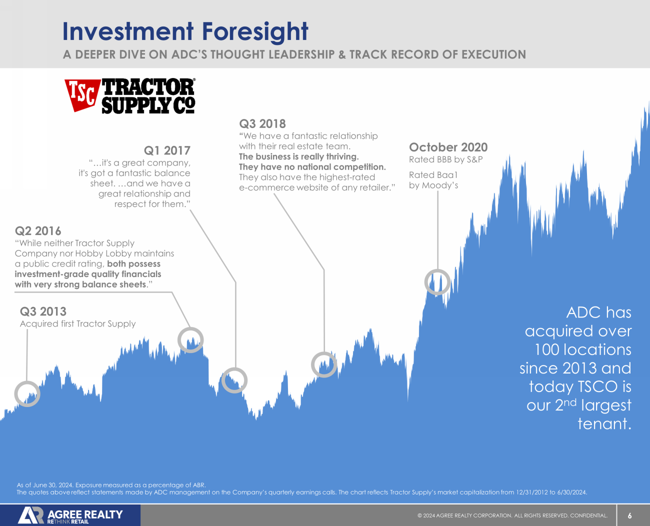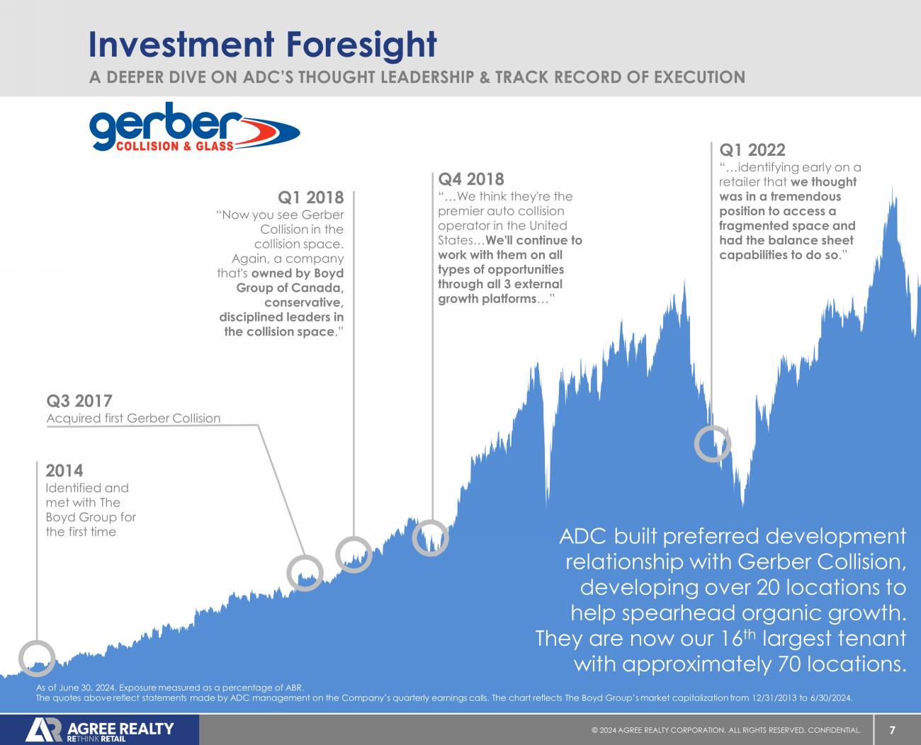 6 © 20 24 AGREE REALTY CORPORATION . ALL RIGHTS RESERVED. CONFIDENTIAL. October 2020 Rated BBB by S&P Rated Baa1 by Moody’s Q 2 2016 “While neither Tractor Supply Company nor Hobby Lobby maintains a public credit rating, both possess investment - grade quality financials with very strong balance sheets .” Q1 2017 “…it's a great company, it's got a fantastic balance sheet. …and we have a great relationship and respect for them.” Q3 2018 “ We have a fantastic relationship with their real estate team. The business is really thriving. They have no national competition. They also have the highest - rated e - commerce website of any retailer.” Investment Foresight A DEEPER DIVE ON ADC’S THOUGHT LEADERSHIP & TRACK RECORD OF EXECUTION As of June 30, 2024. Exposure measured as a percentage of ABR. The quotes above reflect statements made by ADC management on the Company’s quarterly earnings calls. The chart reflects Trac tor Supply’s market capitalization from 12/31/2012 to 6/30/2024. ADC has acquired over 100 locations since 2013 and today TSCO is our 2 nd largest tenant. Q3 2013 Acquired first Tractor Supply