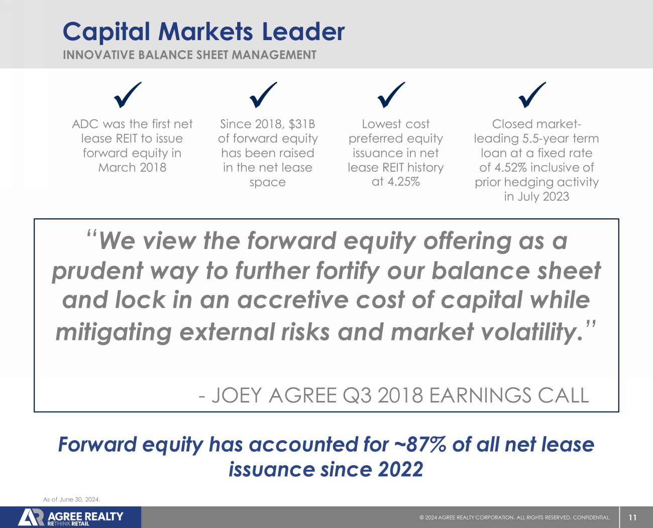 10 © 20 24 AGREE REALTY CORPORATION . ALL RIGHTS RESERVED. CONFIDENTIAL. Investment Foresight A DEEPER DIVE ON ADC’S THOUGHT LEADERSHIP & TRACK RECORD OF EXECUTION 2024 2023 2022 2021 2020 2019 2018 2017 2016 2015 2014 2013 2012 1% 1% 1% 1% 2% 3% 5% 8% 12% 17% 22% 27% 30% Q2 2017 “our Walgreens concentration was down to 8.8% at quarter end, below our goal of sub - 10% by year - end..” Q1 2021 “With this transaction, CVS has surpassed Walgreens as our largest pharmacy tenant… we continue to favor CVS as the sector leader, given their innovation and adaptation to consumer preferences and overall market dynamics in the pharmacy space.” Q1 2019 “ I think the pharmacy space, in general, really has some work to do on the front end predominantly of those stores. And we'd like to see some ingenuity and creativity driving traffic into those stores and driving margin as well as top line revenue to the front end of those stores.” ADC reduced Walgreens exposure from 30% in 2012 to approximately 1% and reduced overall Pharmacy exposure to ~4%. Exposure is as of year - end 2012 through June 30, 2024, and is measured as a percentage of ABR. The quotes above reflect statements made by ADC management on the Company’s quarterly earnings calls. 2023 Downgraded to Baa3 by Moody’s in January. Downgraded to BBB - by S&P in October. Downgraded to Ba2 by Moody’s in December. 2024 Downgraded to Ba3 by Moody’s in July. Downgraded to BB by S&P in July.