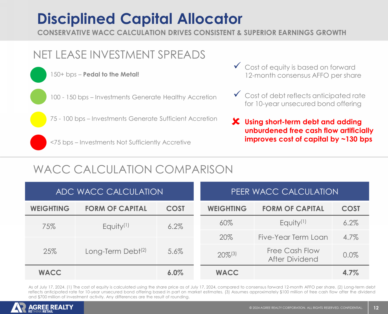 12 © 20 24 AGREE REALTY CORPORATION . ALL RIGHTS RESERVED. CONFIDENTIAL. Disciplined Capital Allocator CONSERVATIVE WACC CALCULATION DRIVES CONSISTENT & SUPERIOR EARNINGS GROWTH ADC WACC CALCULATION COST FORM OF CAPITAL WEIGHTING 6.2% Equity (1) 75% 5.6% Long - Term Debt (2) 25% 6.0% WACC PEER WACC CALCULATION COST FORM OF CAPITAL WEIGHTING 6.2% Equity (1) 60% 4.7% Five - Year Term Loan 20% 0.0% Free Cash Flow After Dividend 20% (3) 4.7% WACC 150+ bps – Pedal to the Metal! 100 - 150 bps – Investments Generate Healthy Accretion 75 - 100 bps – Investments Generate Sufficient Accretion <75 bps – Investments Not Sufficiently Accretive As of July 17 , 2024 . ( 1 ) The cost of equity is calculated using the share price as of July 17 , 2024 , compared to consensus forward 12 - month AFFO per share . ( 2 ) Long - term debt reflects anticipated rate for 10 - year unsecured bond offering based in part on market estimates . ( 3 ) Assumes approximately $ 100 million of free cash flow after the dividend and $ 700 million of investment activity . Any differences are the result of rounding . x Cost of equity is based on forward 12 - month consensus AFFO per share x Cost of debt reflects anticipated rate for 10 - year unsecured bond offering WACC CALCULATION COMPARISON NET LEASE INVESTMENT SPREADS x Using short - term debt and adding unburdened free cash flow artificially improves cost of capital by ~130 bps