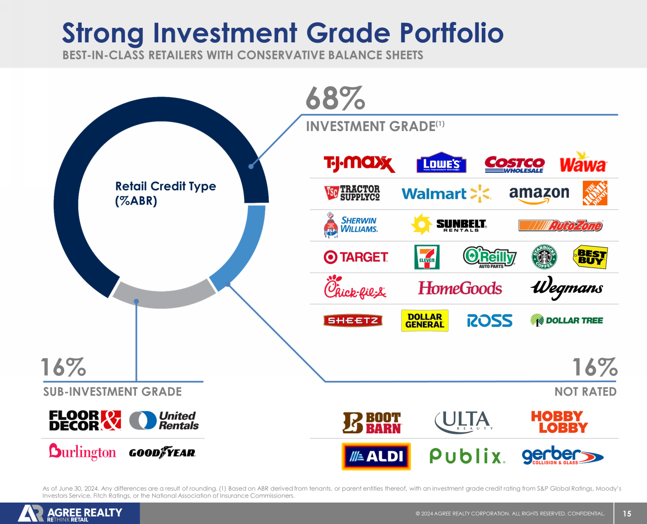 14 © 20 24 AGREE REALTY CORPORATION . ALL RIGHTS RESERVED. CONFIDENTIAL. % OF TOTAL ANNUALIZED BASE RENT TENANT / CONCEPT 5.8% $33.9 4.9% 28.2 4.7% 27.0 3.5% 20.4 3.3% 18.8 3.1% 18.2 3.1% 18.0 2.9% 16.8 2.9% 16.7 2.8% 16.0 2.7% 15.9 2.4% 13.8 2.3% 13.4 2.3% 13.1 2.0% 11.5 1.9% 11.1 1.7% 9.9 1.7% 9.6 46.% 266.6 Other 100.0% $578.9 Total Agree Realty Snapshot % OF TOTAL ANNUALIZED BASE RENT TENANT SECTOR 9.6% $55.3 Grocery Stores 9.2% 53.3 Home Improvement 8.0% 46.3 Tire & Auto Service 8.0% 46.1 Convenience Stores 7.7% 44.3 Dollar Stores 6.1% 35.6 Off - Price Retail 5.7% 32.9 Auto Parts 5.6% 32.3 General Merchandise 5.2% 29.9 Farm & Rural Supply 4.2% 24.3 Pharmacy 30.7% 178.6 Other 100.0% $578.9 Total $67.33 Share Price (1) $6.8 Billion Equity Market Capitalization (1)(2) 2,202 Property Count 4.9x / 4.1x (3) Net Debt to EBITDA 68.4% Investment Grade % (4) Company Overview Top Tenants ($ in millions) Top Retail Sectors ($ in millions) As of June 30, 2024, unless otherwise noted. Any differences are a result of rounding. (1) As of July 17, 2024. (2) Reflects com mon shares and OP units outstanding multiplied by the closing price as of July 17, 2024. (3) Proforma for the settlement of the Company’s outstanding forward equity as of June 30, 2024. (4) Refer to foo tnote 1 on slide 15 for the Company’s definition of Investment Grade.