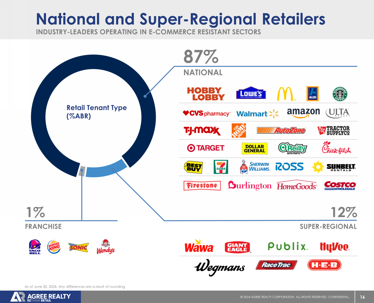 15 © 20 24 AGREE REALTY CORPORATION . ALL RIGHTS RESERVED. CONFIDENTIAL. BEST - IN - CLASS RETAILERS WITH CONSERVATIVE BALANCE SHEETS Strong Investment Grade Portfolio 16% SUB - INVESTMENT GRADE 16% NOT RATED 68% INVESTMENT GRADE (1) As of June 30, 2024. Any differences are a result of rounding. (1) Based on ABR derived from tenants, or parent entities ther eof , with an investment grade credit rating from S&P Global Ratings, Moody’s Investors Service, Fitch Ratings, or the National Association of Insurance Commissioners. Retail Credit Type (%ABR)