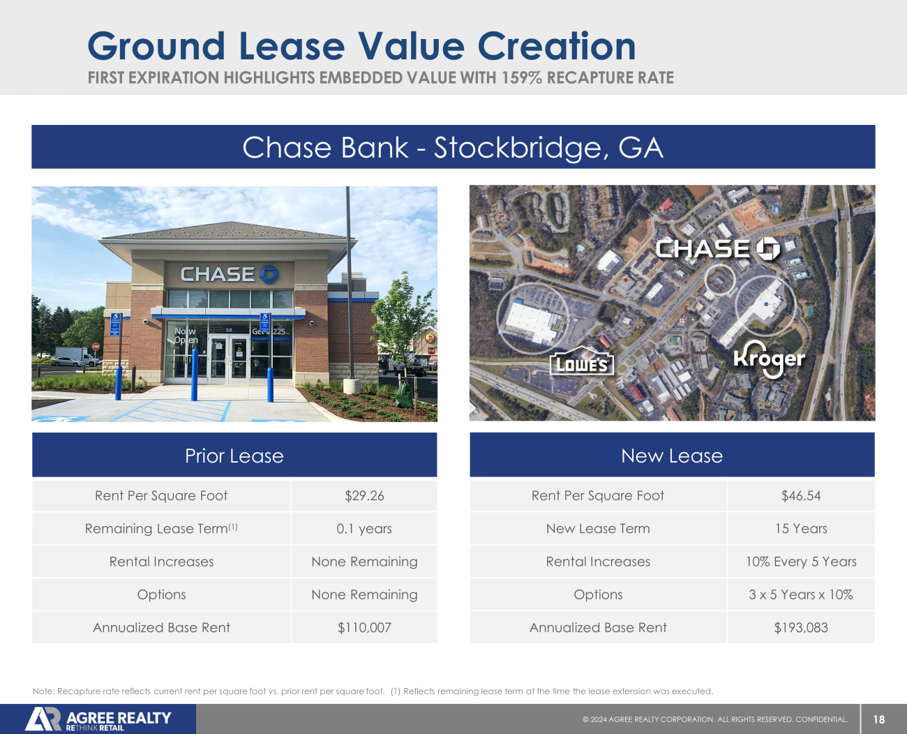 18 © 20 24 AGREE REALTY CORPORATION . ALL RIGHTS RESERVED. CONFIDENTIAL. FIRST EXPIRATION HIGHLIGHTS EMBEDDED VALUE WITH 159% RECAPTURE RATE Ground Lease Value Creation Chase Bank - Stockbridge, GA New Lease $46.54 Rent Per Square Foot 15 Years New Lease Term 10% Every 5 Years Rental Increases 3 x 5 Years x 10% Options $193,083 Annualized Base Rent Prior Lease $29.26 Rent Per Square Foot 0.1 years Remaining Lease Term (1) None Remaining Rental Increases None Remaining Options $110,007 Annualized Base Rent Note: Recapture rate reflects current rent per square foot vs. prior rent per square foot. (1) Reflects remaining lease term at the time the lease extension was executed.