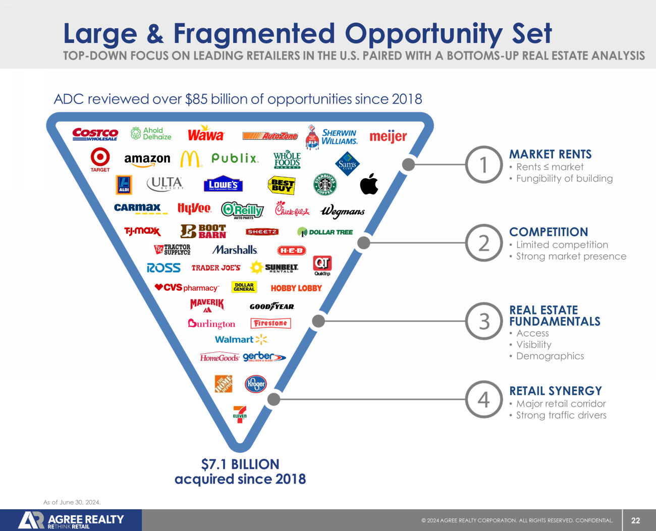 21 © 20 24 AGREE REALTY CORPORATION . ALL RIGHTS RESERVED. CONFIDENTIAL. What Has ADC Been Investing In? The retail landscape continues to dynamically evolve as market forces cause disruption and change. To mitigate risk in a period of continued disruption, the Company adheres to a number of investment criteria, with a focus on four core principles : Focus on leading operators that have matured in omni - channel structure or those in e - commerce resistant sectors OMNI - CHANNEL CRITICAL (E - COMMERCE RESISTANCE) Emphasize a balanced portfolio with exposure to counter - cyclical sectors and retailers with strong credit profiles RECESSION RESISTANCE Strong emphasis on leading operators with strong balance sheets and avoidance of private equity sponsored retailers AVOIDANCE OF PRIVATE EQUITY SPONSORSHIP Protects against unforeseen changes to our top - down investment philosophy STRONG REAL ESTATE FUNDAMENTALS & FUNGIBLE BUILDINGS