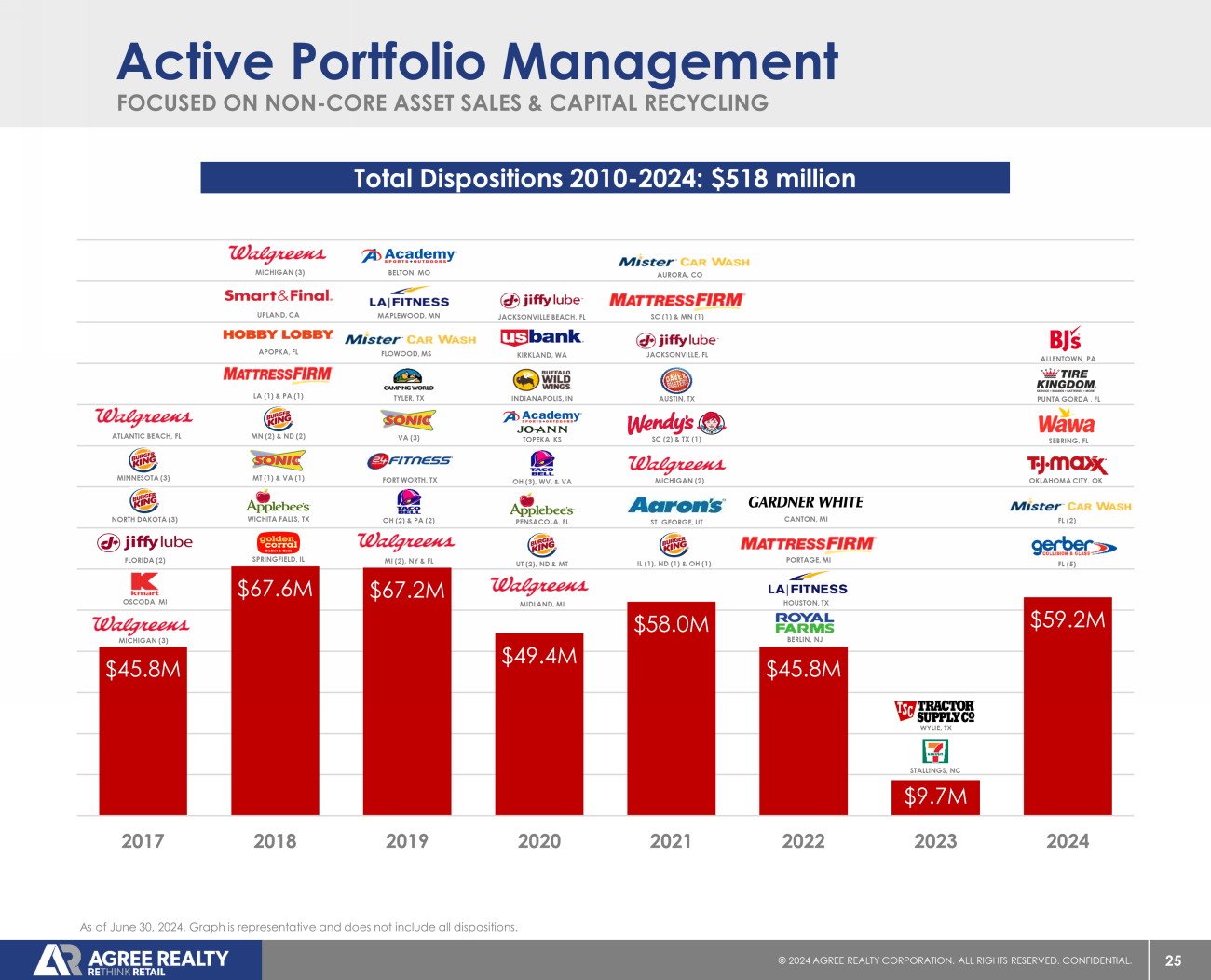 24 © 20 24 AGREE REALTY CORPORATION . ALL RIGHTS RESERVED. CONFIDENTIAL. $336.8 $607.0 $701.4 $1.31B $1.39B $1.59B $1.19B ~$700 $62.7 $74.4 $32.4 $43.2 $40.0 $118.5 $149.9 $101.0 0 200 400 600 800 1,000 1,200 1,400 1,600 1,800 2,000 2017 2018 2019 2020 2021 2022 2023 2024 E ADC HAS INVESTED $9.1 BILLION IN HIGH - QUALITY RETAIL NET LEASE PROPERTIES SINCE 2010 Track Record of Execution DEVELOPMENT & DFP (2) ACQUISITIONS Investment Activity ($ in millions) As of June 30, 2024, unless otherwise noted. (1) Reflects revised acquisition guidance provided by the Company on July 23, 20 24. (2) Represents development & DFP activity, completed or commenced. $ (1)