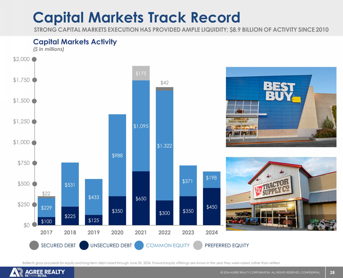 27 © 20 24 AGREE REALTY CORPORATION . ALL RIGHTS RESERVED. CONFIDENTIAL. $2 $42 $0 $50 $0 $50 $410 $450 $475 $125 $300 $300 $450 $0 $100 $200 $300 $400 $500 $600 2024 2025 2026 2027 2028 2029 2030 2031 2032 2033 2034 Leading With Our Fortress Balance Sheet CAPITALIZATION STATISTICS $6.8 Billion Equity Market Capitalization (2) $9.7 Billion Enterprise Value (2)(3) 29.6% Total Debt to Enterprise Value CREDIT METRICS 4.7x Fixed Charge Coverage Ratio 4.9x / 4.1x (5) Net Debt to Recurring EBITDA (4) Baa1 / BBB Issuer Ratings Stable / Positive Ratings Outlooks As of June 30 , 2024 , unless otherwise noted . ( 1 ) Excludes $ 43 . 0 million of outstanding borrowings on the Company’s RCF as of June 30 , 2024 . Proforma for the closing of the Company’s expanded $ 1 . 25 billion RCF anticipated in August 2024 . Assumes two 6 - month extension options are exercised . ( 2 ) As of July 17 , 2024 . ( 3 ) Enterprise value is calculated as the sum of net debt, the liquidation value of preferred equity and equity market capitalization . ( 4 ) Reflects net debt to annualized Q 2 2024 recurring EBITDA . ( 5 ) Proforma for the settlement of the Company's outstanding forward equity as of June 30 , 2024 . Debt Maturities ($ in millions) SECURED UNSECURED NO MATERIAL DEBT MATURITIES UNTIL 2028 & WEIGHTED - AVERAGE DEBT MATURITY OF APPROXIMATELY 7 YEARS (1)