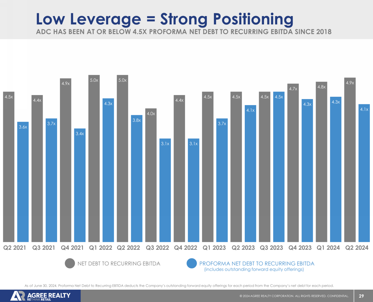 39 © 20 24 AGREE REALTY CORPORATION . ALL RIGHTS RESERVED. CONFIDENTIAL. Non - GAAP Financial Measures This presentation includes a non - GAAP financial measure, Net Debt to Recurring EBITDA, which is presented on an actual and proforma basis . A reconciliation of this non - GAAP financial measure to the most directly comparable GAAP measure is included in the following pages . The components of this ratio and their use and utility to management are described further in the section below . Components of Net Debt to Recurring EBITDA EBITDAre is defined by Nareit to mean net income computed in accordance with GAAP, plus interest expense, income tax expense, depreciation and amortization, any gains (or losses) from sales of real estate assets and/or changes in control, any impairment charges on depreciable real estate assets, and after adjustments for unconsolidated partnerships and joint ventures . The Company considers the non - GAAP measure of EBITDAre to be a key supplemental measure of the Company's performance and should be considered along with, but not as an alternative to, net income or loss as a measure of the Company's operating performance . The Company considers EBITDAre a key supplemental measure of the Company's operating performance because it provides an additional supplemental measure of the Company's performance and operating cash flow that is widely known by industry analysts, lenders and investors . The Company’s calculation of EBITDAre may not be comparable to EBITDAre reported by other REITs that interpret the Nareit definition differently than the Company . Recurring EBITDA The Company defines Recurring EBITDA as EBITDAre with the addback of noncash amortization of above - and below - market lease intangibles, and after adjustments for the run - rate impact of the Company's investment and disposition activity for the period presented, as well as adjustments for non - recurring benefits or expenses . The Company considers the non - GAAP measure of Recurring EBITDA to be a key supplemental measure of the Company's performance and should be considered along with, but not as an alternative to, net income or loss as a measure of the Company's operating performance . The Company considers Recurring EBITDA a key supplemental measure of the Company's operating performance because it represents the Company's earnings run rate for the period presented and because it is widely followed by industry analysts, lenders and investors . Our Recurring EBITDA may not be comparable to Recurring EBITDA reported by other companies that have a different interpretation of the definition of Recurring EBITDA . Our ratio of net debt to Recurring EBITDA is used by management as a measure of leverage and may be useful to investors in understanding the Company’s ability to service its debt, as well as assess the borrowing capacity of the Company . Our ratio of net debt to Recurring EBITDA is calculated by taking annualized Recurring EBITDA and dividing it by our net debt per the consolidated balance sheet . Total Debt and Net Debt The Company defines Total Debt as debt per the consolidated balance sheet excluding unamortized debt issuance costs, original issue discounts and debt discounts . Net Debt is defined as Total Debt less cash, cash equivalents and cash held in escrows . The Company considers the non - GAAP measures of Total Debt and Net Debt to be key supplemental measures of the Company's overall liquidity, capital structure and leverage because they provide industry analysts, lenders and investors useful information in understanding our financial condition . The Company's calculation of Total Debt and Net Debt may not be comparable to Total Debt and Net Debt reported by other REITs that interpret the definitions differently than the Company . The Company presents Net Debt on both an actual and proforma basis, assuming the net proceeds of the Forward Offerings (see below) are used to pay down debt . The Company believes the proforma measure may be useful to investors in understanding the potential effect of the Forward Offerings on the Company's capital structure, its future borrowing capacity, and its ability to service its debt . Anticipated Net Proceeds from Outstanding Forwards Since the first quarter of 2018 , the Company has utilized forward sale agreements to sell shares of common stock . Selling common stock through forward sale agreements enables the Company to set the price of such shares upon pricing the offering (subject to certain adjustments) while delaying the issuance of such shares and the receipt of the net proceeds by the Company . Given the Company’s frequent use of forward sale agreements, the Company considers the non - GAAP measure of Anticipated Net Proceeds from Outstanding Forwards to be a key supplemental measure of the Company's overall liquidity, capital structure and leverage . The Company defines Anticipated Net Proceeds from Outstanding Forwards as the number of shares outstanding under forward sale agreements at the end of each quarter, multiplied by the applicable forward sale price for each agreement, respectively .