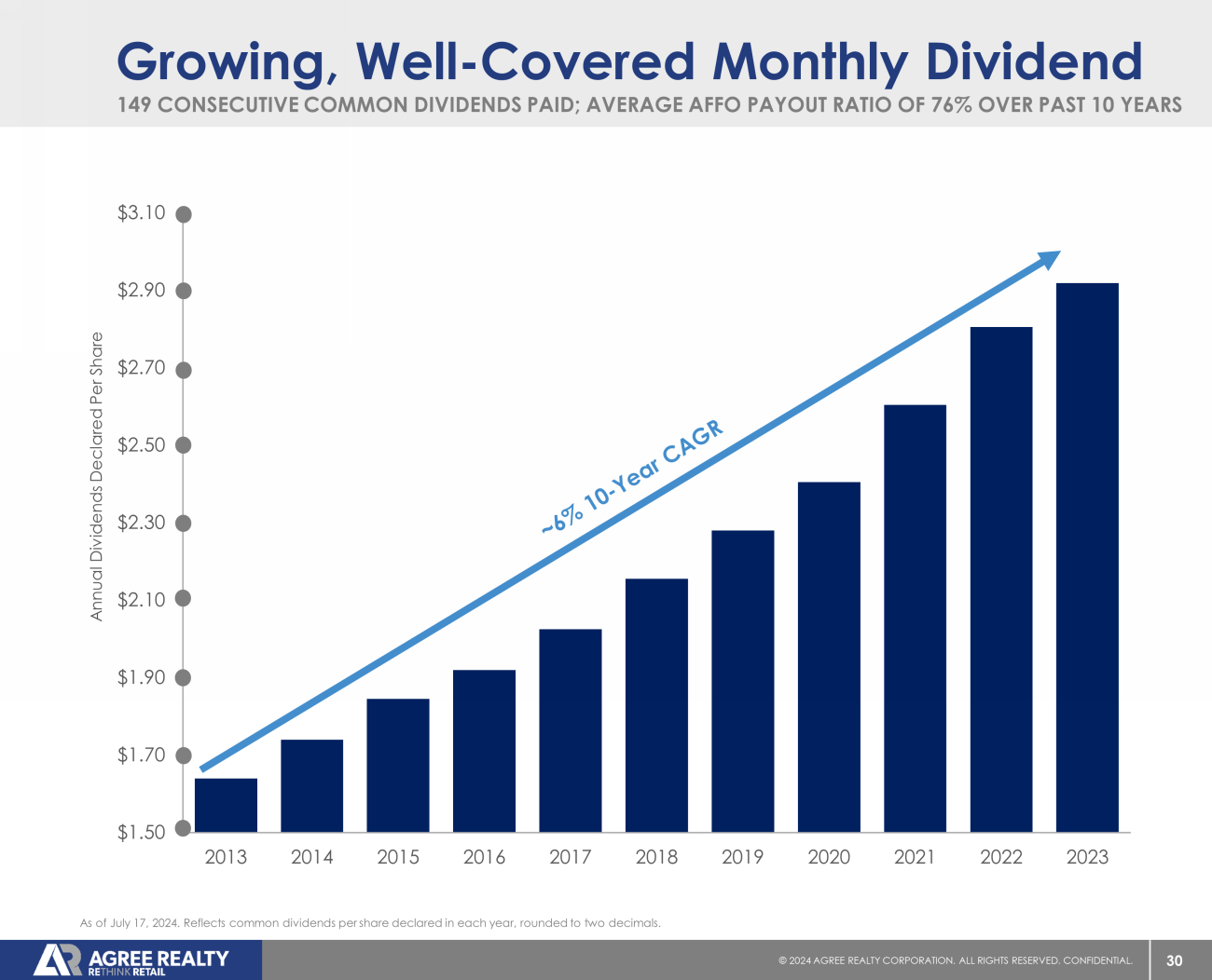 For the six months ended June 30, 2024, the Company declared monthly cash dividends totaling $1.491 per common share, a 2.9% increase over the dividends of $1.449 per common share declared for the comparable period in 2023. The dividends represent payout ratios of approximately 73% of Core FFO per share and 72% of AFFO per share, respectively.