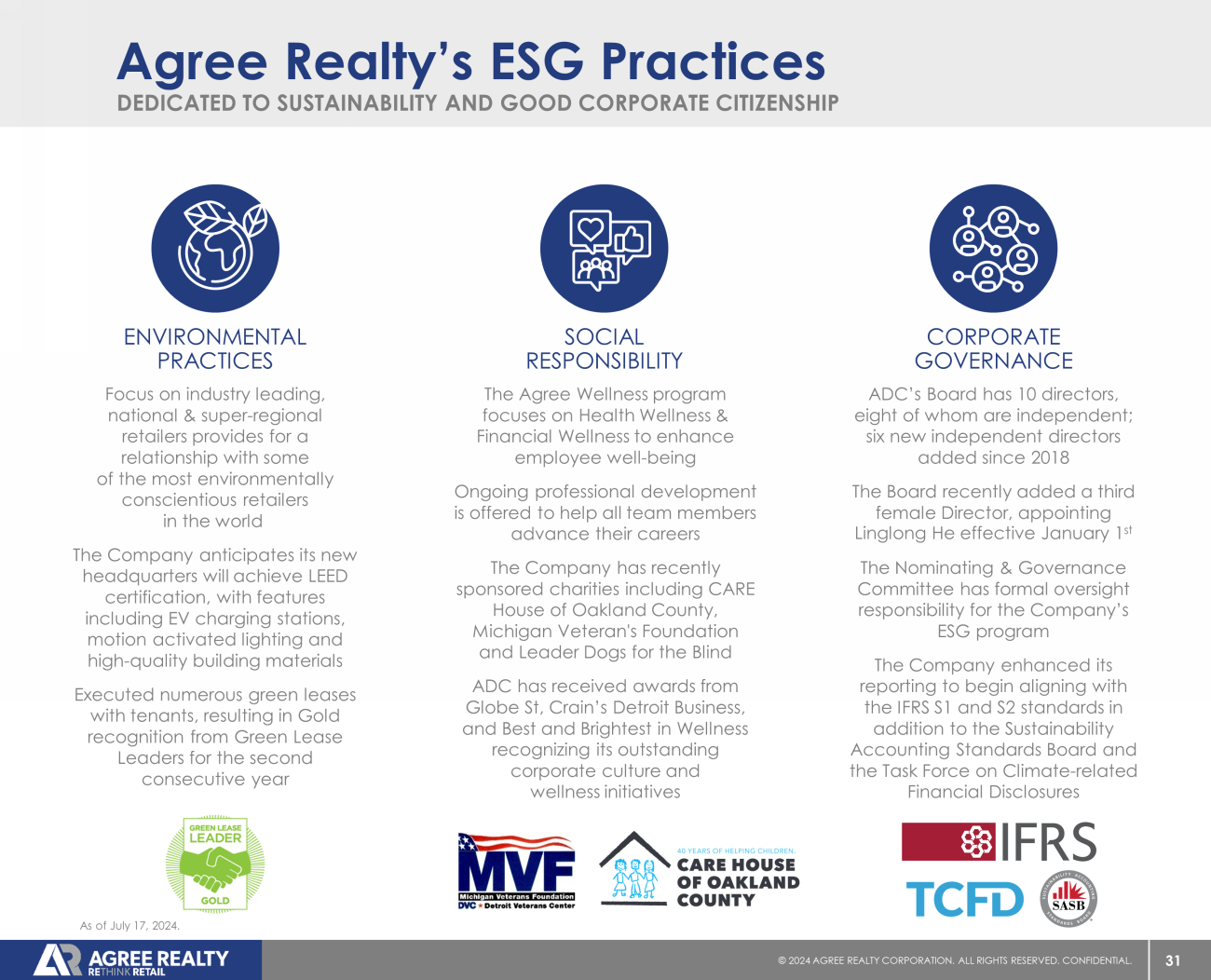 31 © 20 24 AGREE REALTY CORPORATION . ALL RIGHTS RESERVED. CONFIDENTIAL. The Agree Wellness program focuses on Health Wellness & Financial Wellness to enhance employee well - being Ongoing professional development is offered to help all team members advance their careers The Company has recently sponsored charities including CARE House of Oakland County, Michigan Veteran's Foundation and Leader Dogs for the Blind ADC has received awards from Globe St, Crain’s Detroit Business, and Best and Brightest in Wellness recognizing its outstanding corporate culture and wellness initiatives SOCIAL RESPONSIBILITY DEDICATED TO SUSTAINABILITY AND GOOD CORPORATE CITIZENSHIP Agree Realty’s ESG Practices Focus on industry leading, national & super - regional retailers provides for a relationship with some of the most environmentally conscientious retailers in the world The Company anticipates its new headquarters will achieve LEED certification, with features including EV charging stations, motion activated lighting and high - quality building materials Executed numerous green leases with tenants, resulting in Gold recognition from Green Lease Leaders for the second consecutive year ENVIRONMENTAL PRACTICES ADC’s Board has 10 directors, eight of whom are independent; six new independent directors added since 2018 The Board recently added a third female Director, appointing Linglong He effective January 1 st The Nominating & Governance Committee has formal oversight responsibility for the Company’s ESG program The Company enhanced its reporting to begin aligning with the IFRS S1 and S2 standards in addition to the Sustainability Accounting Standards Board and the Task Force on Climate - related Financial Disclosures CORPORATE GOVERNANCE As of July 17, 2024.