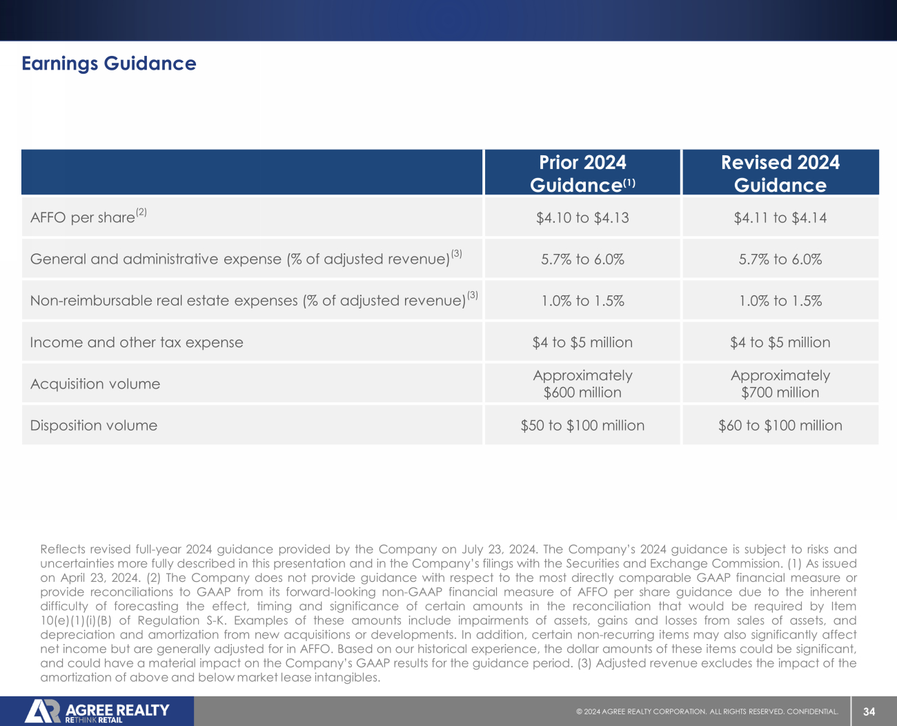 34 © 20 24 AGREE REALTY CORPORATION . ALL RIGHTS RESERVED. CONFIDENTIAL. Earnings Guidance Revised 2024 Guidance Prior 2024 Guidance (1) $4.11 to $4.14 $4.10 to $4.13 AFFO per share (2) 5.7% to 6.0% 5.7% to 6.0% General and administrative expense (% of adjusted revenue) (3) 1.0% to 1.5% 1.0% to 1.5% Non - reimbursable real estate expenses (% of adjusted revenue) (3) $4 to $5 million $4 to $5 million Income and other tax expense Approximately $700 million Approximately $600 million Acquisition volume $60 to $100 million $50 to $100 million Disposition volume Reflects revised full - year 2024 guidance provided by the Company on July 23 , 2024 . The Company’s 2024 guidance is subject to risks and uncertainties more fully described in this presentation and in the Company’s filings with the Securities and Exchange Commission . ( 1 ) As issued on April 23 , 2024 . ( 2 ) The Company does not provide guidance with respect to the most directly comparable GAAP financial measure or provide reconciliations to GAAP from its forward - looking non - GAAP financial measure of AFFO per share guidance due to the inherent difficulty of forecasting the effect, timing and significance of certain amounts in the reconciliation that would be required by Item 10 (e)( 1 )(i)(B) of Regulation S - K . Examples of these amounts include impairments of assets, gains and losses from sales of assets, and depreciation and amortization from new acquisitions or developments . In addition, certain non - recurring items may also significantly affect net income but are generally adjusted for in AFFO . Based on our historical experience, the dollar amounts of these items could be significant, and could have a material impact on the Company’s GAAP results for the guidance period . ( 3 ) Adjusted revenue excludes the impact of the amortization of above and below market lease intangibles .