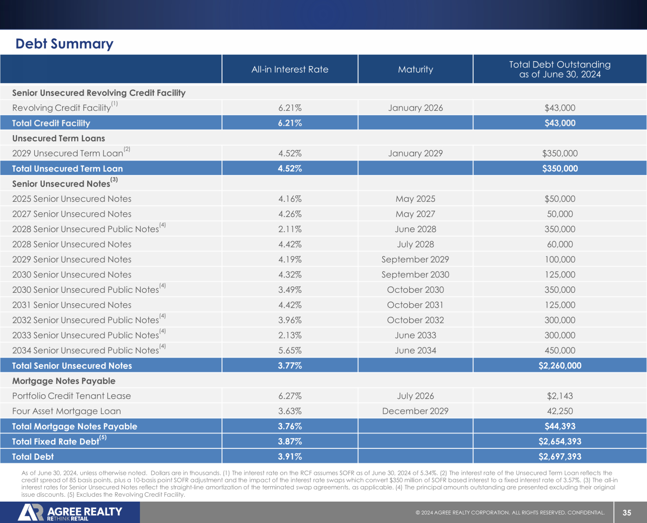 35 © 20 24 AGREE REALTY CORPORATION . ALL RIGHTS RESERVED. CONFIDENTIAL. Debt Summary Total Debt Outstanding as of June 30, 2024 Maturity All - in Interest Rate Senior Unsecured Revolving Credit Facility $43,000 January 2026 6.21% Revolving Credit Facility (1) $43,000 6.21% Total Credit Facility Unsecured Term Loans $350,000 January 2029 4.52% 2029 Unsecured Term Loan (2) $350,000 4.52% Total Unsecured Term Loan Senior Unsecured Notes (3) $50,000 May 2025 4.16% 2025 Senior Unsecured Notes 50,000 May 2027 4.26% 2027 Senior Unsecured Notes 350,000 June 2028 2.11% 2028 Senior Unsecured Public Notes (4) 60,000 July 2028 4.42% 2028 Senior Unsecured Notes 100,000 September 2029 4.19% 2029 Senior Unsecured Notes 125,000 September 2030 4.32% 2030 Senior Unsecured Notes 350,000 October 2030 3.49% 2030 Senior Unsecured Public Notes (4) 125,000 October 2031 4.42% 2031 Senior Unsecured Notes 300,000 October 2032 3.96% 2032 Senior Unsecured Public Notes (4) 300,000 June 2033 2.13% 2033 Senior Unsecured Public Notes (4) 450,000 June 2034 5.65% 2034 Senior Unsecured Public Notes (4) $2,260,000 3.77% Total Senior Unsecured Notes Mortgage Notes Payable $2,143 July 2026 6.27% Portfolio Credit Tenant Lease 42,250 December 2029 3.63% Four Asset Mortgage Loan $44,393 3.76% Total Mortgage Notes Payable $2,654,393 3.87% Total Fixed Rate Debt (5) $2,697,393 3.91% Total Debt As of June 30, 2024, unless otherwise noted. Dollars are in thousands. (1) The interest rate on the RCF assumes SOFR as of J une 30, 2024 of 5.34%. (2) The interest rate of the Unsecured Term Loan reflects the credit spread of 85 basis points, plus a 10 - basis point SOFR adjustment and the impact of the interest rate swaps which convert $350 million of SOFR based interest to a fixed interest rate of 3.57%. (3) The all - in interest rates for Senior Unsecured Notes reflect the straight - line amortization of the terminated swap agreements, as applicabl e. (4) The principal amounts outstanding are presented excluding their original issue discounts. (5) Excludes the Revolving Credit Facility.