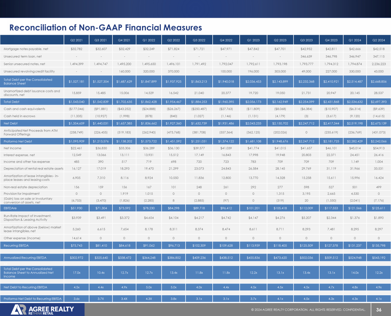 36 © 20 24 AGREE REALTY CORPORATION . ALL RIGHTS RESERVED. CONFIDENTIAL. Reconciliation of Non - GAAP Financial Measures Q2 2024 Q1 2024 Q4 2023 Q3 2023 Q2 2023 Q1 2023 Q4 2022 Q3 2022 Q2 2022 Q1 2022 Q4 2021 Q3 2021 Q2 2021 $42,518 $42,666 $42,811 $42,952 $47,701 $47,842 $47,971 $71,721 $71,824 $32,249 $32,429 $32,607 $32,782 Mortgage notes payable, net 347,115 346,947 346,798 346,639 - - - - - - - - - Unsecured term loan, net 2,236,223 1,794,874 1,794,312 1,793,777 1,793,198 1,792,611 1,792,047 1,791,492 1,496,101 1,495,650 1,495,200 1,494,747 1,494,399 Senior unsecured notes, net 43,000 330,000 227,000 49,000 303,000 196,000 100,000 - 370,000 320,000 160,000 - - Unsecured revolving credit facility $2,668,856 $2,514,487 $2,410,921 $2,232,368 $2,143,899 $2,036,453 $1,940,018 $1,863,213 $1,937,925 $1,847,899 $1,687,629 $1,527,354 $1,527,181 Total Debt per the Consolidated Balance Sheet 28,537 20,145 20,947 21,731 19,050 19,720 20,377 21,040 16,542 14,529 15,006 15,485 15,859 Unamortized debt issuance costs and discounts, net $2,697,393 $2,534,632 $2,431,868 $2,254,099 $2,162,949 $2,056,173 $1,960,395 $1,884,253 $1,954,467 $1,862,428 $1,702,635 $1,542,839 $1,543,040 Total Debt ($9,639) ($6,314) ($10,907) ($6,384) ($8,068) ($11,809) ($27,763) ($250,487) ($26,267) ($24,888) ($43,252) ($91,881) ($177,046) Cash and cash equivalents (14,615) (9,120) (3,617) (3) (4,179) (1,131) (1,146) (1,027) (840) (878) (1,998) (10,927) (11,335) Cash held in escrows $2,673,139 $2,519,198 $2,417,344 $2,247,712 $2,150,702 $2,043,233 $1,931,486 $1,632,739 $1,927,360 $1,836,662 $1,657,385 $1,440,031 $1,354,659 Net Debt (431,073) (236,769) (235,619) 0 (202,026) (362,125) (557,364) (381,708) (475,768) (262,940) (519,183) (226,455) (258,749) Anticipated Net Proceeds from ATM Forward Offerings $2,242,066 $2,282,429 $2,181,725 $2,247,712 $1,948,676 $1,681,108 $1,374,122 $1,251,031 $1,451,592 $1,573,722 $1,138,202 $1,213,576 $1,095,909 Proforma Net Debt $54,913 $45,014 $46,101 $41,657 $41,015 $41,774 $41,039 $39,577 $36,130 $36,289 $33,306 $36,830 $22,461 Net Income 26,416 24,451 22,371 20,803 19,948 17,998 16,843 17,149 15,512 13,931 13,111 13,066 12,549 Interest expense, net 1,004 1,149 709 709 709 783 723 720 698 719 517 390 485 Income and other tax expense 33,531 31,966 31,119 29,769 28,145 26,584 24,843 23,073 21,299 19,470 18,293 17,019 16,127 Depreciation of rental real estate assets 16,424 15,996 15,611 15,258 14,328 13,770 12,800 11,836 10,550 8,924 8,116 7,310 6,905 Amortization of lease intangibles - in - place leases and leasing costs 499 501 527 598 277 292 261 248 101 167 156 159 156 Non - real estate depreciation 0 4,530 2,665 3,195 1,315 0 0 0 0 1,015 1,919 0 0 Provision for impairment (7,176) (2,041) (1,550) 20 (319) 0 (97) (2,885) 8 (2,285) (1,826) (3,470) (6,753) (Gain) loss on sale or involuntary conversion of assets, net $125,611 $121,566 $117,553 $112,009 $105,418 $101,201 $96,412 $89,718 $84,298 $78,230 $73,592 $71,304 $51,930 EBITDAre $1,890 $1,376 $2,344 $5,207 $4,276 $4,147 $4,742 $4,217 $4,104 $4,654 $3,372 $3,491 $3,939 Run - Rate Impact of Investment, Disposition & Leasing Activity 8,297 8,295 7,481 8,293 8,711 8,611 8,474 8,374 8,311 8,178 7,654 6,615 5,260 Amortization of above (below) market lease intangibles, net 0 0 0 0 0 0 0 0 0 0 0 0 14,614 Other expense (income) $135,798 $131,237 $127,378 $125,509 $118,405 $113,959 $109,628 $102,309 $96,713 $91,062 $84,618 $81,410 $75,743 Recurring EBITDA $543,192 $524,948 $509,512 $502,036 $473,620 $455,836 $438,512 $409,236 $386,852 $364,248 $338,472 $325,640 $302,972 Annualized Recurring EBITDA 64 12.2x 14.0x 13.1x 13.4x 13.1x 12.2x 11.8x 11.8x 13.4x 12.7x 12.7x 10.4x 17.0x Total Debt per the Consolidated Balance Sheet to Annualized Net Income 4.9x 4.8x 4.7x 4.5x 4.5x 4.5x 4.4x 4.0x 5.0x 5.0x 4.9x 4.4x 4.5x Net Debt to Recurring EBITDA 4.1x 4.3x 4.3x 4.5x 4.1x 3.7x 3.1x 3.1x 3.8x 4.3X 3.4X 3.7X 3.6x Proforma Net Debt to Recurring EBITDA