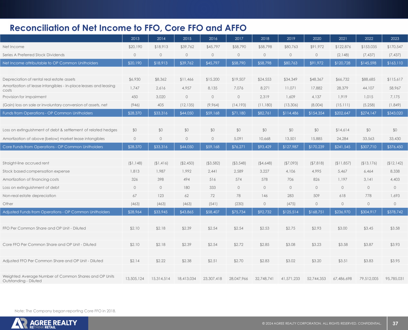 37 © 20 24 AGREE REALTY CORPORATION . ALL RIGHTS RESERVED. CONFIDENTIAL. 2023 2022 2021 2020 2019 2018 2017 2016 2015 2014 2013 $170,547 $153,035 $122,876 $91,972 $80,763 $58,798 $58,790 $45,797 $39,762 $18,913 $20,190 Net Income (7,437) (7,437) (2,148) 0 0 0 0 0 0 0 0 Series A Preferred Stock Dividends $163,110 $145,598 $120,728 $91,972 $80,763 $58,798 $58,790 $45,797 $39,762 $18,913 $20,190 Net Income attributable to OP Common Unitholders $115,617 $88,685 $66,732 $48,367 $34,349 $24,553 $19,507 $15,200 $11,466 $8,362 $6,930 Depreciation of rental real estate assets 58,967 44,107 28,379 17,882 11,071 8,271 7,076 8,135 4,957 2,616 1,747 Amortization of lease intangibles - in - place leases and leasing costs 7,175 1,015 1,919 4,137 1,609 2,319 0 0 0 3,020 450 Provision for impairment (1,849) (5,258) (15,111) (8,004) (13,306) (11,180) (14,193) (9,964) (12,135) 405 (946) (Gain) loss on sale or involuntary conversion of assets, net $343,020 $274,147 $202,647 $154,354 $114,486 $82,761 $71,180 $59,168 $44,050 $33,316 $28,370 Funds from Operations - OP Common Unitholders $0 $0 $14,614 $0 $0 $0 $0 $0 $0 $0 $0 Loss on extinguishment of debt & settlement of related hedges 33,430 33,563 24,284 15,885 13,501 10,668 5,091 0 0 0 0 Amortization of above (below) market lease intangibles $376,450 $307,710 $241,545 $170,239 $127,987 $93,429 $76,271 $59,168 $44,050 $33,316 $28,370 Core Funds from Operations - OP Common Unitholders ($12,142) ($13,176) ($11,857) ($7,818) ($7,093) ($4,648) ($3,548) ($3,582) ($2,450) ($1,416) ($1,148) Straight - line accrued rent 8,338 6,464 5,467 4,995 4,106 3,227 2,589 2,441 1,992 1,987 1,813 Stock based compensation expense 4,403 3,141 1,197 826 706 578 574 516 494 398 326 Amortization of financing costs 0 0 0 0 0 0 0 333 180 0 0 Loss on extinguishment of debt 1,693 778 618 509 283 146 78 72 62 123 67 Non - real estate depreciation 0 0 0 0 (475) 0 (230) (541) (463) (463) (463) Other $378,742 $304,917 $236,970 $168,751 $125,514 $92,732 $75,734 $58,407 $43,865 $33,945 $28,964 Adjusted Funds from Operations - OP Common Unitholders $3.58 $3.45 $3.00 $2.93 $2.75 $2.53 $2.54 $2.54 $2.39 $2.18 $2.10 FFO Per Common Share and OP Unit - Diluted $3.93 $3.87 $3.58 $3.23 $3.08 $2.85 $2.72 $2.54 $2.39 $2.18 $2.10 Core FFO Per Common Share and OP Unit - Diluted $3.95 $3.83 $3.51 $3.20 $3.02 $2.83 $2.70 $2.51 $2.38 $2.22 $2.14 Adjusted FFO Per Common Share and OP Unit - Diluted 95,785,031 79,512,005 67,486,698 52,744,353 41,571,233 32,748,741 28,047,966 23,307,418 18,413,034 15,314,514 13,505,124 Weighted Average Number of Common Shares and OP Units Outstanding - Diluted Reconciliation of Net Income to FFO, Core FFO and AFFO Note: The Company began reporting Core FFO in 2018.