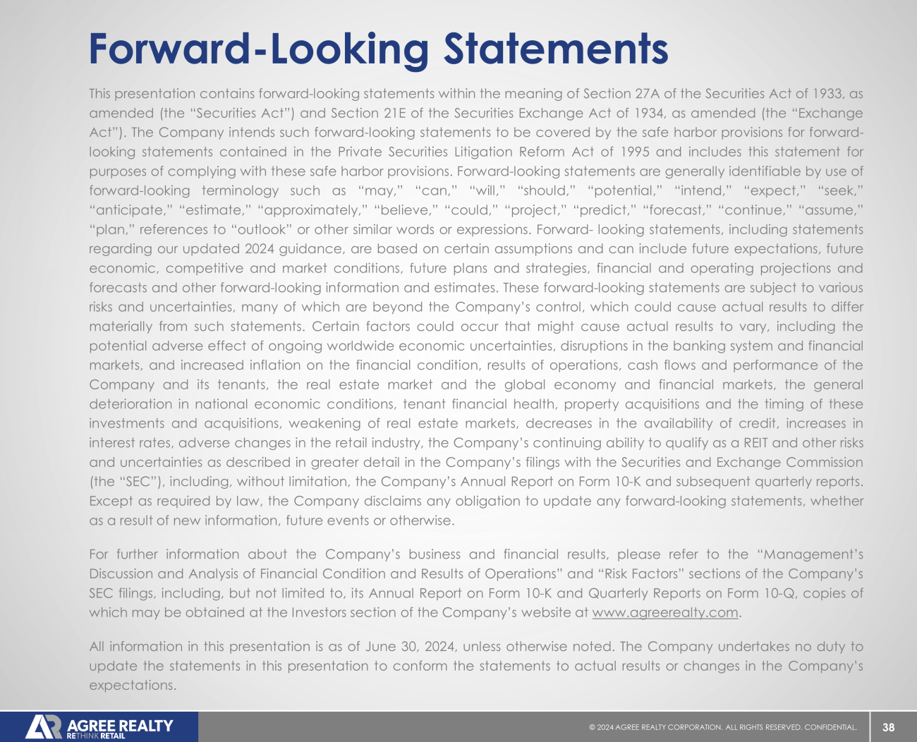 38 © 20 24 AGREE REALTY CORPORATION . ALL RIGHTS RESERVED. CONFIDENTIAL. Forward - Looking Statements This presentation contains forward - looking statements within the meaning of Section 27 A of the Securities Act of 1933 , as amended (the “Securities Act”) and Section 21 E of the Securities Exchange Act of 1934 , as amended (the “Exchange Act”) . The Company intends such forward - looking statements to be covered by the safe harbor provisions for forward - looking statements contained in the Private Securities Litigation Reform Act of 1995 and includes this statement for purposes of complying with these safe harbor provisions . Forward - looking statements are generally identifiable by use of forward - looking terminology such as “may,” “can,” “will,” “should,” “potential,” “intend,” “expect,” “seek,” “anticipate,” “estimate,” “approximately,” “believe,” “could,” “project,” “predict,” “forecast,” “continue,” “assume,” “plan,” references to “outlook” or other similar words or expressions . Forward - looking statements, including statements regarding our updated 2024 guidance, are based on certain assumptions and can include future expectations, future economic, competitive and market conditions, future plans and strategies, financial and operating projections and forecasts and other forward - looking information and estimates . These forward - looking statements are subject to various risks and uncertainties, many of which are beyond the Company’s control, which could cause actual results to differ materially from such statements . Certain factors could occur that might cause actual results to vary, including the potential adverse effect of ongoing worldwide economic uncertainties, disruptions in the banking system and financial markets, and increased inflation on the financial condition, results of operations, cash flows and performance of the Company and its tenants, the real estate market and the global economy and financial markets, the general deterioration in national economic conditions, tenant financial health, property acquisitions and the timing of these investments and acquisitions, weakening of real estate markets, decreases in the availability of credit, increases in interest rates, adverse changes in the retail industry, the Company’s continuing ability to qualify as a REIT and other risks and uncertainties as described in greater detail in the Company’s filings with the Securities and Exchange Commission (the “SEC”), including, without limitation, the Company’s Annual Report on Form 10 - K and subsequent quarterly reports . Except as required by law, the Company disclaims any obligation to update any forward - looking statements, whether as a result of new information, future events or otherwise . For further information about the Company’s business and financial results, please refer to the “Management’s Discussion and Analysis of Financial Condition and Results of Operations” and “Risk Factors” sections of the Company’s SEC filings, including, but not limited to, its Annual Report on Form 10 - K and Quarterly Reports on Form 10 - Q, copies of which may be obtained at the Investors section of the Company’s website at www . agreerealty . com . All information in this presentation is as of June 30 , 2024 , unless otherwise noted . The Company undertakes no duty to update the statements in this presentation to conform the statements to actual results or changes in the Company’s expectations .