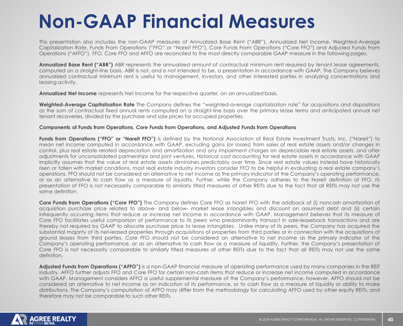 40 © 20 24 AGREE REALTY CORPORATION . ALL RIGHTS RESERVED. CONFIDENTIAL. Non - GAAP Financial Measures This presentation also includes the non - GAAP measures of Annualized Base Rent (“ABR”), Annualized Net Income, Weighted - Average Capitalization Rate, Funds From Operations (“FFO” or “Nareit FFO”), Core Funds From Operations (“Core FFO”) and Adjusted Funds From Operations (“AFFO”) . FFO, Core FFO and AFFO are reconciled to the most directly comparable GAAP measure in the following pages . Annualized Base Rent (“ABR”) ABR represents the annualized amount of contractual minimum rent required by tenant lease agreements, computed on a straight - line basis . ABR is not, and is not intended to be, a presentation in accordance with GAAP . The Company believes annualized contractual minimum rent is useful to management, investors, and other interested parties in analyzing concentrations and leasing activity . Annualized Net Income represents Net Income for the respective quarter, on an annualized basis . Weighted - Average Capitalization Rate The Company defines the “weighted - average capitalization rate” for acquisitions and dispositions as the sum of contractual fixed annual rents computed on a straight - line basis over the primary lease terms and anticipated annual net tenant recoveries, divided by the purchase and sale prices for occupied properties . Components of Funds from Operations, Core Funds from Operations, and Adjusted Funds from Operations Funds from Operations (“FFO” or “Nareit FFO”) is defined by the National Association of Real Estate Investment Trusts, Inc . (“Nareit”) to mean net income computed in accordance with GAAP, excluding gains (or losses) from sales of real estate assets and/or changes in control, plus real estate related depreciation and amortization and any impairment charges on depreciable real estate assets, and after adjustments for unconsolidated partnerships and joint ventures . Historical cost accounting for real estate assets in accordance with GAAP implicitly assumes that the value of real estate assets diminishes predictably over time . Since real estate values instead have historically risen or fallen with market conditions, most real estate industry investors consider FFO to be helpful in evaluating a real estate company’s operations . FFO should not be considered an alternative to net income as the primary indicator of the Company’s operating performance, or as an alternative to cash flow as a measure of liquidity . Further, while the Company adheres to the Nareit definition of FFO, its presentation of FFO is not necessarily comparable to similarly titled measures of other REITs due to the fact that all REITs may not use the same definition . Core Funds from Operations (“Core FFO”) The Company defines Core FFO as Nareit FFO with the addback of (i) noncash amortization of acquisition purchase price related to above - and below - market lease intangibles and discount on assumed debt and (ii) certain infrequently occurring items that reduce or increase net income in accordance with GAAP . Management believes that its measure of Core FFO facilitates useful comparison of performance to its peers who predominantly transact in sale - leaseback transactions and are thereby not required by GAAP to allocate purchase price to lease intangibles . Unlike many of its peers, the Company has acquired the substantial majority of its net - leased properties through acquisitions of properties from third parties or in connection with the acquisitions of ground leases from third parties . Core FFO should not be considered an alternative to net income as the primary indicator of the Company’s operating performance, or as an alternative to cash flow as a measure of liquidity . Further, the Company’s presentation of Core FFO is not necessarily comparable to similarly titled measures of other REITs due to the fact that all REITs may not use the same definition . Adjusted Funds from Operations (“AFFO”) is a non - GAAP financial measure of operating performance used by many companies in the REIT industry . AFFO further adjusts FFO and Core FFO for certain non - cash items that reduce or increase net income computed in accordance with GAAP . Management considers AFFO a useful supplemental measure of the Company’s performance, however, AFFO should not be considered an alternative to net income as an indication of its performance, or to cash flow as a measure of liquidity or ability to make distributions . The Company’s computation of AFFO may differ from the methodology for calculating AFFO used by other equity REITs, and therefore may not be comparable to such other REITs .