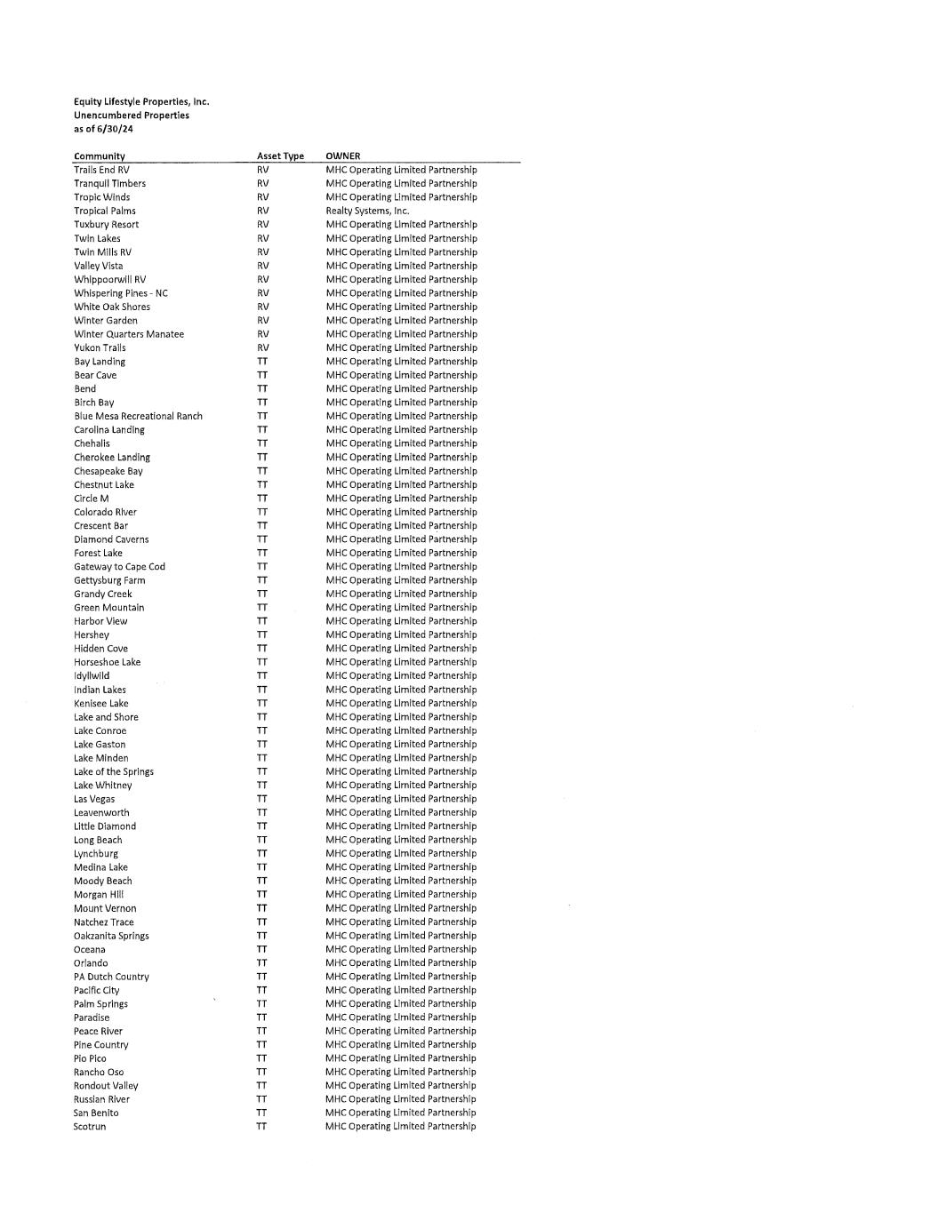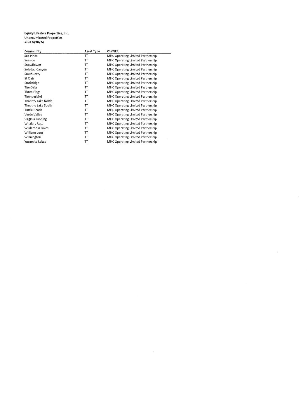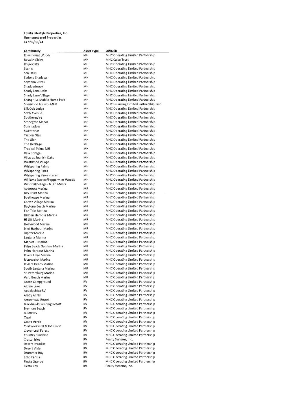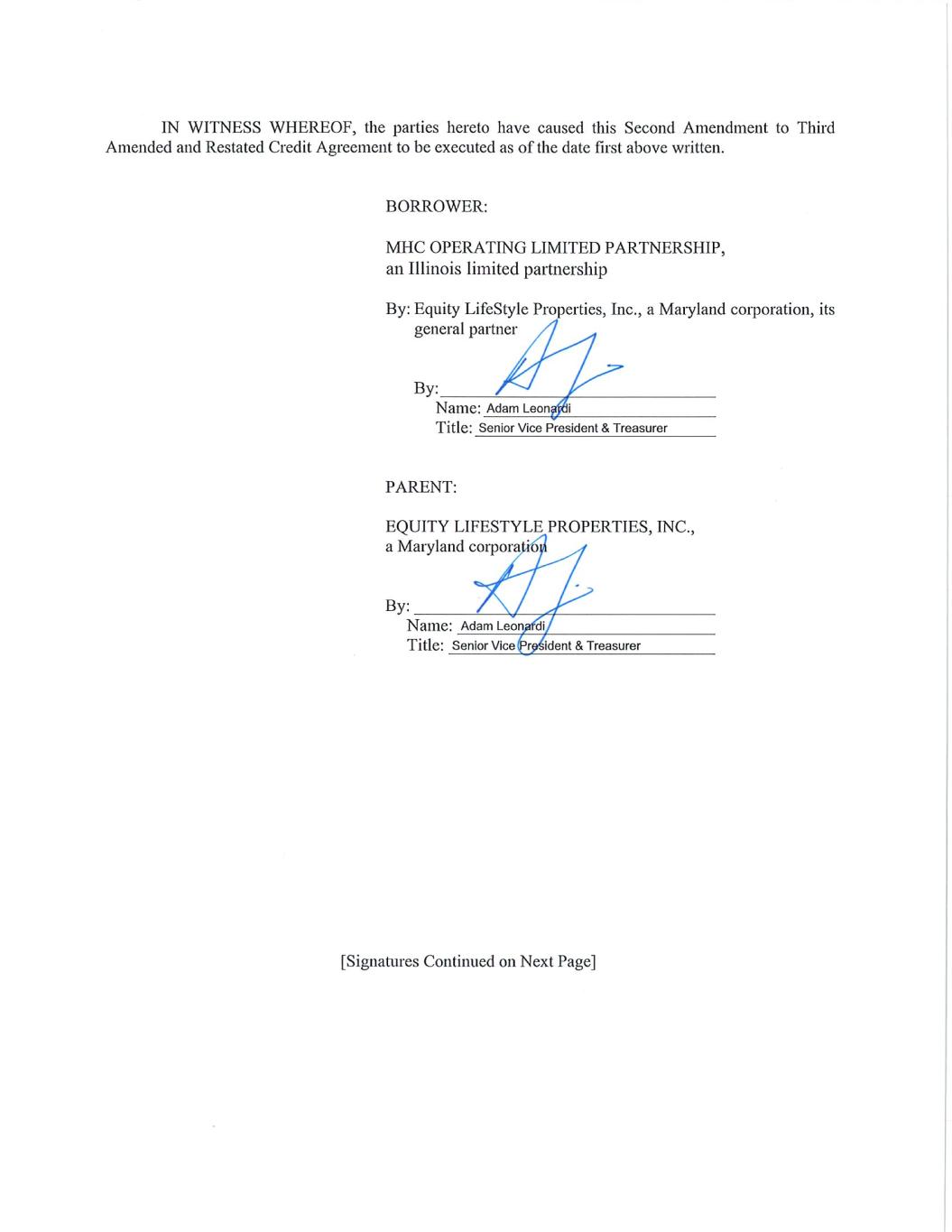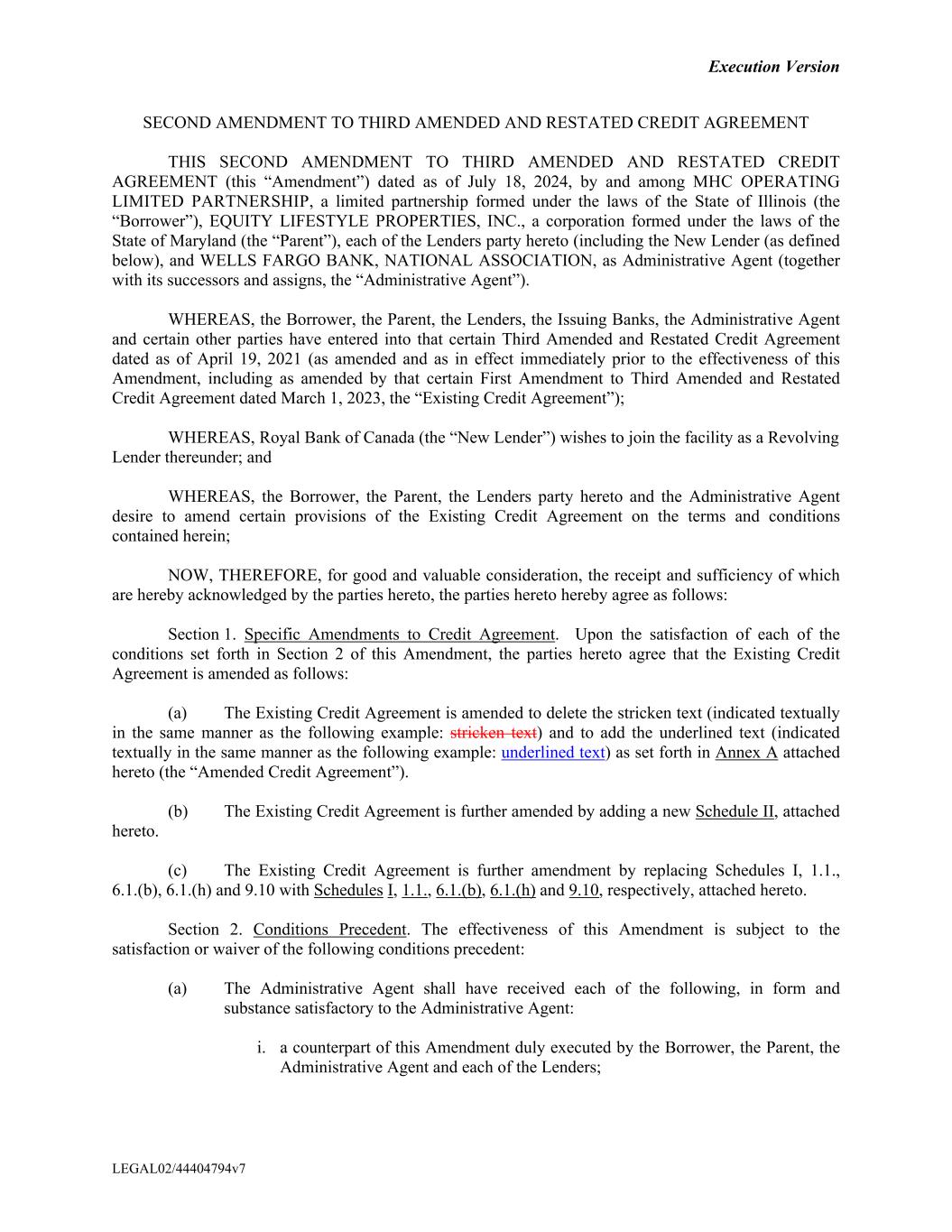 Execution Version LEGAL02/44404794v7 SECOND AMENDMENT TO THIRD AMENDED AND RESTATED CREDIT AGREEMENT THIS SECOND AMENDMENT TO THIRD AMENDED AND RESTATED CREDIT AGREEMENT (this “Amendment”) dated as of July 18, 2024, by and among MHC OPERATING LIMITED PARTNERSHIP, a limited partnership formed under the laws of the State of Illinois (the “Borrower”), EQUITY LIFESTYLE PROPERTIES, INC., a corporation formed under the laws of the State of Maryland (the “Parent”), each of the Lenders party hereto (including the New Lender (as defined below), and WELLS FARGO BANK, NATIONAL ASSOCIATION, as Administrative Agent (together with its successors and assigns, the “Administrative Agent”). WHEREAS, the Borrower, the Parent, the Lenders, the Issuing Banks, the Administrative Agent and certain other parties have entered into that certain Third Amended and Restated Credit Agreement dated as of April 19, 2021 (as amended and as in effect immediately prior to the effectiveness of this Amendment, including as amended by that certain First Amendment to Third Amended and Restated Credit Agreement dated March 1, 2023, the “Existing Credit Agreement”); WHEREAS, Royal Bank of Canada (the “New Lender”) wishes to join the facility as a Revolving Lender thereunder; and WHEREAS, the Borrower, the Parent, the Lenders party hereto and the Administrative Agent desire to amend certain provisions of the Existing Credit Agreement on the terms and conditions contained herein; NOW, THEREFORE, for good and valuable consideration, the receipt and sufficiency of which are hereby acknowledged by the parties hereto, the parties hereto hereby agree as follows: Section 1. Specific Amendments to Credit Agreement. Upon the satisfaction of each of the conditions set forth in Section 2 of this Amendment, the parties hereto agree that the Existing Credit Agreement is amended as follows: (a) The Existing Credit Agreement is amended to delete the stricken text (indicated textually in the same manner as the following example: stricken text) and to add the underlined text (indicated textually in the same manner as the following example: underlined text) as set forth in Annex A attached hereto (the “Amended Credit Agreement”). (b) The Existing Credit Agreement is further amended by adding a new Schedule II, attached hereto. (c) The Existing Credit Agreement is further amendment by replacing Schedules I, 1.1., 6.1.(b), 6.1.(h) and 9.10 with Schedules I, 1.1., 6.1.(b), 6.1.(h) and 9.10, respectively, attached hereto. Section 2. Conditions Precedent. The effectiveness of this Amendment is subject to the satisfaction or waiver of the following conditions precedent: (a) The Administrative Agent shall have received each of the following, in form and substance satisfactory to the Administrative Agent: i. a counterpart of this Amendment duly executed by the Borrower, the Parent, the Administrative Agent and each of the Lenders;