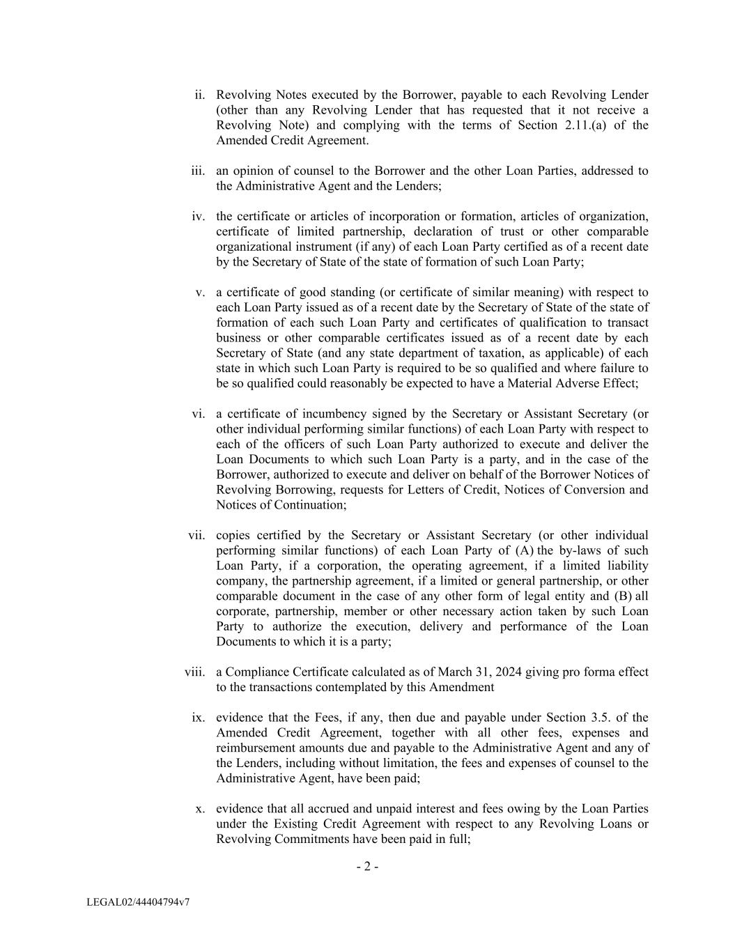 - 2 - LEGAL02/44404794v7 ii. Revolving Notes executed by the Borrower, payable to each Revolving Lender (other than any Revolving Lender that has requested that it not receive a Revolving Note) and complying with the terms of Section 2.11.(a) of the Amended Credit Agreement. iii. an opinion of counsel to the Borrower and the other Loan Parties, addressed to the Administrative Agent and the Lenders; iv. the certificate or articles of incorporation or formation, articles of organization, certificate of limited partnership, declaration of trust or other comparable organizational instrument (if any) of each Loan Party certified as of a recent date by the Secretary of State of the state of formation of such Loan Party; v. a certificate of good standing (or certificate of similar meaning) with respect to each Loan Party issued as of a recent date by the Secretary of State of the state of formation of each such Loan Party and certificates of qualification to transact business or other comparable certificates issued as of a recent date by each Secretary of State (and any state department of taxation, as applicable) of each state in which such Loan Party is required to be so qualified and where failure to be so qualified could reasonably be expected to have a Material Adverse Effect; vi. a certificate of incumbency signed by the Secretary or Assistant Secretary (or other individual performing similar functions) of each Loan Party with respect to each of the officers of such Loan Party authorized to execute and deliver the Loan Documents to which such Loan Party is a party, and in the case of the Borrower, authorized to execute and deliver on behalf of the Borrower Notices of Revolving Borrowing, requests for Letters of Credit, Notices of Conversion and Notices of Continuation; vii. copies certified by the Secretary or Assistant Secretary (or other individual performing similar functions) of each Loan Party of (A) the by-laws of such Loan Party, if a corporation, the operating agreement, if a limited liability company, the partnership agreement, if a limited or general partnership, or other comparable document in the case of any other form of legal entity and (B) all corporate, partnership, member or other necessary action taken by such Loan Party to authorize the execution, delivery and performance of the Loan Documents to which it is a party; viii. a Compliance Certificate calculated as of March 31, 2024 giving pro forma effect to the transactions contemplated by this Amendment ix. evidence that the Fees, if any, then due and payable under Section 3.5. of the Amended Credit Agreement, together with all other fees, expenses and reimbursement amounts due and payable to the Administrative Agent and any of the Lenders, including without limitation, the fees and expenses of counsel to the Administrative Agent, have been paid; x. evidence that all accrued and unpaid interest and fees owing by the Loan Parties under the Existing Credit Agreement with respect to any Revolving Loans or Revolving Commitments have been paid in full;