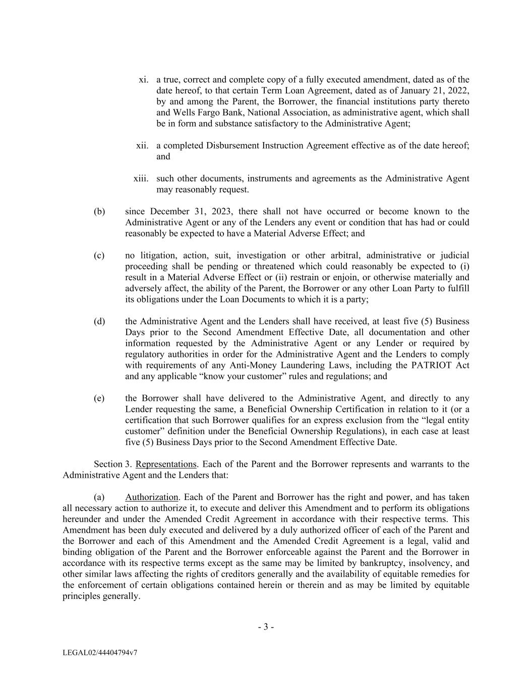 - 3 - LEGAL02/44404794v7 xi. a true, correct and complete copy of a fully executed amendment, dated as of the date hereof, to that certain Term Loan Agreement, dated as of January 21, 2022, by and among the Parent, the Borrower, the financial institutions party thereto and Wells Fargo Bank, National Association, as administrative agent, which shall be in form and substance satisfactory to the Administrative Agent; xii. a completed Disbursement Instruction Agreement effective as of the date hereof; and xiii. such other documents, instruments and agreements as the Administrative Agent may reasonably request. (b) since December 31, 2023, there shall not have occurred or become known to the Administrative Agent or any of the Lenders any event or condition that has had or could reasonably be expected to have a Material Adverse Effect; and (c) no litigation, action, suit, investigation or other arbitral, administrative or judicial proceeding shall be pending or threatened which could reasonably be expected to (i) result in a Material Adverse Effect or (ii) restrain or enjoin, or otherwise materially and adversely affect, the ability of the Parent, the Borrower or any other Loan Party to fulfill its obligations under the Loan Documents to which it is a party; (d) the Administrative Agent and the Lenders shall have received, at least five (5) Business Days prior to the Second Amendment Effective Date, all documentation and other information requested by the Administrative Agent or any Lender or required by regulatory authorities in order for the Administrative Agent and the Lenders to comply with requirements of any Anti-Money Laundering Laws, including the PATRIOT Act and any applicable “know your customer” rules and regulations; and (e) the Borrower shall have delivered to the Administrative Agent, and directly to any Lender requesting the same, a Beneficial Ownership Certification in relation to it (or a certification that such Borrower qualifies for an express exclusion from the “legal entity customer” definition under the Beneficial Ownership Regulations), in each case at least five (5) Business Days prior to the Second Amendment Effective Date. Section 3. Representations. Each of the Parent and the Borrower represents and warrants to the Administrative Agent and the Lenders that: (a) Authorization. Each of the Parent and Borrower has the right and power, and has taken all necessary action to authorize it, to execute and deliver this Amendment and to perform its obligations hereunder and under the Amended Credit Agreement in accordance with their respective terms. This Amendment has been duly executed and delivered by a duly authorized officer of each of the Parent and the Borrower and each of this Amendment and the Amended Credit Agreement is a legal, valid and binding obligation of the Parent and the Borrower enforceable against the Parent and the Borrower in accordance with its respective terms except as the same may be limited by bankruptcy, insolvency, and other similar laws affecting the rights of creditors generally and the availability of equitable remedies for the enforcement of certain obligations contained herein or therein and as may be limited by equitable principles generally.