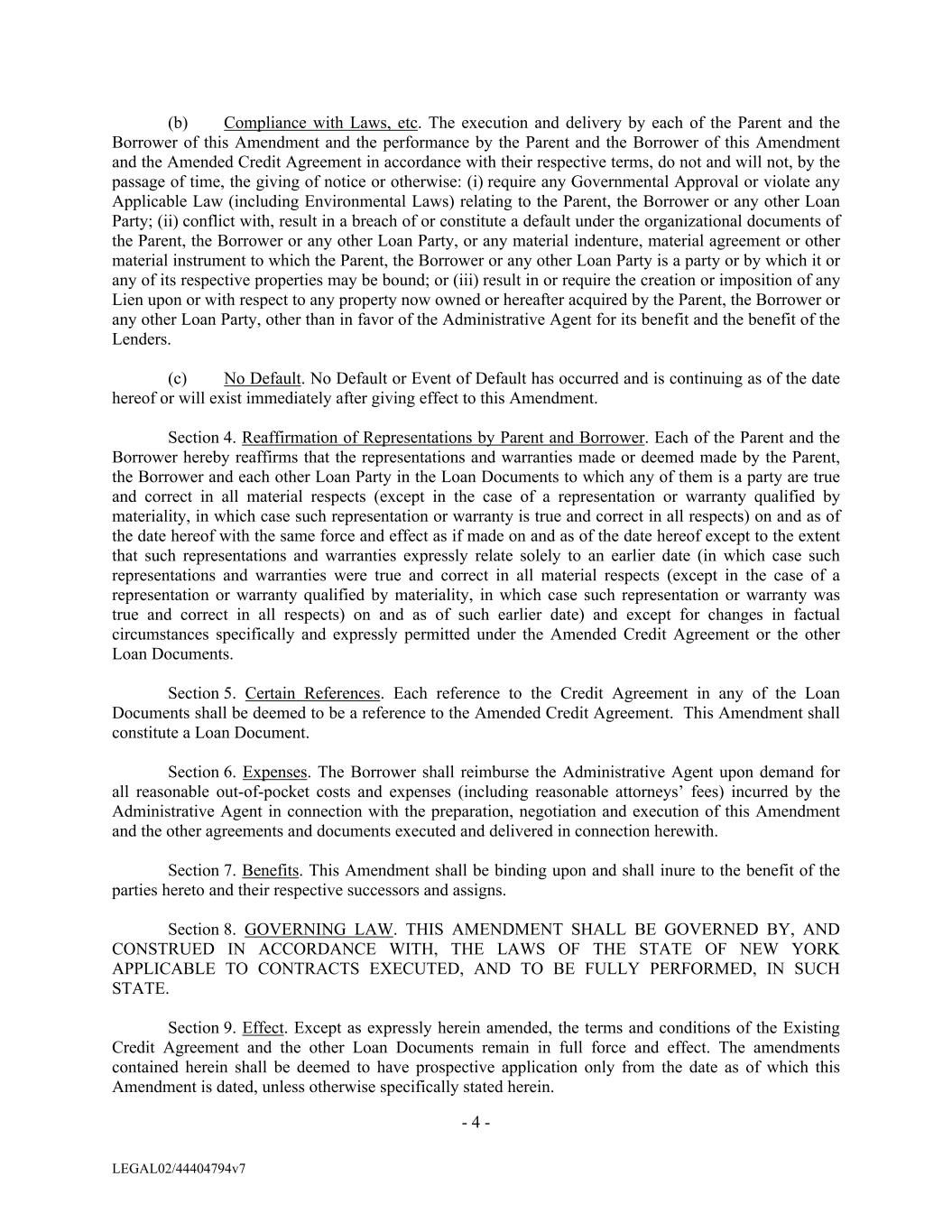 - 4 - LEGAL02/44404794v7 (b) Compliance with Laws, etc. The execution and delivery by each of the Parent and the Borrower of this Amendment and the performance by the Parent and the Borrower of this Amendment and the Amended Credit Agreement in accordance with their respective terms, do not and will not, by the passage of time, the giving of notice or otherwise: (i) require any Governmental Approval or violate any Applicable Law (including Environmental Laws) relating to the Parent, the Borrower or any other Loan Party; (ii) conflict with, result in a breach of or constitute a default under the organizational documents of the Parent, the Borrower or any other Loan Party, or any material indenture, material agreement or other material instrument to which the Parent, the Borrower or any other Loan Party is a party or by which it or any of its respective properties may be bound; or (iii) result in or require the creation or imposition of any Lien upon or with respect to any property now owned or hereafter acquired by the Parent, the Borrower or any other Loan Party, other than in favor of the Administrative Agent for its benefit and the benefit of the Lenders. (c) No Default. No Default or Event of Default has occurred and is continuing as of the date hereof or will exist immediately after giving effect to this Amendment. Section 4. Reaffirmation of Representations by Parent and Borrower. Each of the Parent and the Borrower hereby reaffirms that the representations and warranties made or deemed made by the Parent, the Borrower and each other Loan Party in the Loan Documents to which any of them is a party are true and correct in all material respects (except in the case of a representation or warranty qualified by materiality, in which case such representation or warranty is true and correct in all respects) on and as of the date hereof with the same force and effect as if made on and as of the date hereof except to the extent that such representations and warranties expressly relate solely to an earlier date (in which case such representations and warranties were true and correct in all material respects (except in the case of a representation or warranty qualified by materiality, in which case such representation or warranty was true and correct in all respects) on and as of such earlier date) and except for changes in factual circumstances specifically and expressly permitted under the Amended Credit Agreement or the other Loan Documents. Section 5. Certain References. Each reference to the Credit Agreement in any of the Loan Documents shall be deemed to be a reference to the Amended Credit Agreement. This Amendment shall constitute a Loan Document. Section 6. Expenses. The Borrower shall reimburse the Administrative Agent upon demand for all reasonable out-of-pocket costs and expenses (including reasonable attorneys’ fees) incurred by the Administrative Agent in connection with the preparation, negotiation and execution of this Amendment and the other agreements and documents executed and delivered in connection herewith. Section 7. Benefits. This Amendment shall be binding upon and shall inure to the benefit of the parties hereto and their respective successors and assigns. Section 8. GOVERNING LAW. THIS AMENDMENT SHALL BE GOVERNED BY, AND CONSTRUED IN ACCORDANCE WITH, THE LAWS OF THE STATE OF NEW YORK APPLICABLE TO CONTRACTS EXECUTED, AND TO BE FULLY PERFORMED, IN SUCH STATE. Section 9. Effect. Except as expressly herein amended, the terms and conditions of the Existing Credit Agreement and the other Loan Documents remain in full force and effect. The amendments contained herein shall be deemed to have prospective application only from the date as of which this Amendment is dated, unless otherwise specifically stated herein.