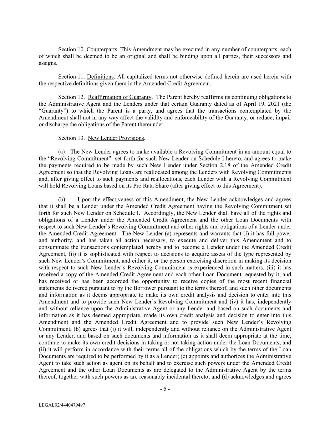 - 5 - LEGAL02/44404794v7 Section 10. Counterparts. This Amendment may be executed in any number of counterparts, each of which shall be deemed to be an original and shall be binding upon all parties, their successors and assigns. Section 11. Definitions. All capitalized terms not otherwise defined herein are used herein with the respective definitions given them in the Amended Credit Agreement. Section 12. Reaffirmation of Guaranty. The Parent hereby reaffirms its continuing obligations to the Administrative Agent and the Lenders under that certain Guaranty dated as of April 19, 2021 (the “Guaranty”) to which the Parent is a party, and agrees that the transactions contemplated by the Amendment shall not in any way affect the validity and enforceability of the Guaranty, or reduce, impair or discharge the obligations of the Parent thereunder. Section 13. New Lender Provisions. (a) The New Lender agrees to make available a Revolving Commitment in an amount equal to the “Revolving Commitment” set forth for such New Lender on Schedule I hereto, and agrees to make the payments required to be made by such New Lender under Section 2.18 of the Amended Credit Agreement so that the Revolving Loans are reallocated among the Lenders with Revolving Commitments and, after giving effect to such payments and reallocations, each Lender with a Revolving Commitment will hold Revolving Loans based on its Pro Rata Share (after giving effect to this Agreement). (b) Upon the effectiveness of this Amendment, the New Lender acknowledges and agrees that it shall be a Lender under the Amended Credit Agreement having the Revolving Commitment set forth for such New Lender on Schedule I. Accordingly, the New Lender shall have all of the rights and obligations of a Lender under the Amended Credit Agreement and the other Loan Documents with respect to such New Lender’s Revolving Commitment and other rights and obligations of a Lender under the Amended Credit Agreement. The New Lender (a) represents and warrants that (i) it has full power and authority, and has taken all action necessary, to execute and deliver this Amendment and to consummate the transactions contemplated hereby and to become a Lender under the Amended Credit Agreement, (ii) it is sophisticated with respect to decisions to acquire assets of the type represented by such New Lender’s Commitment, and either it, or the person exercising discretion in making its decision with respect to such New Lender’s Revolving Commitment is experienced in such matters, (iii) it has received a copy of the Amended Credit Agreement and each other Loan Document requested by it, and has received or has been accorded the opportunity to receive copies of the most recent financial statements delivered pursuant to by the Borrower pursuant to the terms thereof, and such other documents and information as it deems appropriate to make its own credit analysis and decision to enter into this Amendment and to provide such New Lender’s Revolving Commitment and (iv) it has, independently and without reliance upon the Administrative Agent or any Lender and based on such documents and information as it has deemed appropriate, made its own credit analysis and decision to enter into this Amendment and the Amended Credit Agreement and to provide such New Lender’s Revolving Commitment; (b) agrees that (i) it will, independently and without reliance on the Administrative Agent or any Lender, and based on such documents and information as it shall deem appropriate at the time, continue to make its own credit decisions in taking or not taking action under the Loan Documents, and (ii) it will perform in accordance with their terms all of the obligations which by the terms of the Loan Documents are required to be performed by it as a Lender; (c) appoints and authorizes the Administrative Agent to take such action as agent on its behalf and to exercise such powers under the Amended Credit Agreement and the other Loan Documents as are delegated to the Administrative Agent by the terms thereof, together with such powers as are reasonably incidental thereto; and (d) acknowledges and agrees