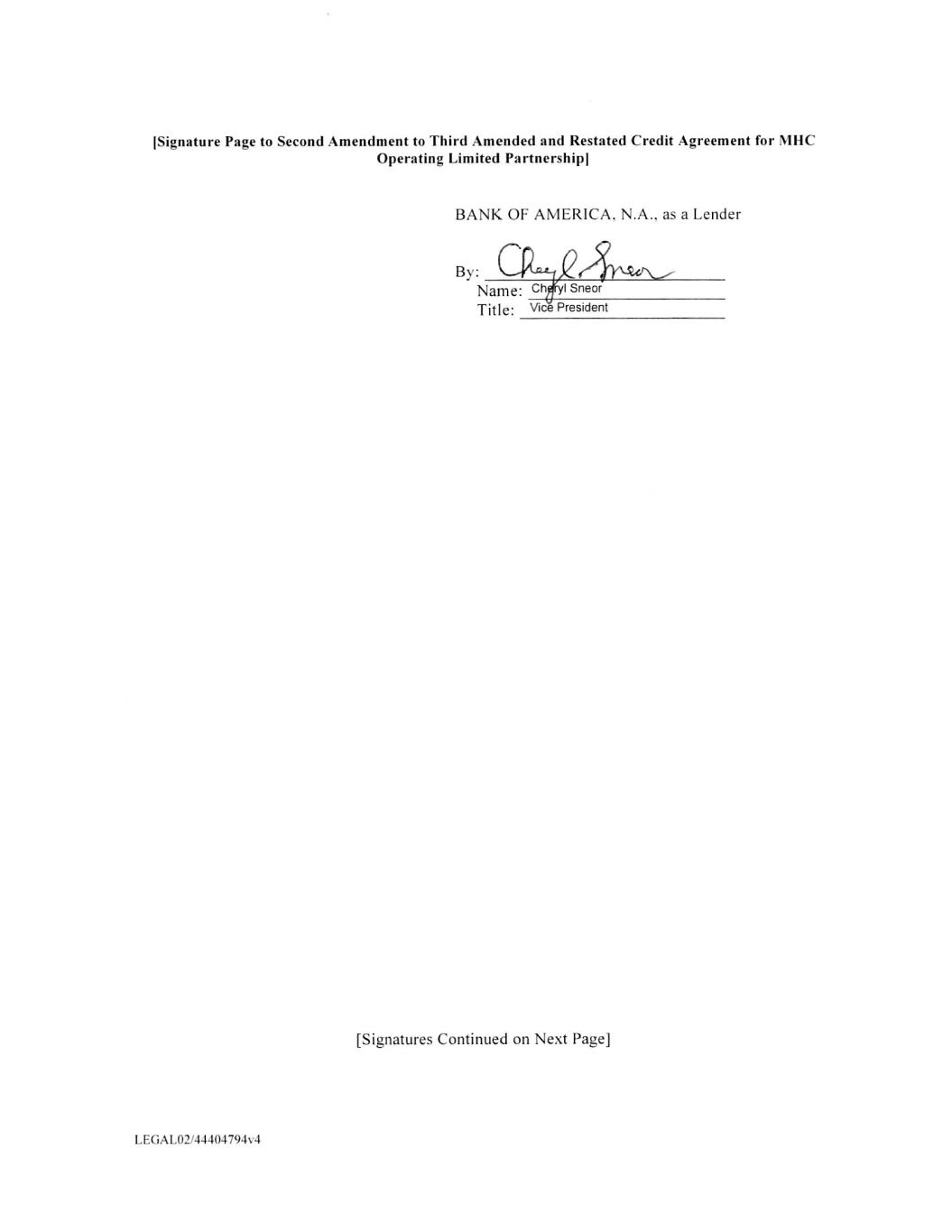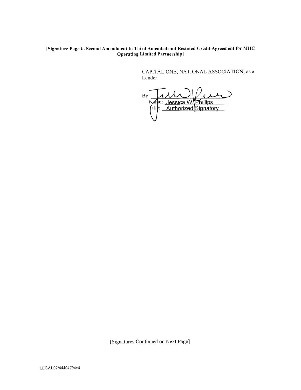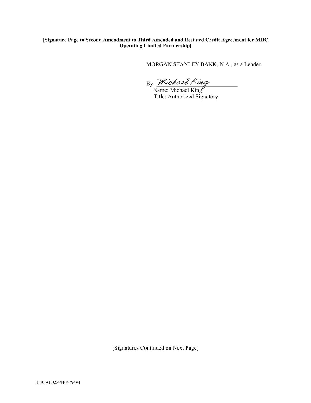 LEGAL02/44404794v4 [Signature Page to Second Amendment to Third Amended and Restated Credit Agreement for MHC Operating Limited Partnership] MORGAN STANLEY BANK, N.A., as a Lender By: ____________________________ Name: Michael King Title: Authorized Signatory [Signatures Continued on Next Page]