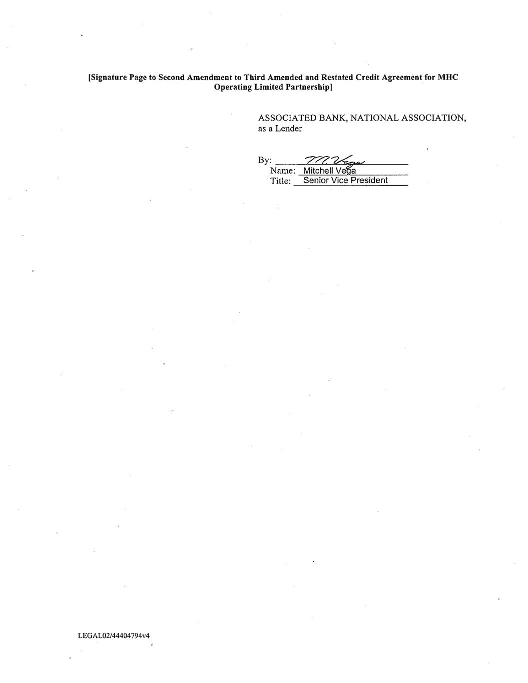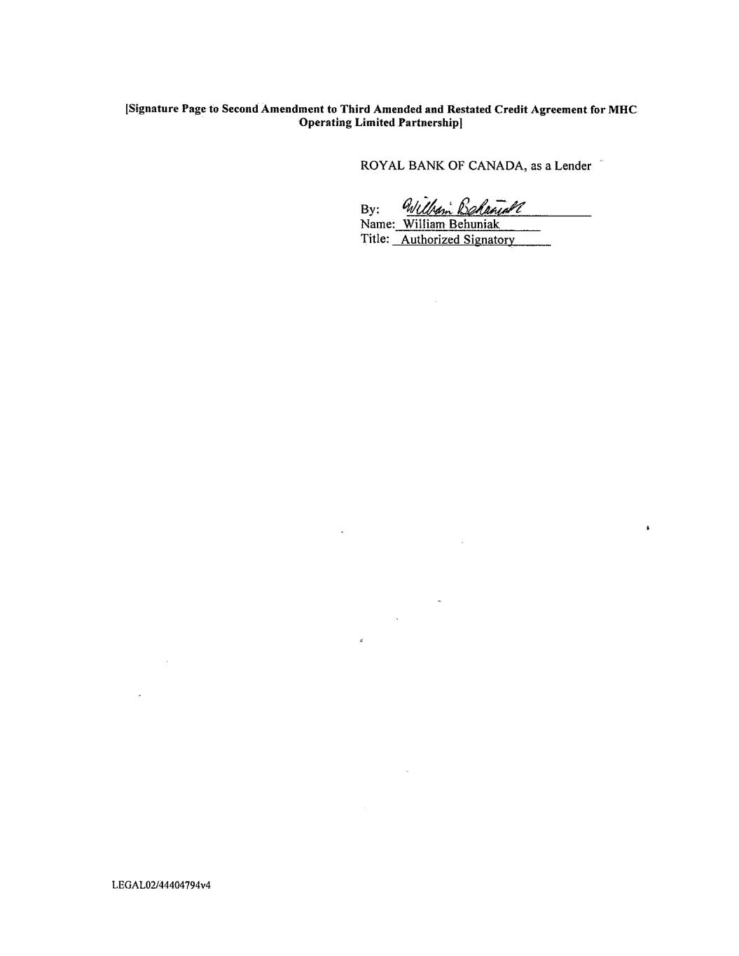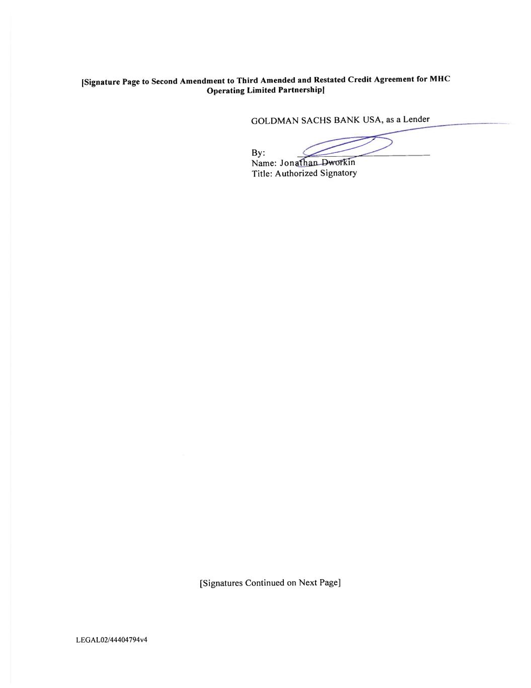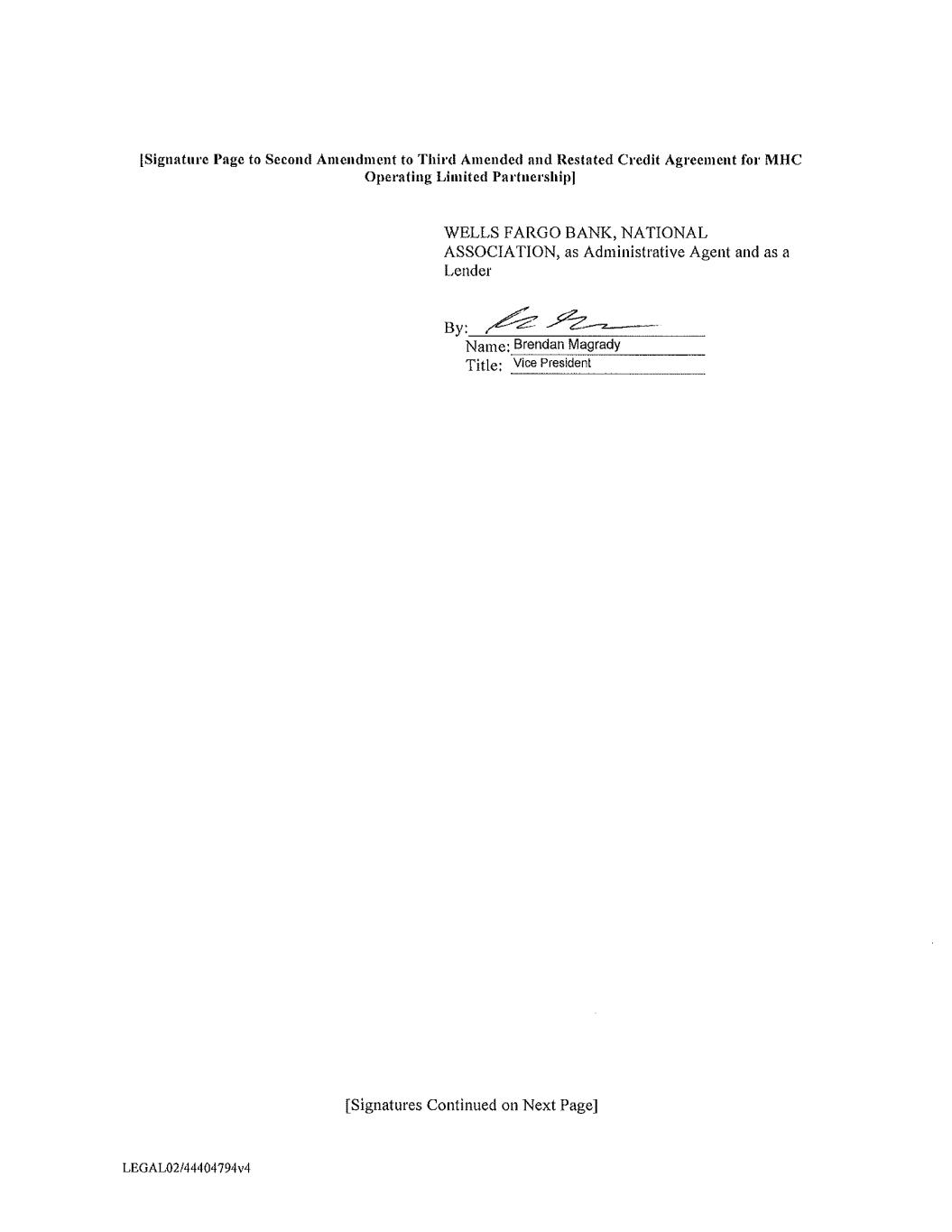 LEGAL02/44404794v4 [Signature Page to Second Amendment to Third Amended and Restated Credit Agreement for MHC Operating Limited Partnership] MORGAN STANLEY BANK, N.A., as a Lender By: ____________________________ Name: Michael King Title: Authorized Signatory [Signatures Continued on Next Page]
