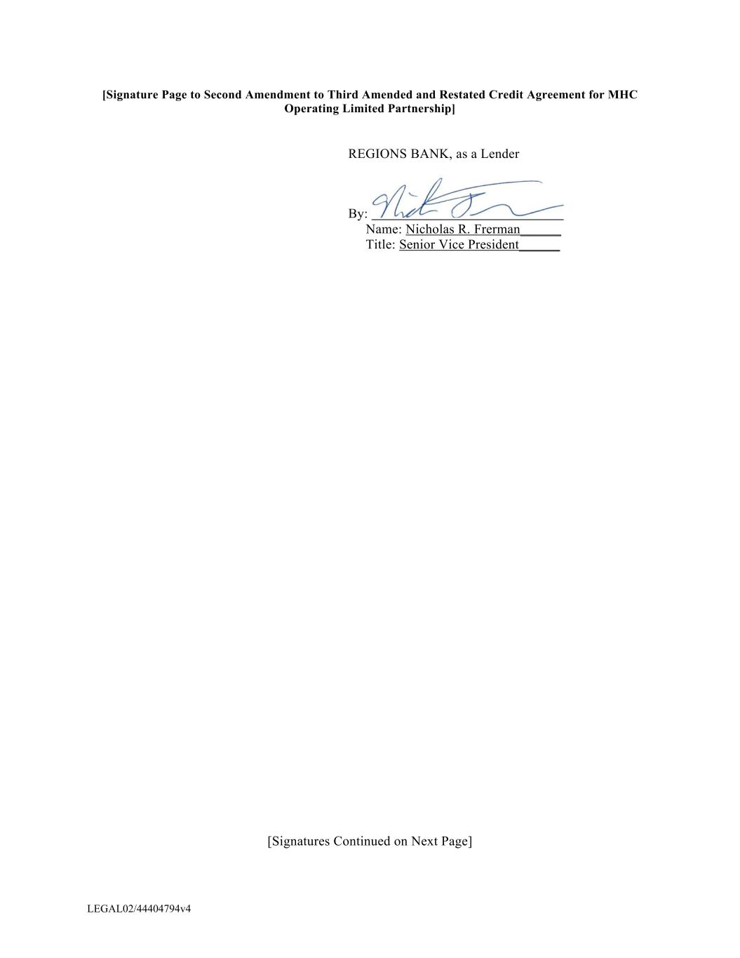 LEGAL02/44404794v4 [Signature Page to Second Amendment to Third Amended and Restated Credit Agreement for MHC Operating Limited Partnership] REGIONS BANK, as a Lender By: Name: Nicholas R. Frerman______ Title: Senior Vice President______ [Signatures Continued on Next Page]