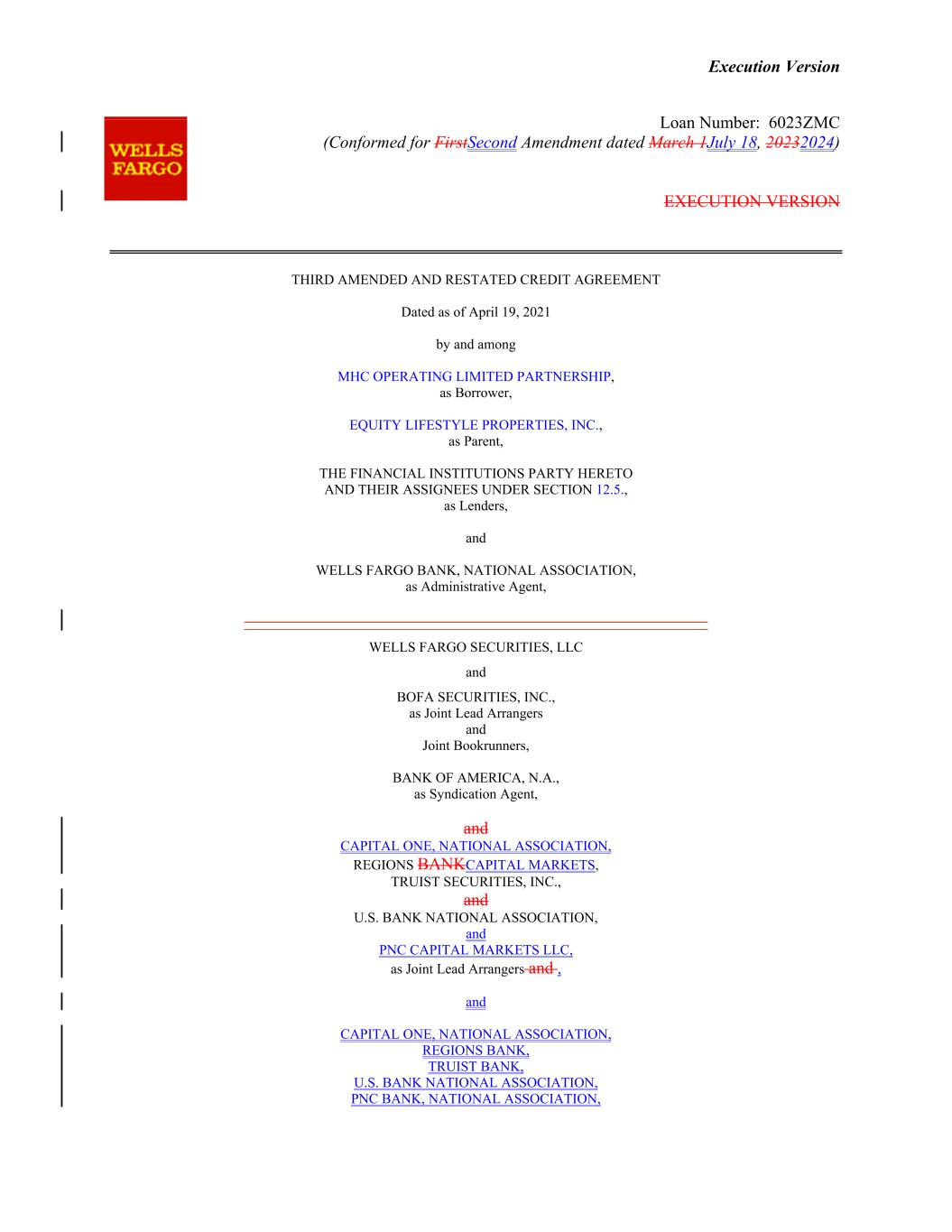 Execution Version Loan Number: 6023ZMC (Conformed for FirstSecond Amendment dated March 1July 18, 20232024) EXECUTION VERSION THIRD AMENDED AND RESTATED CREDIT AGREEMENT Dated as of April 19, 2021 by and among MHC OPERATING LIMITED PARTNERSHIP, as Borrower, EQUITY LIFESTYLE PROPERTIES, INC., as Parent, THE FINANCIAL INSTITUTIONS PARTY HERETO AND THEIR ASSIGNEES UNDER SECTION 12.5., as Lenders, and WELLS FARGO BANK, NATIONAL ASSOCIATION, as Administrative Agent, ______________________________________________________ WELLS FARGO SECURITIES, LLC and BOFA SECURITIES, INC., as Joint Lead Arrangers and Joint Bookrunners, BANK OF AMERICA, N.A., as Syndication Agent, and CAPITAL ONE, NATIONAL ASSOCIATION, REGIONS BANKCAPITAL MARKETS, TRUIST SECURITIES, INC., and U.S. BANK NATIONAL ASSOCIATION, and PNC CAPITAL MARKETS LLC, as Joint Lead Arrangers and , and CAPITAL ONE, NATIONAL ASSOCIATION, REGIONS BANK, TRUIST BANK, U.S. BANK NATIONAL ASSOCIATION, PNC BANK, NATIONAL ASSOCIATION,