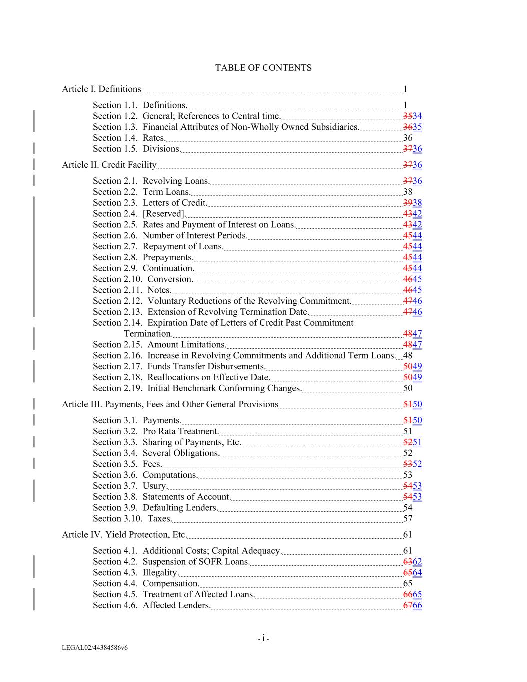 TABLE OF CONTENTS Article I. Definitions 1 Section 1.1. Definitions. 1 Section 1.2. General; References to Central time. 3534 Section 1.3. Financial Attributes of Non-Wholly Owned Subsidiaries. 3635 Section 1.4. Rates. 36 Section 1.5. Divisions. 3736 Article II. Credit Facility 3736 Section 2.1. Revolving Loans. 3736 Section 2.2. Term Loans. 38 Section 2.3. Letters of Credit. 3938 Section 2.4. [Reserved]. 4342 Section 2.5. Rates and Payment of Interest on Loans. 4342 Section 2.6. Number of Interest Periods. 4544 Section 2.7. Repayment of Loans. 4544 Section 2.8. Prepayments. 4544 Section 2.9. Continuation. 4544 Section 2.10. Conversion. 4645 Section 2.11. Notes. 4645 Section 2.12. Voluntary Reductions of the Revolving Commitment. 4746 Section 2.13. Extension of Revolving Termination Date. 4746 Section 2.14. Expiration Date of Letters of Credit Past Commitment Termination. 4847 Section 2.15. Amount Limitations. 4847 Section 2.16. Increase in Revolving Commitments and Additional Term Loans. 48 Section 2.17. Funds Transfer Disbursements. 5049 Section 2.18. Reallocations on Effective Date. 5049 Section 2.19. Initial Benchmark Conforming Changes. 50 Article III. Payments, Fees and Other General Provisions 5150 Section 3.1. Payments. 5150 Section 3.2. Pro Rata Treatment. 51 Section 3.3. Sharing of Payments, Etc. 5251 Section 3.4. Several Obligations. 52 Section 3.5. Fees. 5352 Section 3.6. Computations. 53 Section 3.7. Usury. 5453 Section 3.8. Statements of Account. 5453 Section 3.9. Defaulting Lenders. 54 Section 3.10. Taxes. 57 Article IV. Yield Protection, Etc. 61 Section 4.1. Additional Costs; Capital Adequacy. 61 Section 4.2. Suspension of SOFR Loans. 6362 Section 4.3. Illegality. 6564 Section 4.4. Compensation. 65 Section 4.5. Treatment of Affected Loans. 6665 Section 4.6. Affected Lenders. 6766 - i - LEGAL02/44384586v6