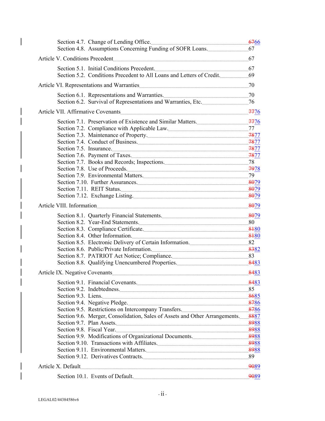 Section 4.7. Change of Lending Office. 6766 Section 4.8. Assumptions Concerning Funding of SOFR Loans. 67 Article V. Conditions Precedent 67 Section 5.1. Initial Conditions Precedent. 67 Section 5.2. Conditions Precedent to All Loans and Letters of Credit. 69 Article VI. Representations and Warranties 70 Section 6.1. Representations and Warranties. 70 Section 6.2. Survival of Representations and Warranties, Etc. 76 Article VII. Affirmative Covenants 7776 Section 7.1. Preservation of Existence and Similar Matters. 7776 Section 7.2. Compliance with Applicable Law. 77 Section 7.3. Maintenance of Property. 7877 Section 7.4. Conduct of Business. 7877 Section 7.5. Insurance. 7877 Section 7.6. Payment of Taxes. 7877 Section 7.7. Books and Records; Inspections. 78 Section 7.8. Use of Proceeds. 7978 Section 7.9. Environmental Matters. 79 Section 7.10. Further Assurances. 8079 Section 7.11. REIT Status. 8079 Section 7.12. Exchange Listing. 8079 Article VIII. Information 8079 Section 8.1. Quarterly Financial Statements. 8079 Section 8.2. Year-End Statements. 80 Section 8.3. Compliance Certificate. 8180 Section 8.4. Other Information. 8180 Section 8.5. Electronic Delivery of Certain Information. 82 Section 8.6. Public/Private Information. 8382 Section 8.7. PATRIOT Act Notice; Compliance. 83 Section 8.8. Qualifying Unencumbered Properties. 8483 Article IX. Negative Covenants 8483 Section 9.1. Financial Covenants. 8483 Section 9.2. Indebtedness. 85 Section 9.3. Liens. 8685 Section 9.4. Negative Pledge. 8786 Section 9.5. Restrictions on Intercompany Transfers. 8786 Section 9.6. Merger, Consolidation, Sales of Assets and Other Arrangements. 8887 Section 9.7. Plan Assets. 8988 Section 9.8. Fiscal Year. 8988 Section 9.9. Modifications of Organizational Documents. 8988 Section 9.10. Transactions with Affiliates. 8988 Section 9.11. Environmental Matters. 8988 Section 9.12. Derivatives Contracts. 89 Article X. Default 9089 Section 10.1. Events of Default. 9089 - ii - LEGAL02/44384586v6