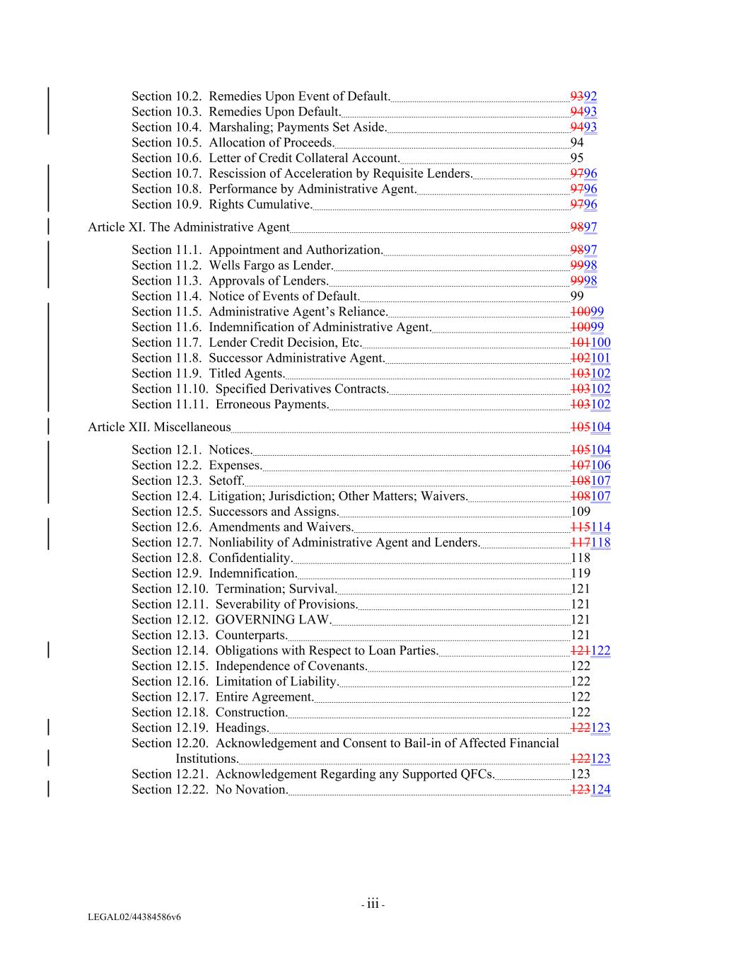 Section 10.2. Remedies Upon Event of Default. 9392 Section 10.3. Remedies Upon Default. 9493 Section 10.4. Marshaling; Payments Set Aside. 9493 Section 10.5. Allocation of Proceeds. 94 Section 10.6. Letter of Credit Collateral Account. 95 Section 10.7. Rescission of Acceleration by Requisite Lenders. 9796 Section 10.8. Performance by Administrative Agent. 9796 Section 10.9. Rights Cumulative. 9796 Article XI. The Administrative Agent 9897 Section 11.1. Appointment and Authorization. 9897 Section 11.2. Wells Fargo as Lender. 9998 Section 11.3. Approvals of Lenders. 9998 Section 11.4. Notice of Events of Default. 99 Section 11.5. Administrative Agent’s Reliance. 10099 Section 11.6. Indemnification of Administrative Agent. 10099 Section 11.7. Lender Credit Decision, Etc. 101100 Section 11.8. Successor Administrative Agent. 102101 Section 11.9. Titled Agents. 103102 Section 11.10. Specified Derivatives Contracts. 103102 Section 11.11. Erroneous Payments. 103102 Article XII. Miscellaneous 105104 Section 12.1. Notices. 105104 Section 12.2. Expenses. 107106 Section 12.3. Setoff. 108107 Section 12.4. Litigation; Jurisdiction; Other Matters; Waivers. 108107 Section 12.5. Successors and Assigns. 109 Section 12.6. Amendments and Waivers. 115114 Section 12.7. Nonliability of Administrative Agent and Lenders. 117118 Section 12.8. Confidentiality. 118 Section 12.9. Indemnification. 119 Section 12.10. Termination; Survival. 121 Section 12.11. Severability of Provisions. 121 Section 12.12. GOVERNING LAW. 121 Section 12.13. Counterparts. 121 Section 12.14. Obligations with Respect to Loan Parties. 121122 Section 12.15. Independence of Covenants. 122 Section 12.16. Limitation of Liability. 122 Section 12.17. Entire Agreement. 122 Section 12.18. Construction. 122 Section 12.19. Headings. 122123 Section 12.20. Acknowledgement and Consent to Bail-in of Affected Financial Institutions. 122123 Section 12.21. Acknowledgement Regarding any Supported QFCs. 123 Section 12.22. No Novation. 123124 - iii - LEGAL02/44384586v6