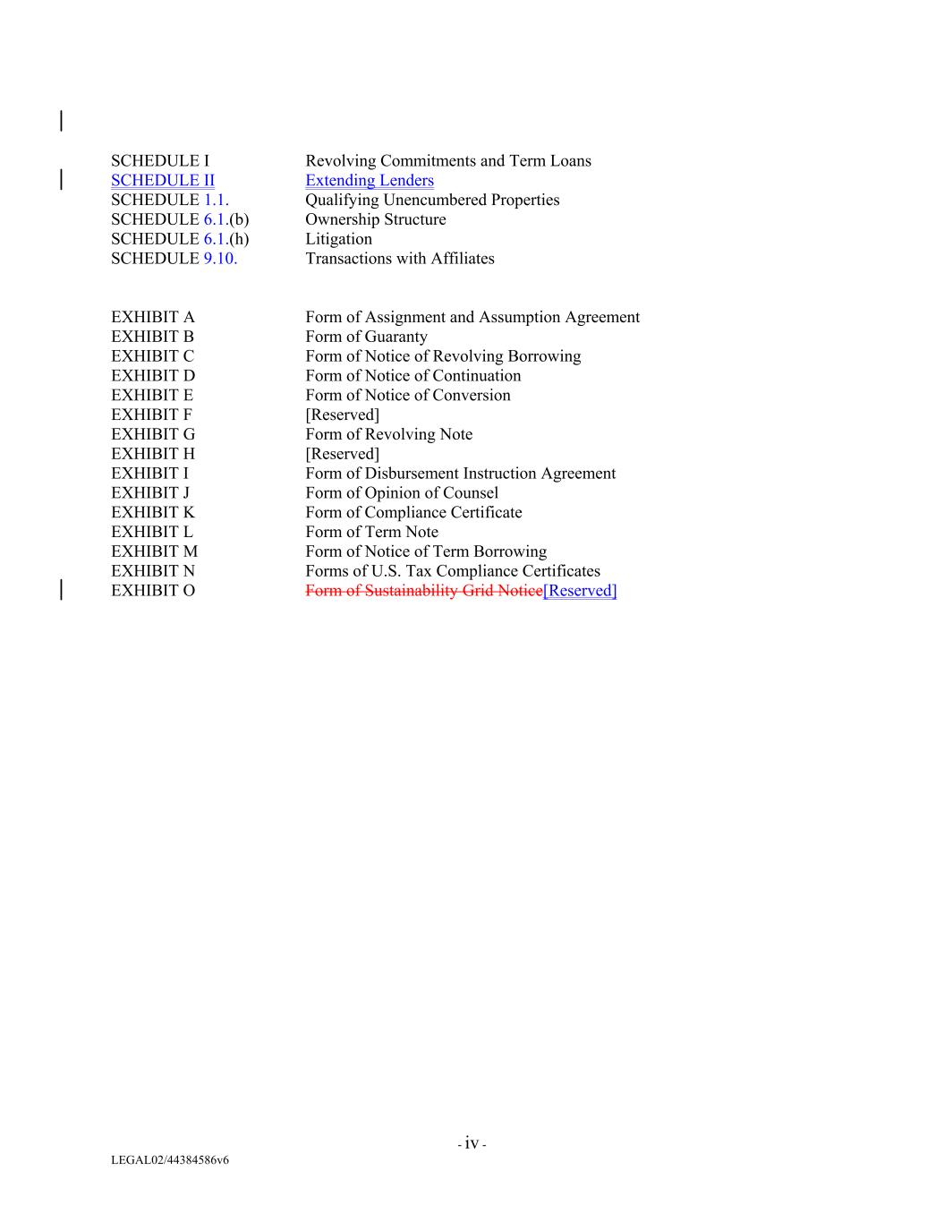 SCHEDULE I Revolving Commitments and Term Loans SCHEDULE II Extending Lenders SCHEDULE 1.1. Qualifying Unencumbered Properties SCHEDULE 6.1.(b) Ownership Structure SCHEDULE 6.1.(h) Litigation SCHEDULE 9.10. Transactions with Affiliates EXHIBIT A Form of Assignment and Assumption Agreement EXHIBIT B Form of Guaranty EXHIBIT C Form of Notice of Revolving Borrowing EXHIBIT D Form of Notice of Continuation EXHIBIT E Form of Notice of Conversion EXHIBIT F [Reserved] EXHIBIT G Form of Revolving Note EXHIBIT H [Reserved] EXHIBIT I Form of Disbursement Instruction Agreement EXHIBIT J Form of Opinion of Counsel EXHIBIT K Form of Compliance Certificate EXHIBIT L Form of Term Note EXHIBIT M Form of Notice of Term Borrowing EXHIBIT N Forms of U.S. Tax Compliance Certificates EXHIBIT O Form of Sustainability Grid Notice[Reserved] - iv - LEGAL02/44384586v6