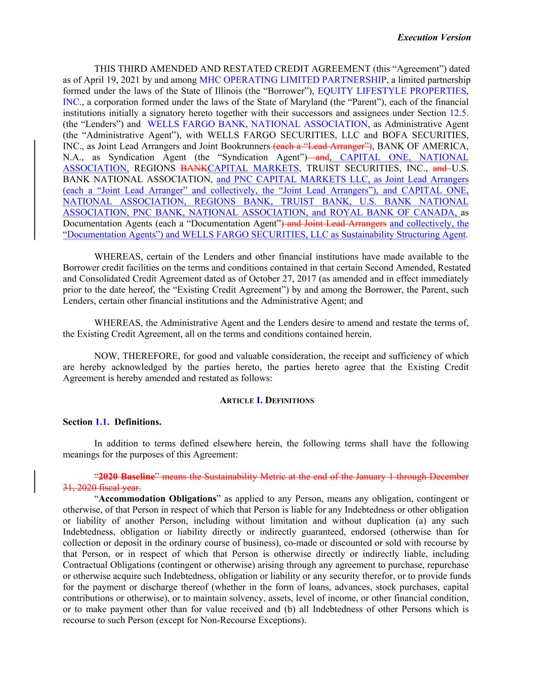 Execution Version THIS THIRD AMENDED AND RESTATED CREDIT AGREEMENT (this “Agreement”) dated as of April 19, 2021 by and among MHC OPERATING LIMITED PARTNERSHIP, a limited partnership formed under the laws of the State of Illinois (the “Borrower”), EQUITY LIFESTYLE PROPERTIES, INC., a corporation formed under the laws of the State of Maryland (the “Parent”), each of the financial institutions initially a signatory hereto together with their successors and assignees under Section 12.5. (the “Lenders”) and WELLS FARGO BANK, NATIONAL ASSOCIATION, as Administrative Agent (the “Administrative Agent”), with WELLS FARGO SECURITIES, LLC and BOFA SECURITIES, INC., as Joint Lead Arrangers and Joint Bookrunners (each a “Lead Arranger”), BANK OF AMERICA, N.A., as Syndication Agent (the “Syndication Agent”) and, CAPITAL ONE, NATIONAL ASSOCIATION, REGIONS BANKCAPITAL MARKETS, TRUIST SECURITIES, INC., and U.S. BANK NATIONAL ASSOCIATION, and PNC CAPITAL MARKETS LLC, as Joint Lead Arrangers (each a “Joint Lead Arranger” and collectively, the “Joint Lead Arrangers”), and CAPITAL ONE, NATIONAL ASSOCIATION, REGIONS BANK, TRUIST BANK, U.S. BANK NATIONAL ASSOCIATION, PNC BANK, NATIONAL ASSOCIATION, and ROYAL BANK OF CANADA, as Documentation Agents (each a “Documentation Agent”) and Joint Lead Arrangers and collectively, the “Documentation Agents”) and WELLS FARGO SECURITIES, LLC as Sustainability Structuring Agent. WHEREAS, certain of the Lenders and other financial institutions have made available to the Borrower credit facilities on the terms and conditions contained in that certain Second Amended, Restated and Consolidated Credit Agreement dated as of October 27, 2017 (as amended and in effect immediately prior to the date hereof, the “Existing Credit Agreement”) by and among the Borrower, the Parent, such Lenders, certain other financial institutions and the Administrative Agent; and WHEREAS, the Administrative Agent and the Lenders desire to amend and restate the terms of, the Existing Credit Agreement, all on the terms and conditions contained herein. NOW, THEREFORE, for good and valuable consideration, the receipt and sufficiency of which are hereby acknowledged by the parties hereto, the parties hereto agree that the Existing Credit Agreement is hereby amended and restated as follows: ARTICLE I. DEFINITIONS Section 1.1. Definitions. In addition to terms defined elsewhere herein, the following terms shall have the following meanings for the purposes of this Agreement: “2020 Baseline” means the Sustainability Metric at the end of the January 1 through December 31, 2020 fiscal year. “Accommodation Obligations” as applied to any Person, means any obligation, contingent or otherwise, of that Person in respect of which that Person is liable for any Indebtedness or other obligation or liability of another Person, including without limitation and without duplication (a) any such Indebtedness, obligation or liability directly or indirectly guaranteed, endorsed (otherwise than for collection or deposit in the ordinary course of business), co-made or discounted or sold with recourse by that Person, or in respect of which that Person is otherwise directly or indirectly liable, including Contractual Obligations (contingent or otherwise) arising through any agreement to purchase, repurchase or otherwise acquire such Indebtedness, obligation or liability or any security therefor, or to provide funds for the payment or discharge thereof (whether in the form of loans, advances, stock purchases, capital contributions or otherwise), or to maintain solvency, assets, level of income, or other financial condition, or to make payment other than for value received and (b) all Indebtedness of other Persons which is recourse to such Person (except for Non-Recourse Exceptions).