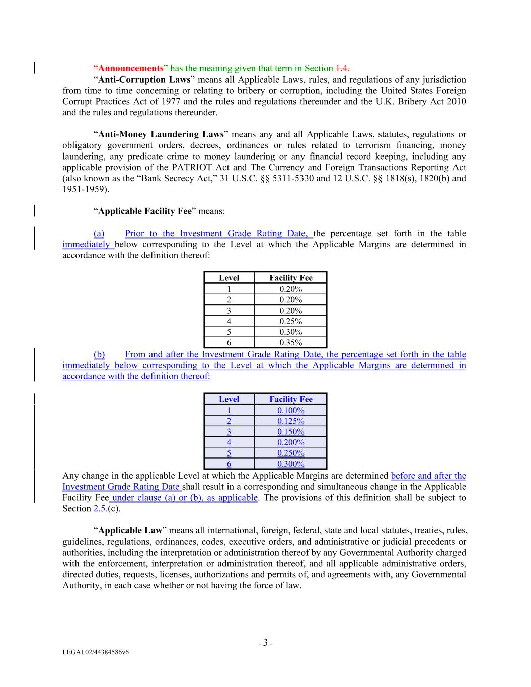 - 3 - LEGAL02/44384586v6 0.35% “Announcements” has the meaning given that term in Section 1.4. “Anti-Corruption Laws” means all Applicable Laws, rules, and regulations of any jurisdiction from time to time concerning or relating to bribery or corruption, including the United States Foreign Corrupt Practices Act of 1977 and the rules and regulations thereunder and the U.K. Bribery Act 2010 and the rules and regulations thereunder. “Anti-Money Laundering Laws” means any and all Applicable Laws, statutes, regulations or obligatory government orders, decrees, ordinances or rules related to terrorism financing, money laundering, any predicate crime to money laundering or any financial record keeping, including any applicable provision of the PATRIOT Act and The Currency and Foreign Transactions Reporting Act (also known as the “Bank Secrecy Act,” 31 U.S.C. §§ 5311-5330 and 12 U.S.C. §§ 1818(s), 1820(b) and 1951-1959). “Applicable Facility Fee” means: (a) Prior to the Investment Grade Rating Date, the percentage set forth in the table immediately below corresponding to the Level at which the Applicable Margins are determined in accordance with the definition thereof: (b) From and after the Investment Grade Rating Date, the percentage set forth in the table immediately below corresponding to the Level at which the Applicable Margins are determined in accordance with the definition thereof: Level Facility Fee 3 1 0.20% 0.100% 1 2 0.125% 4 0.20% 3 0.25% 0.150% Level 4 0.200% 5 5 0.30% 0.250% 2 6 Facility Fee 0.300% 6 Any change in the applicable Level at which the Applicable Margins are determined before and after the Investment Grade Rating Date shall result in a corresponding and simultaneous change in the Applicable Facility Fee under clause (a) or (b), as applicable. The provisions of this definition shall be subject to Section 2.5.(c). “Applicable Law” means all international, foreign, federal, state and local statutes, treaties, rules, guidelines, regulations, ordinances, codes, executive orders, and administrative or judicial precedents or authorities, including the interpretation or administration thereof by any Governmental Authority charged with the enforcement, interpretation or administration thereof, and all applicable administrative orders, directed duties, requests, licenses, authorizations and permits of, and agreements with, any Governmental Authority, in each case whether or not having the force of law. 0.20%