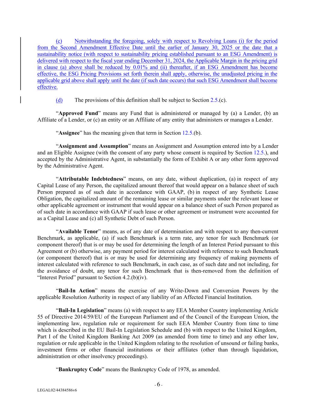 (c) Notwithstanding the foregoing, solely with respect to Revolving Loans (i) for the period from the Second Amendment Effective Date until the earlier of January 30, 2025 or the date that a sustainability notice (with respect to sustainability pricing established pursuant to an ESG Amendment) is delivered with respect to the fiscal year ending December 31, 2024, the Applicable Margin in the pricing grid in clause (a) above shall be reduced by 0.01% and (ii) thereafter, if an ESG Amendment has become effective, the ESG Pricing Provisions set forth therein shall apply, otherwise, the unadjusted pricing in the applicable grid above shall apply until the date (if such date occurs) that such ESG Amendment shall become effective. (d) The provisions of this definition shall be subject to Section 2.5.(c). “Approved Fund” means any Fund that is administered or managed by (a) a Lender, (b) an Affiliate of a Lender, or (c) an entity or an Affiliate of any entity that administers or manages a Lender. “Assignee” has the meaning given that term in Section 12.5.(b). “Assignment and Assumption” means an Assignment and Assumption entered into by a Lender and an Eligible Assignee (with the consent of any party whose consent is required by Section 12.5.), and accepted by the Administrative Agent, in substantially the form of Exhibit A or any other form approved by the Administrative Agent. “Attributable Indebtedness” means, on any date, without duplication, (a) in respect of any Capital Lease of any Person, the capitalized amount thereof that would appear on a balance sheet of such Person prepared as of such date in accordance with GAAP, (b) in respect of any Synthetic Lease Obligation, the capitalized amount of the remaining lease or similar payments under the relevant lease or other applicable agreement or instrument that would appear on a balance sheet of such Person prepared as of such date in accordance with GAAP if such lease or other agreement or instrument were accounted for as a Capital Lease and (c) all Synthetic Debt of such Person. “Available Tenor” means, as of any date of determination and with respect to any then-current Benchmark, as applicable, (a) if such Benchmark is a term rate, any tenor for such Benchmark (or component thereof) that is or may be used for determining the length of an Interest Period pursuant to this Agreement or (b) otherwise, any payment period for interest calculated with reference to such Benchmark (or component thereof) that is or may be used for determining any frequency of making payments of interest calculated with reference to such Benchmark, in each case, as of such date and not including, for the avoidance of doubt, any tenor for such Benchmark that is then-removed from the definition of “Interest Period” pursuant to Section 4.2.(b)(iv). “Bail-In Action” means the exercise of any Write-Down and Conversion Powers by the applicable Resolution Authority in respect of any liability of an Affected Financial Institution. “Bail-In Legislation” means (a) with respect to any EEA Member Country implementing Article 55 of Directive 2014/59/EU of the European Parliament and of the Council of the European Union, the implementing law, regulation rule or requirement for such EEA Member Country from time to time which is described in the EU Bail-In Legislation Schedule and (b) with respect to the United Kingdom, Part I of the United Kingdom Banking Act 2009 (as amended from time to time) and any other law, regulation or rule applicable in the United Kingdom relating to the resolution of unsound or failing banks, investment firms or other financial institutions or their affiliates (other than through liquidation, administration or other insolvency proceedings). “Bankruptcy Code” means the Bankruptcy Code of 1978, as amended. - 6 - LEGAL02/44384586v6