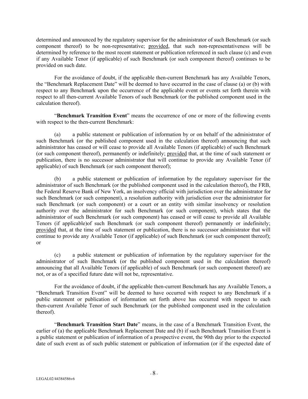 determined and announced by the regulatory supervisor for the administrator of such Benchmark (or such component thereof) to be non-representative; provided, that such non-representativeness will be determined by reference to the most recent statement or publication referenced in such clause (c) and even if any Available Tenor (if applicable) of such Benchmark (or such component thereof) continues to be provided on such date. For the avoidance of doubt, if the applicable then-current Benchmark has any Available Tenors, the “Benchmark Replacement Date” will be deemed to have occurred in the case of clause (a) or (b) with respect to any Benchmark upon the occurrence of the applicable event or events set forth therein with respect to all then-current Available Tenors of such Benchmark (or the published component used in the calculation thereof). “Benchmark Transition Event” means the occurrence of one or more of the following events with respect to the then-current Benchmark: (a) a public statement or publication of information by or on behalf of the administrator of such Benchmark (or the published component used in the calculation thereof) announcing that such administrator has ceased or will cease to provide all Available Tenors (if applicable) of such Benchmark (or such component thereof), permanently or indefinitely; provided that, at the time of such statement or publication, there is no successor administrator that will continue to provide any Available Tenor (if applicable) of such Benchmark (or such component thereof); (b) a public statement or publication of information by the regulatory supervisor for the administrator of such Benchmark (or the published component used in the calculation thereof), the FRB, the Federal Reserve Bank of New York, an insolvency official with jurisdiction over the administrator for such Benchmark (or such component), a resolution authority with jurisdiction over the administrator for such Benchmark (or such component) or a court or an entity with similar insolvency or resolution authority over the administrator for such Benchmark (or such component), which states that the administrator of such Benchmark (or such component) has ceased or will cease to provide all Available Tenors (if applicable)of such Benchmark (or such component thereof) permanently or indefinitely; provided that, at the time of such statement or publication, there is no successor administrator that will continue to provide any Available Tenor (if applicable) of such Benchmark (or such component thereof); or (c) a public statement or publication of information by the regulatory supervisor for the administrator of such Benchmark (or the published component used in the calculation thereof) announcing that all Available Tenors (if applicable) of such Benchmark (or such component thereof) are not, or as of a specified future date will not be, representative. For the avoidance of doubt, if the applicable then-current Benchmark has any Available Tenors, a “Benchmark Transition Event” will be deemed to have occurred with respect to any Benchmark if a public statement or publication of information set forth above has occurred with respect to each then-current Available Tenor of such Benchmark (or the published component used in the calculation thereof). “Benchmark Transition Start Date” means, in the case of a Benchmark Transition Event, the earlier of (a) the applicable Benchmark Replacement Date and (b) if such Benchmark Transition Event is a public statement or publication of information of a prospective event, the 90th day prior to the expected date of such event as of such public statement or publication of information (or if the expected date of - 8 - LEGAL02/44384586v6