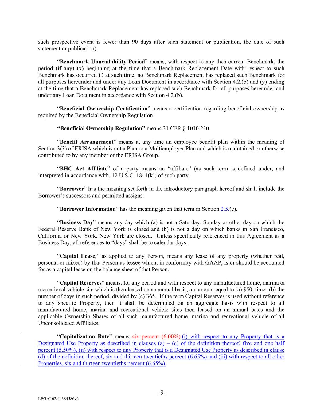 such prospective event is fewer than 90 days after such statement or publication, the date of such statement or publication). “Benchmark Unavailability Period” means, with respect to any then-current Benchmark, the period (if any) (x) beginning at the time that a Benchmark Replacement Date with respect to such Benchmark has occurred if, at such time, no Benchmark Replacement has replaced such Benchmark for all purposes hereunder and under any Loan Document in accordance with Section 4.2.(b) and (y) ending at the time that a Benchmark Replacement has replaced such Benchmark for all purposes hereunder and under any Loan Document in accordance with Section 4.2.(b). “Beneficial Ownership Certification” means a certification regarding beneficial ownership as required by the Beneficial Ownership Regulation. “Beneficial Ownership Regulation” means 31 CFR § 1010.230. “Benefit Arrangement” means at any time an employee benefit plan within the meaning of Section 3(3) of ERISA which is not a Plan or a Multiemployer Plan and which is maintained or otherwise contributed to by any member of the ERISA Group. “BHC Act Affiliate” of a party means an “affiliate” (as such term is defined under, and interpreted in accordance with, 12 U.S.C. 1841(k)) of such party. “Borrower” has the meaning set forth in the introductory paragraph hereof and shall include the Borrower’s successors and permitted assigns. “Borrower Information” has the meaning given that term in Section 2.5.(c). “Business Day” means any day which (a) is not a Saturday, Sunday or other day on which the Federal Reserve Bank of New York is closed and (b) is not a day on which banks in San Francisco, California or New York, New York are closed. Unless specifically referenced in this Agreement as a Business Day, all references to “days” shall be to calendar days. “Capital Lease,” as applied to any Person, means any lease of any property (whether real, personal or mixed) by that Person as lessee which, in conformity with GAAP, is or should be accounted for as a capital lease on the balance sheet of that Person. “Capital Reserves” means, for any period and with respect to any manufactured home, marina or recreational vehicle site which is then leased on an annual basis, an amount equal to (a) $50, times (b) the number of days in such period, divided by (c) 365. If the term Capital Reserves is used without reference to any specific Property, then it shall be determined on an aggregate basis with respect to all manufactured home, marina and recreational vehicle sites then leased on an annual basis and the applicable Ownership Shares of all such manufactured home, marina and recreational vehicle of all Unconsolidated Affiliates. “Capitalization Rate” means six percent (6.00%).(i) with respect to any Property that is a Designated Use Property as described in clauses (a) – (c) of the definition thereof, five and one half percent (5.50%), (ii) with respect to any Property that is a Designated Use Property as described in clause (d) of the definition thereof, six and thirteen twentieths percent (6.65%) and (iii) with respect to all other Properties, six and thirteen twentieths percent (6.65%). - 9 - LEGAL02/44384586v6