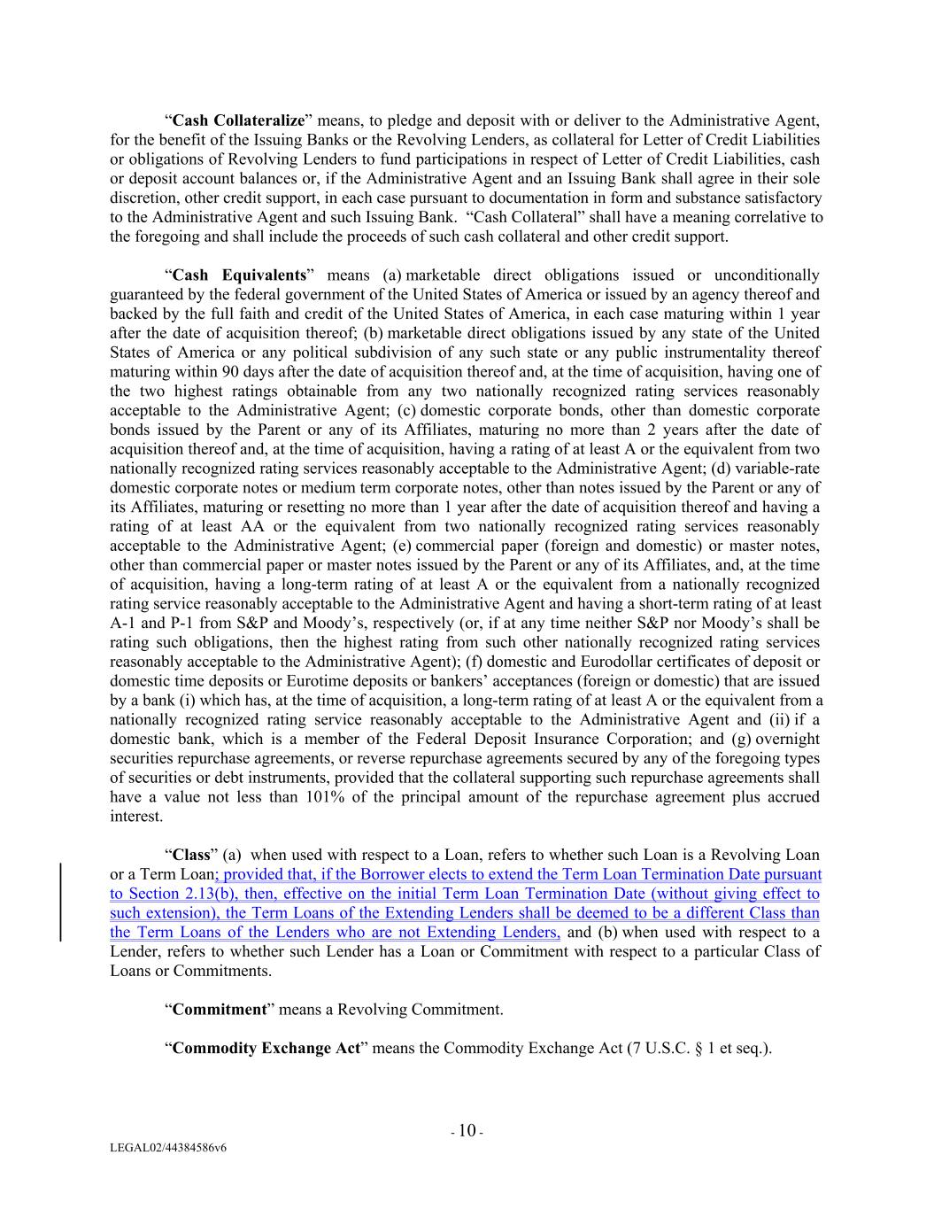 “Cash Collateralize” means, to pledge and deposit with or deliver to the Administrative Agent, for the benefit of the Issuing Banks or the Revolving Lenders, as collateral for Letter of Credit Liabilities or obligations of Revolving Lenders to fund participations in respect of Letter of Credit Liabilities, cash or deposit account balances or, if the Administrative Agent and an Issuing Bank shall agree in their sole discretion, other credit support, in each case pursuant to documentation in form and substance satisfactory to the Administrative Agent and such Issuing Bank. “Cash Collateral” shall have a meaning correlative to the foregoing and shall include the proceeds of such cash collateral and other credit support. “Cash Equivalents” means (a) marketable direct obligations issued or unconditionally guaranteed by the federal government of the United States of America or issued by an agency thereof and backed by the full faith and credit of the United States of America, in each case maturing within 1 year after the date of acquisition thereof; (b) marketable direct obligations issued by any state of the United States of America or any political subdivision of any such state or any public instrumentality thereof maturing within 90 days after the date of acquisition thereof and, at the time of acquisition, having one of the two highest ratings obtainable from any two nationally recognized rating services reasonably acceptable to the Administrative Agent; (c) domestic corporate bonds, other than domestic corporate bonds issued by the Parent or any of its Affiliates, maturing no more than 2 years after the date of acquisition thereof and, at the time of acquisition, having a rating of at least A or the equivalent from two nationally recognized rating services reasonably acceptable to the Administrative Agent; (d) variable-rate domestic corporate notes or medium term corporate notes, other than notes issued by the Parent or any of its Affiliates, maturing or resetting no more than 1 year after the date of acquisition thereof and having a rating of at least AA or the equivalent from two nationally recognized rating services reasonably acceptable to the Administrative Agent; (e) commercial paper (foreign and domestic) or master notes, other than commercial paper or master notes issued by the Parent or any of its Affiliates, and, at the time of acquisition, having a long-term rating of at least A or the equivalent from a nationally recognized rating service reasonably acceptable to the Administrative Agent and having a short-term rating of at least A-1 and P-1 from S&P and Moody’s, respectively (or, if at any time neither S&P nor Moody’s shall be rating such obligations, then the highest rating from such other nationally recognized rating services reasonably acceptable to the Administrative Agent); (f) domestic and Eurodollar certificates of deposit or domestic time deposits or Eurotime deposits or bankers’ acceptances (foreign or domestic) that are issued by a bank (i) which has, at the time of acquisition, a long-term rating of at least A or the equivalent from a nationally recognized rating service reasonably acceptable to the Administrative Agent and (ii) if a domestic bank, which is a member of the Federal Deposit Insurance Corporation; and (g) overnight securities repurchase agreements, or reverse repurchase agreements secured by any of the foregoing types of securities or debt instruments, provided that the collateral supporting such repurchase agreements shall have a value not less than 101% of the principal amount of the repurchase agreement plus accrued interest. “Class” (a) when used with respect to a Loan, refers to whether such Loan is a Revolving Loan or a Term Loan; provided that, if the Borrower elects to extend the Term Loan Termination Date pursuant to Section 2.13(b), then, effective on the initial Term Loan Termination Date (without giving effect to such extension), the Term Loans of the Extending Lenders shall be deemed to be a different Class than the Term Loans of the Lenders who are not Extending Lenders, and (b) when used with respect to a Lender, refers to whether such Lender has a Loan or Commitment with respect to a particular Class of Loans or Commitments. “Commitment” means a Revolving Commitment. “Commodity Exchange Act” means the Commodity Exchange Act (7 U.S.C. § 1 et seq.). - 10 - LEGAL02/44384586v6