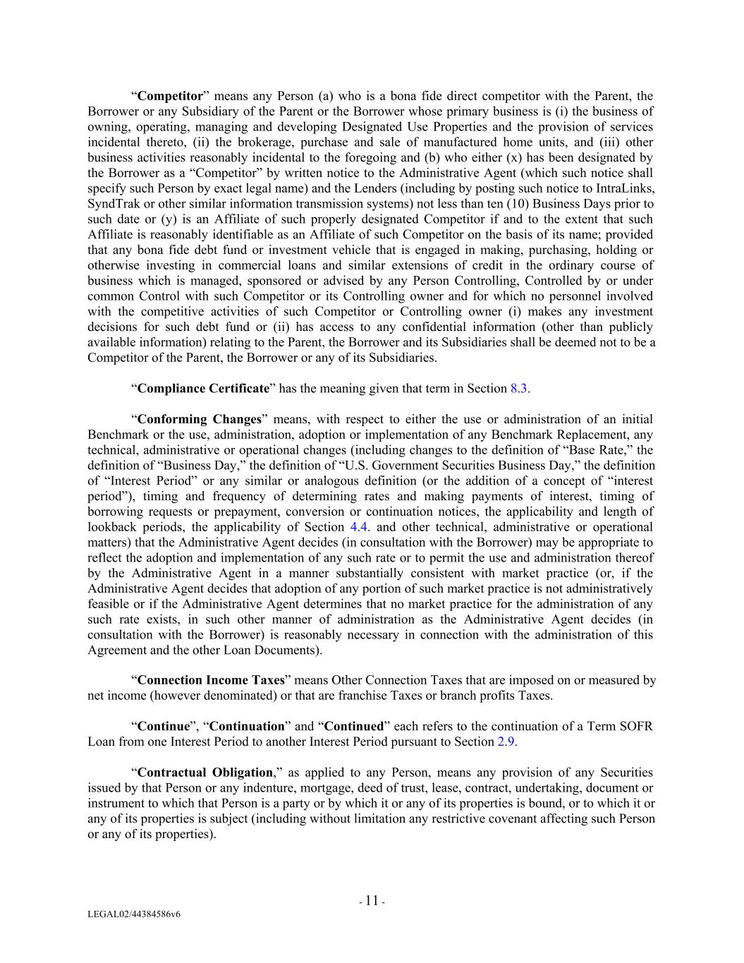 “Competitor” means any Person (a) who is a bona fide direct competitor with the Parent, the Borrower or any Subsidiary of the Parent or the Borrower whose primary business is (i) the business of owning, operating, managing and developing Designated Use Properties and the provision of services incidental thereto, (ii) the brokerage, purchase and sale of manufactured home units, and (iii) other business activities reasonably incidental to the foregoing and (b) who either (x) has been designated by the Borrower as a “Competitor” by written notice to the Administrative Agent (which such notice shall specify such Person by exact legal name) and the Lenders (including by posting such notice to IntraLinks, SyndTrak or other similar information transmission systems) not less than ten (10) Business Days prior to such date or (y) is an Affiliate of such properly designated Competitor if and to the extent that such Affiliate is reasonably identifiable as an Affiliate of such Competitor on the basis of its name; provided that any bona fide debt fund or investment vehicle that is engaged in making, purchasing, holding or otherwise investing in commercial loans and similar extensions of credit in the ordinary course of business which is managed, sponsored or advised by any Person Controlling, Controlled by or under common Control with such Competitor or its Controlling owner and for which no personnel involved with the competitive activities of such Competitor or Controlling owner (i) makes any investment decisions for such debt fund or (ii) has access to any confidential information (other than publicly available information) relating to the Parent, the Borrower and its Subsidiaries shall be deemed not to be a Competitor of the Parent, the Borrower or any of its Subsidiaries. “Compliance Certificate” has the meaning given that term in Section 8.3. “Conforming Changes” means, with respect to either the use or administration of an initial Benchmark or the use, administration, adoption or implementation of any Benchmark Replacement, any technical, administrative or operational changes (including changes to the definition of “Base Rate,” the definition of “Business Day,” the definition of “U.S. Government Securities Business Day,” the definition of “Interest Period” or any similar or analogous definition (or the addition of a concept of “interest period”), timing and frequency of determining rates and making payments of interest, timing of borrowing requests or prepayment, conversion or continuation notices, the applicability and length of lookback periods, the applicability of Section 4.4. and other technical, administrative or operational matters) that the Administrative Agent decides (in consultation with the Borrower) may be appropriate to reflect the adoption and implementation of any such rate or to permit the use and administration thereof by the Administrative Agent in a manner substantially consistent with market practice (or, if the Administrative Agent decides that adoption of any portion of such market practice is not administratively feasible or if the Administrative Agent determines that no market practice for the administration of any such rate exists, in such other manner of administration as the Administrative Agent decides (in consultation with the Borrower) is reasonably necessary in connection with the administration of this Agreement and the other Loan Documents). “Connection Income Taxes” means Other Connection Taxes that are imposed on or measured by net income (however denominated) or that are franchise Taxes or branch profits Taxes. “Continue”, “Continuation” and “Continued” each refers to the continuation of a Term SOFR Loan from one Interest Period to another Interest Period pursuant to Section 2.9. “Contractual Obligation,” as applied to any Person, means any provision of any Securities issued by that Person or any indenture, mortgage, deed of trust, lease, contract, undertaking, document or instrument to which that Person is a party or by which it or any of its properties is bound, or to which it or any of its properties is subject (including without limitation any restrictive covenant affecting such Person or any of its properties). - 11 - LEGAL02/44384586v6