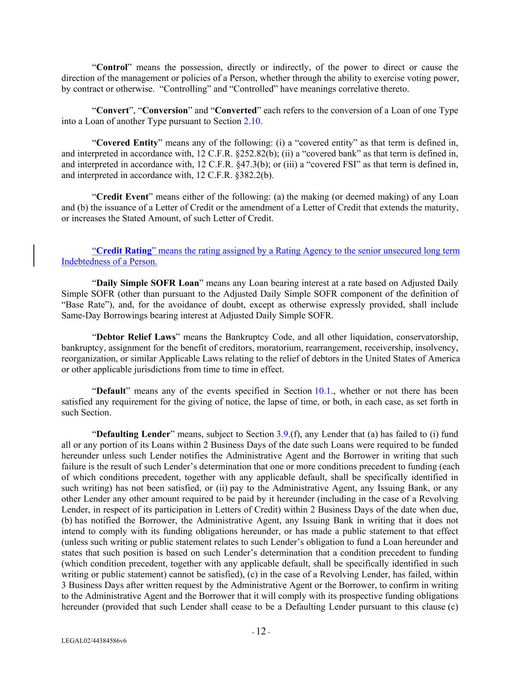 “Control” means the possession, directly or indirectly, of the power to direct or cause the direction of the management or policies of a Person, whether through the ability to exercise voting power, by contract or otherwise. “Controlling” and “Controlled” have meanings correlative thereto. “Convert”, “Conversion” and “Converted” each refers to the conversion of a Loan of one Type into a Loan of another Type pursuant to Section 2.10. “Covered Entity” means any of the following: (i) a “covered entity” as that term is defined in, and interpreted in accordance with, 12 C.F.R. §252.82(b); (ii) a “covered bank” as that term is defined in, and interpreted in accordance with, 12 C.F.R. §47.3(b); or (iii) a “covered FSI” as that term is defined in, and interpreted in accordance with, 12 C.F.R. §382.2(b). “Credit Event” means either of the following: (a) the making (or deemed making) of any Loan and (b) the issuance of a Letter of Credit or the amendment of a Letter of Credit that extends the maturity, or increases the Stated Amount, of such Letter of Credit. “Credit Rating” means the rating assigned by a Rating Agency to the senior unsecured long term Indebtedness of a Person. “Daily Simple SOFR Loan” means any Loan bearing interest at a rate based on Adjusted Daily Simple SOFR (other than pursuant to the Adjusted Daily Simple SOFR component of the definition of “Base Rate”), and, for the avoidance of doubt, except as otherwise expressly provided, shall include Same-Day Borrowings bearing interest at Adjusted Daily Simple SOFR. “Debtor Relief Laws” means the Bankruptcy Code, and all other liquidation, conservatorship, bankruptcy, assignment for the benefit of creditors, moratorium, rearrangement, receivership, insolvency, reorganization, or similar Applicable Laws relating to the relief of debtors in the United States of America or other applicable jurisdictions from time to time in effect. “Default” means any of the events specified in Section 10.1., whether or not there has been satisfied any requirement for the giving of notice, the lapse of time, or both, in each case, as set forth in such Section. “Defaulting Lender” means, subject to Section 3.9.(f), any Lender that (a) has failed to (i) fund all or any portion of its Loans within 2 Business Days of the date such Loans were required to be funded hereunder unless such Lender notifies the Administrative Agent and the Borrower in writing that such failure is the result of such Lender’s determination that one or more conditions precedent to funding (each of which conditions precedent, together with any applicable default, shall be specifically identified in such writing) has not been satisfied, or (ii) pay to the Administrative Agent, any Issuing Bank, or any other Lender any other amount required to be paid by it hereunder (including in the case of a Revolving Lender, in respect of its participation in Letters of Credit) within 2 Business Days of the date when due, (b) has notified the Borrower, the Administrative Agent, any Issuing Bank in writing that it does not intend to comply with its funding obligations hereunder, or has made a public statement to that effect (unless such writing or public statement relates to such Lender’s obligation to fund a Loan hereunder and states that such position is based on such Lender’s determination that a condition precedent to funding (which condition precedent, together with any applicable default, shall be specifically identified in such writing or public statement) cannot be satisfied), (c) in the case of a Revolving Lender, has failed, within 3 Business Days after written request by the Administrative Agent or the Borrower, to confirm in writing to the Administrative Agent and the Borrower that it will comply with its prospective funding obligations hereunder (provided that such Lender shall cease to be a Defaulting Lender pursuant to this clause (c) - 12 - LEGAL02/44384586v6