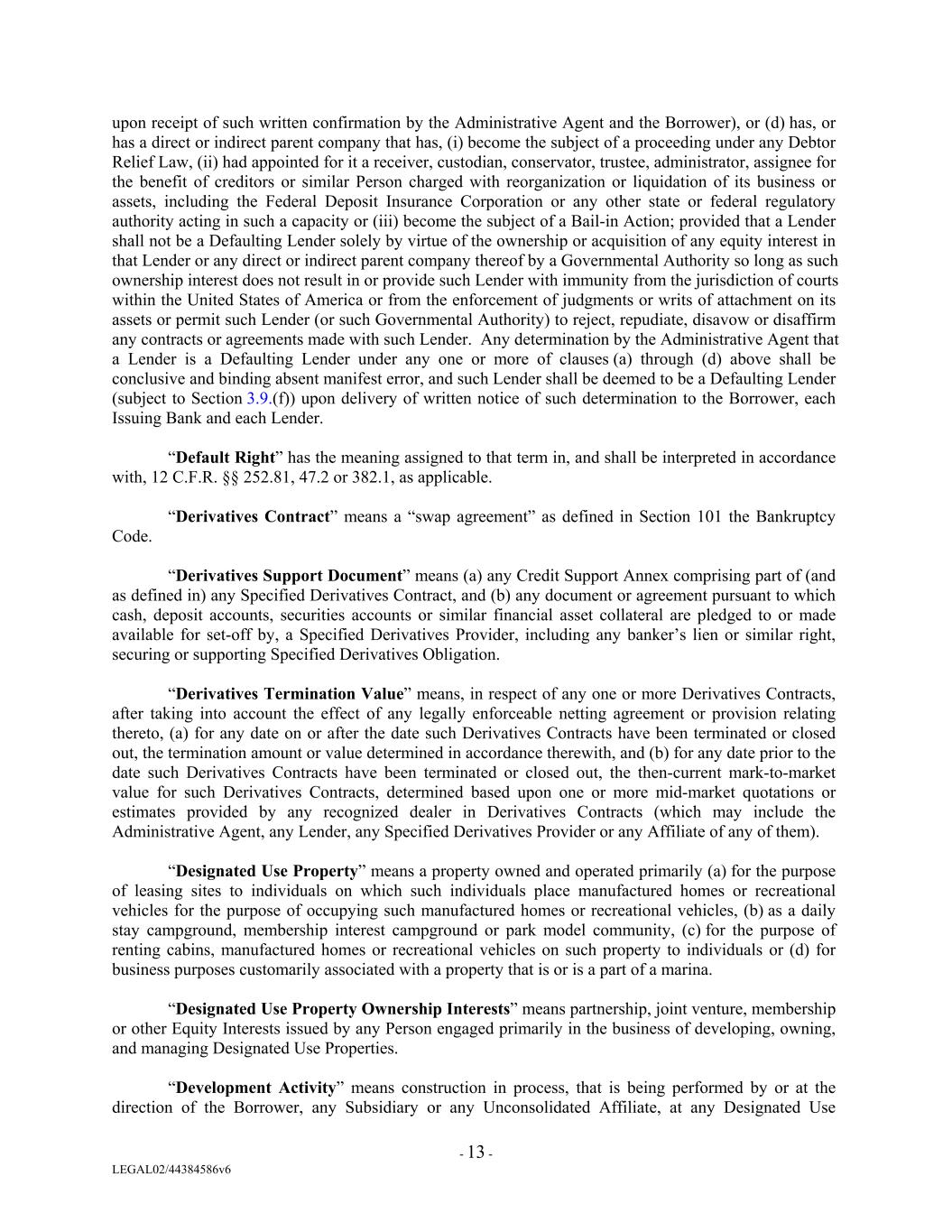 upon receipt of such written confirmation by the Administrative Agent and the Borrower), or (d) has, or has a direct or indirect parent company that has, (i) become the subject of a proceeding under any Debtor Relief Law, (ii) had appointed for it a receiver, custodian, conservator, trustee, administrator, assignee for the benefit of creditors or similar Person charged with reorganization or liquidation of its business or assets, including the Federal Deposit Insurance Corporation or any other state or federal regulatory authority acting in such a capacity or (iii) become the subject of a Bail-in Action; provided that a Lender shall not be a Defaulting Lender solely by virtue of the ownership or acquisition of any equity interest in that Lender or any direct or indirect parent company thereof by a Governmental Authority so long as such ownership interest does not result in or provide such Lender with immunity from the jurisdiction of courts within the United States of America or from the enforcement of judgments or writs of attachment on its assets or permit such Lender (or such Governmental Authority) to reject, repudiate, disavow or disaffirm any contracts or agreements made with such Lender. Any determination by the Administrative Agent that a Lender is a Defaulting Lender under any one or more of clauses (a) through (d) above shall be conclusive and binding absent manifest error, and such Lender shall be deemed to be a Defaulting Lender (subject to Section 3.9.(f)) upon delivery of written notice of such determination to the Borrower, each Issuing Bank and each Lender. “Default Right” has the meaning assigned to that term in, and shall be interpreted in accordance with, 12 C.F.R. §§ 252.81, 47.2 or 382.1, as applicable. “Derivatives Contract” means a “swap agreement” as defined in Section 101 the Bankruptcy Code. “Derivatives Support Document” means (a) any Credit Support Annex comprising part of (and as defined in) any Specified Derivatives Contract, and (b) any document or agreement pursuant to which cash, deposit accounts, securities accounts or similar financial asset collateral are pledged to or made available for set-off by, a Specified Derivatives Provider, including any banker’s lien or similar right, securing or supporting Specified Derivatives Obligation. “Derivatives Termination Value” means, in respect of any one or more Derivatives Contracts, after taking into account the effect of any legally enforceable netting agreement or provision relating thereto, (a) for any date on or after the date such Derivatives Contracts have been terminated or closed out, the termination amount or value determined in accordance therewith, and (b) for any date prior to the date such Derivatives Contracts have been terminated or closed out, the then-current mark-to-market value for such Derivatives Contracts, determined based upon one or more mid-market quotations or estimates provided by any recognized dealer in Derivatives Contracts (which may include the Administrative Agent, any Lender, any Specified Derivatives Provider or any Affiliate of any of them). “Designated Use Property” means a property owned and operated primarily (a) for the purpose of leasing sites to individuals on which such individuals place manufactured homes or recreational vehicles for the purpose of occupying such manufactured homes or recreational vehicles, (b) as a daily stay campground, membership interest campground or park model community, (c) for the purpose of renting cabins, manufactured homes or recreational vehicles on such property to individuals or (d) for business purposes customarily associated with a property that is or is a part of a marina. “Designated Use Property Ownership Interests” means partnership, joint venture, membership or other Equity Interests issued by any Person engaged primarily in the business of developing, owning, and managing Designated Use Properties. “Development Activity” means construction in process, that is being performed by or at the direction of the Borrower, any Subsidiary or any Unconsolidated Affiliate, at any Designated Use - 13 - LEGAL02/44384586v6