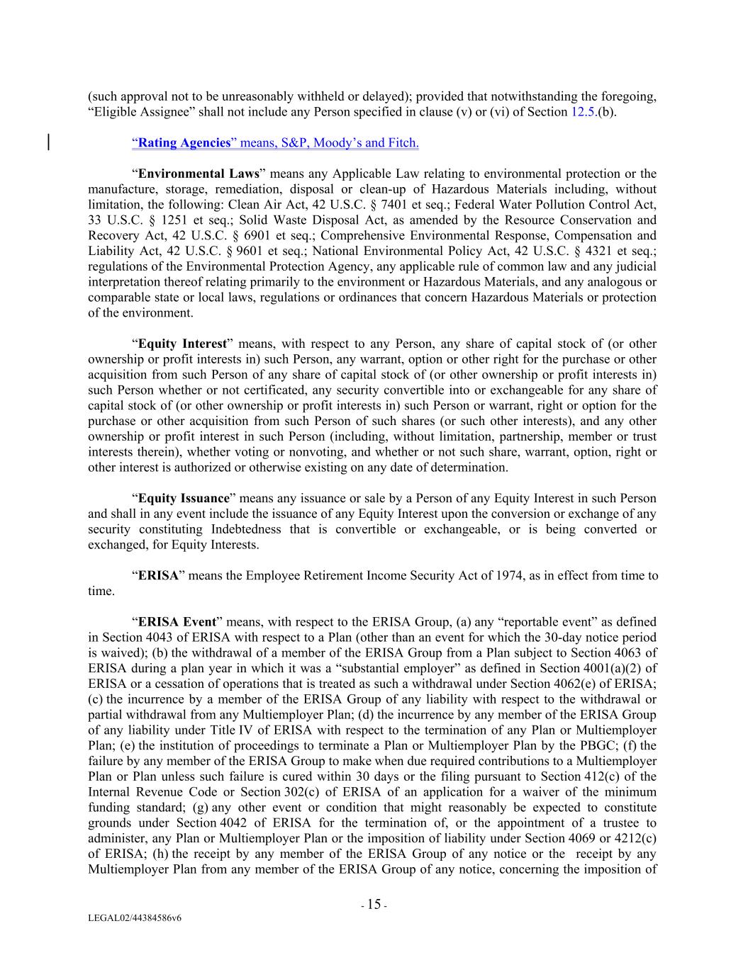 (such approval not to be unreasonably withheld or delayed); provided that notwithstanding the foregoing, “Eligible Assignee” shall not include any Person specified in clause (v) or (vi) of Section 12.5.(b). “Rating Agencies” means, S&P, Moody’s and Fitch. “Environmental Laws” means any Applicable Law relating to environmental protection or the manufacture, storage, remediation, disposal or clean-up of Hazardous Materials including, without limitation, the following: Clean Air Act, 42 U.S.C. § 7401 et seq.; Federal Water Pollution Control Act, 33 U.S.C. § 1251 et seq.; Solid Waste Disposal Act, as amended by the Resource Conservation and Recovery Act, 42 U.S.C. § 6901 et seq.; Comprehensive Environmental Response, Compensation and Liability Act, 42 U.S.C. § 9601 et seq.; National Environmental Policy Act, 42 U.S.C. § 4321 et seq.; regulations of the Environmental Protection Agency, any applicable rule of common law and any judicial interpretation thereof relating primarily to the environment or Hazardous Materials, and any analogous or comparable state or local laws, regulations or ordinances that concern Hazardous Materials or protection of the environment. “Equity Interest” means, with respect to any Person, any share of capital stock of (or other ownership or profit interests in) such Person, any warrant, option or other right for the purchase or other acquisition from such Person of any share of capital stock of (or other ownership or profit interests in) such Person whether or not certificated, any security convertible into or exchangeable for any share of capital stock of (or other ownership or profit interests in) such Person or warrant, right or option for the purchase or other acquisition from such Person of such shares (or such other interests), and any other ownership or profit interest in such Person (including, without limitation, partnership, member or trust interests therein), whether voting or nonvoting, and whether or not such share, warrant, option, right or other interest is authorized or otherwise existing on any date of determination. “Equity Issuance” means any issuance or sale by a Person of any Equity Interest in such Person and shall in any event include the issuance of any Equity Interest upon the conversion or exchange of any security constituting Indebtedness that is convertible or exchangeable, or is being converted or exchanged, for Equity Interests. “ERISA” means the Employee Retirement Income Security Act of 1974, as in effect from time to time. “ERISA Event” means, with respect to the ERISA Group, (a) any “reportable event” as defined in Section 4043 of ERISA with respect to a Plan (other than an event for which the 30-day notice period is waived); (b) the withdrawal of a member of the ERISA Group from a Plan subject to Section 4063 of ERISA during a plan year in which it was a “substantial employer” as defined in Section 4001(a)(2) of ERISA or a cessation of operations that is treated as such a withdrawal under Section 4062(e) of ERISA; (c) the incurrence by a member of the ERISA Group of any liability with respect to the withdrawal or partial withdrawal from any Multiemployer Plan; (d) the incurrence by any member of the ERISA Group of any liability under Title IV of ERISA with respect to the termination of any Plan or Multiemployer Plan; (e) the institution of proceedings to terminate a Plan or Multiemployer Plan by the PBGC; (f) the failure by any member of the ERISA Group to make when due required contributions to a Multiemployer Plan or Plan unless such failure is cured within 30 days or the filing pursuant to Section 412(c) of the Internal Revenue Code or Section 302(c) of ERISA of an application for a waiver of the minimum funding standard; (g) any other event or condition that might reasonably be expected to constitute grounds under Section 4042 of ERISA for the termination of, or the appointment of a trustee to administer, any Plan or Multiemployer Plan or the imposition of liability under Section 4069 or 4212(c) of ERISA; (h) the receipt by any member of the ERISA Group of any notice or the receipt by any Multiemployer Plan from any member of the ERISA Group of any notice, concerning the imposition of - 15 - LEGAL02/44384586v6
