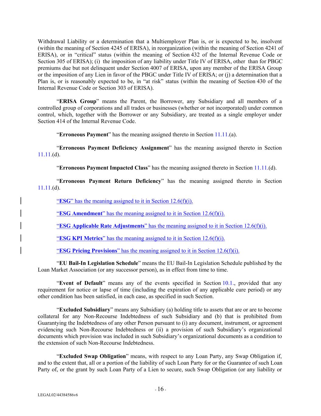 Withdrawal Liability or a determination that a Multiemployer Plan is, or is expected to be, insolvent (within the meaning of Section 4245 of ERISA), in reorganization (within the meaning of Section 4241 of ERISA), or in “critical” status (within the meaning of Section 432 of the Internal Revenue Code or Section 305 of ERISA); (i) the imposition of any liability under Title IV of ERISA, other than for PBGC premiums due but not delinquent under Section 4007 of ERISA, upon any member of the ERISA Group or the imposition of any Lien in favor of the PBGC under Title IV of ERISA; or (j) a determination that a Plan is, or is reasonably expected to be, in “at risk” status (within the meaning of Section 430 of the Internal Revenue Code or Section 303 of ERISA). “ERISA Group” means the Parent, the Borrower, any Subsidiary and all members of a controlled group of corporations and all trades or businesses (whether or not incorporated) under common control, which, together with the Borrower or any Subsidiary, are treated as a single employer under Section 414 of the Internal Revenue Code. “Erroneous Payment” has the meaning assigned thereto in Section 11.11.(a). “Erroneous Payment Deficiency Assignment” has the meaning assigned thereto in Section 11.11.(d). “Erroneous Payment Impacted Class” has the meaning assigned thereto in Section 11.11.(d). “Erroneous Payment Return Deficiency” has the meaning assigned thereto in Section 11.11.(d). “ESG” has the meaning assigned to it in Section 12.6(f)(i). “ESG Amendment” has the meaning assigned to it in Section 12.6(f)(i). “ESG Applicable Rate Adjustments” has the meaning assigned to it in Section 12.6(f)(i). “ESG KPI Metrics” has the meaning assigned to it in Section 12.6(f)(i). “ESG Pricing Provisions” has the meaning assigned to it in Section 12.6(f)(i). “EU Bail-In Legislation Schedule” means the EU Bail-In Legislation Schedule published by the Loan Market Association (or any successor person), as in effect from time to time. “Event of Default” means any of the events specified in Section 10.1., provided that any requirement for notice or lapse of time (including the expiration of any applicable cure period) or any other condition has been satisfied, in each case, as specified in such Section. “Excluded Subsidiary” means any Subsidiary (a) holding title to assets that are or are to become collateral for any Non-Recourse Indebtedness of such Subsidiary and (b) that is prohibited from Guarantying the Indebtedness of any other Person pursuant to (i) any document, instrument, or agreement evidencing such Non-Recourse Indebtedness or (ii) a provision of such Subsidiary’s organizational documents which provision was included in such Subsidiary’s organizational documents as a condition to the extension of such Non-Recourse Indebtedness. “Excluded Swap Obligation” means, with respect to any Loan Party, any Swap Obligation if, and to the extent that, all or a portion of the liability of such Loan Party for or the Guarantee of such Loan Party of, or the grant by such Loan Party of a Lien to secure, such Swap Obligation (or any liability or - 16 - LEGAL02/44384586v6